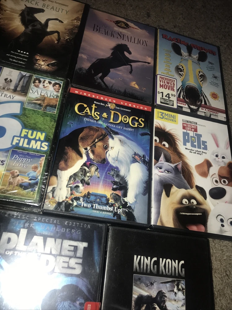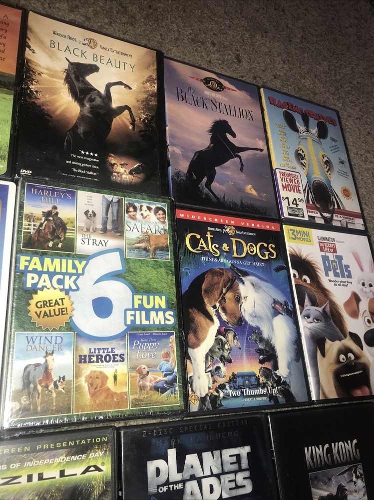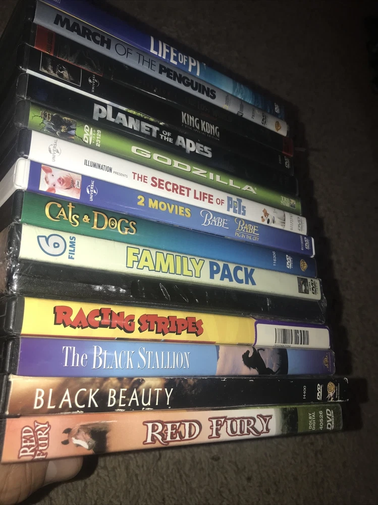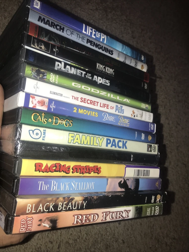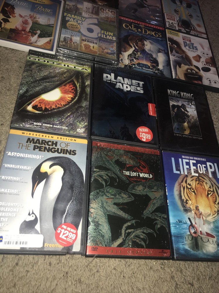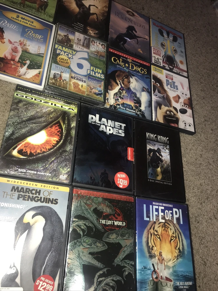 Huge animal themed Dvd lot 15 + DVDs. Titles include: Life of Pi March of the penguins Jurassic park the lost world King kong Planet of the apes Godzilla The secret life of pets Babe BAbe pig in the city Cats & dogs Harleys hill The stray Hollywood safari Wind dancer Little heroes More than puppy love The gift Askari Too enders Secret of the Andes Rabbit-proof fence Peter & Pompey Racing stripes The black stallion Black beauty Red fury Great DVDs for animals or humans who love animals. Horses dogs cats apes penguins and more. Shipped with USPS ASAP . Thanks for looking! ππ₯πΊπΈπ T h a n k s f o r l o o k i n g ! ππΌπ₯πΊπΈπ