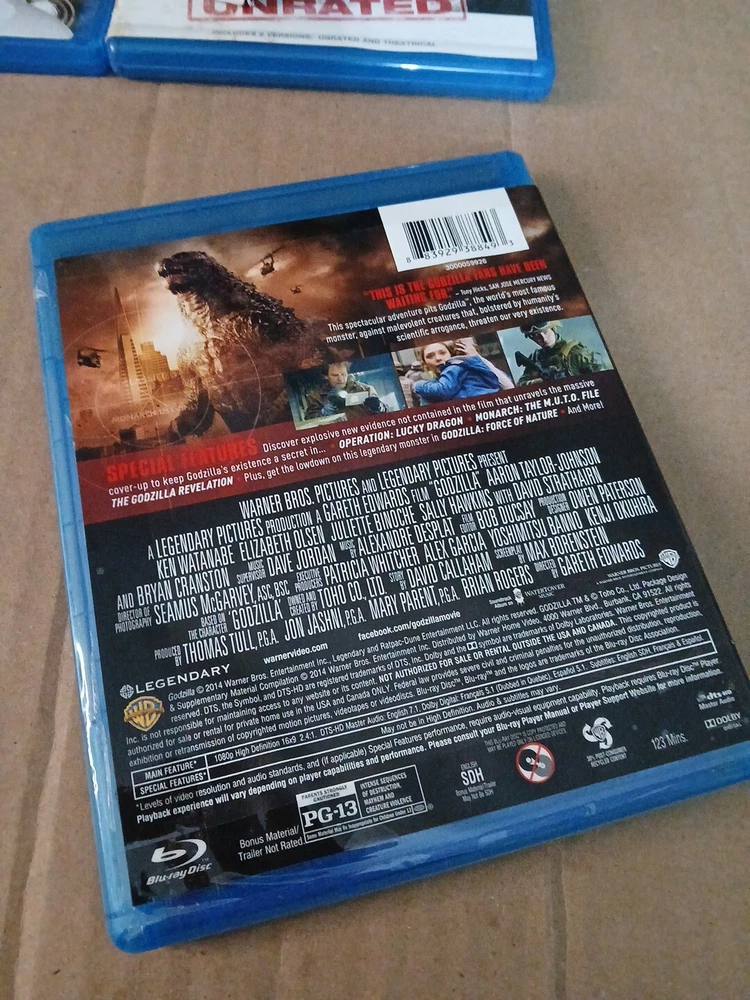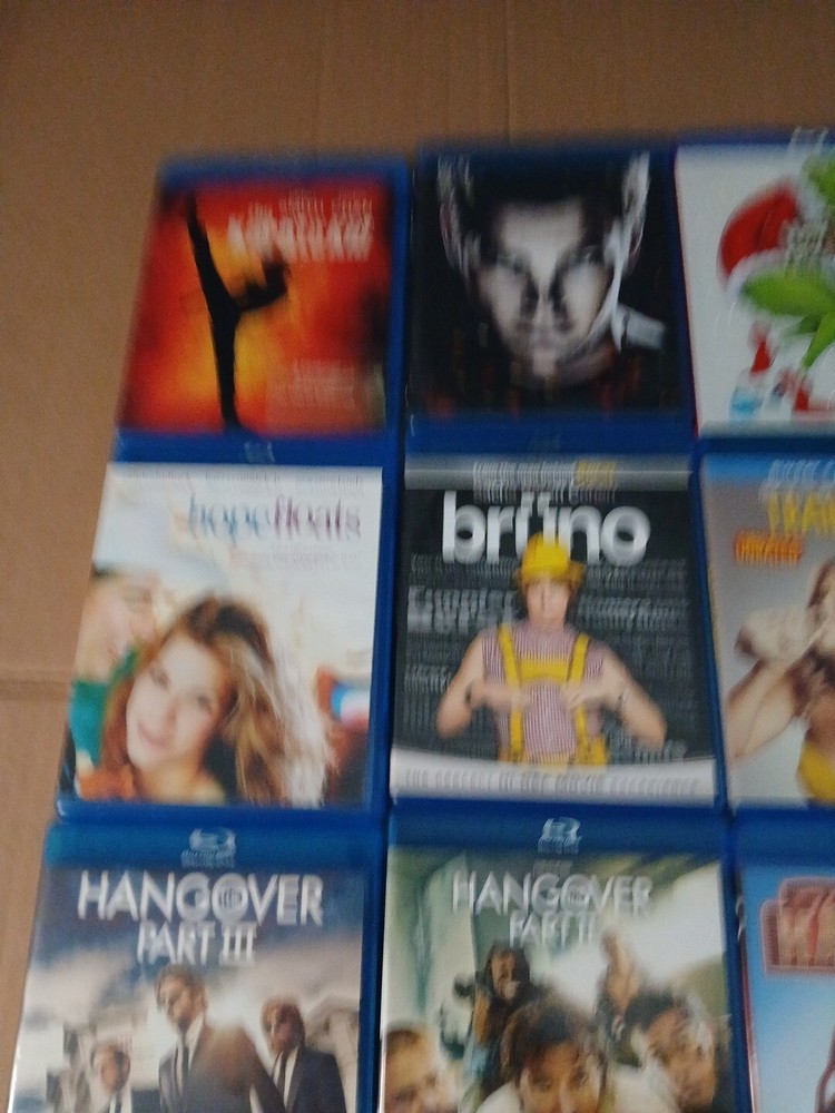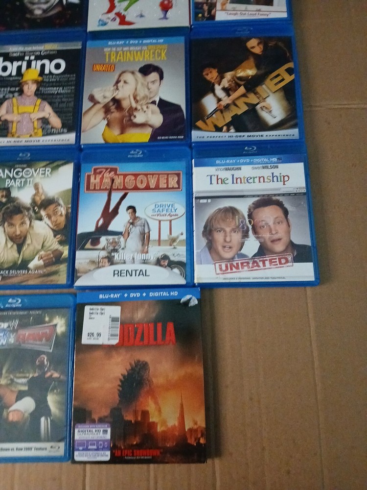 15 blu rays. Good condition a couple may have some light scratches overall good condition. Godzilla insert is taped to case. Karate kid Star trek Grinch stole Christmas This is 40 Hope floats Bruno Train wreck Wanted Hangover 1 2 3 The internship Star trek into darkness Best of smackdown Godzilla