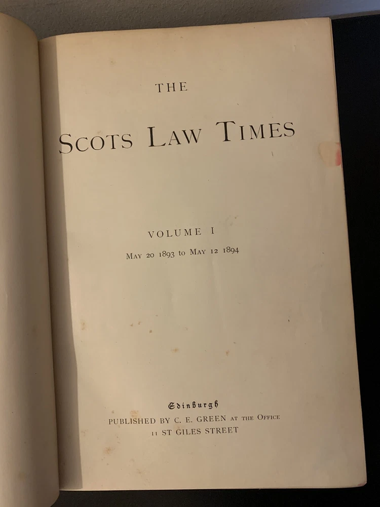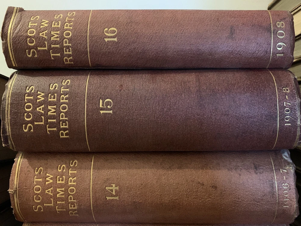 16 x Volumes Scot Law Times Reports (1893-1908), Leather Bound, C.E. Green. Good condition. Cover page and pages are all in tact. Some may have minor sign of page’s ageing mainly on the front and last pages. Some may have stamp on the first pages. May have some usual wear and tear. Volume 1 has minor tear at the top of the binder, volume 11 also has a more noticeable tear (as shown in photos). Will benefit from a wipe. Overall, a beautiful collection. Total estimated weight 43.9kg Also selling individually @ £70 per volume + £5.39 postage and packaging. I have other Scots Law Times/Reports, please see my other listings). Please message me for further enquiries.