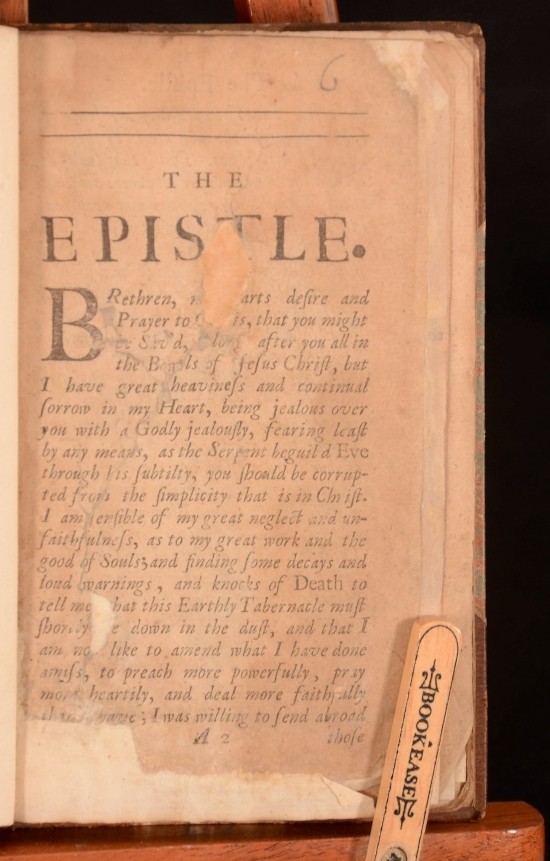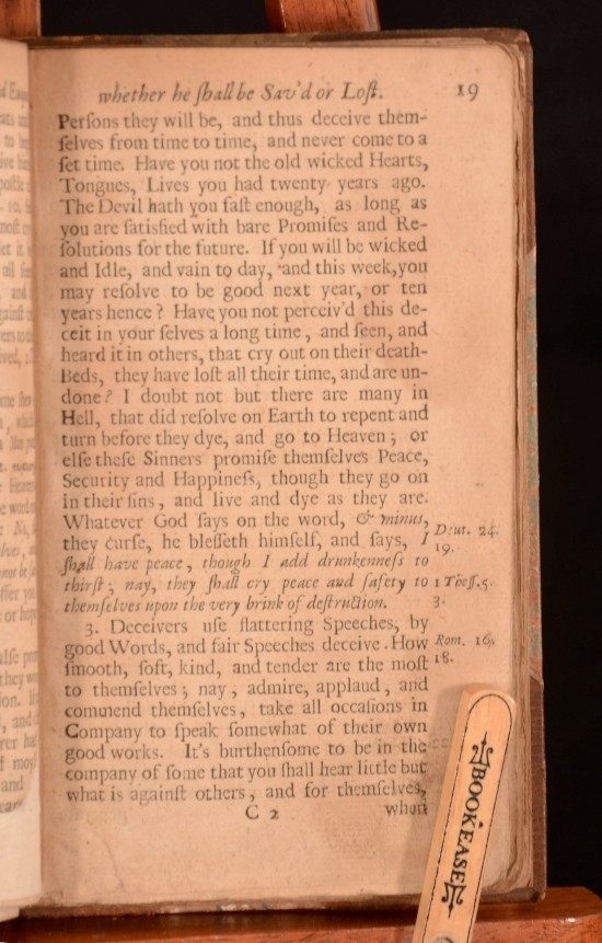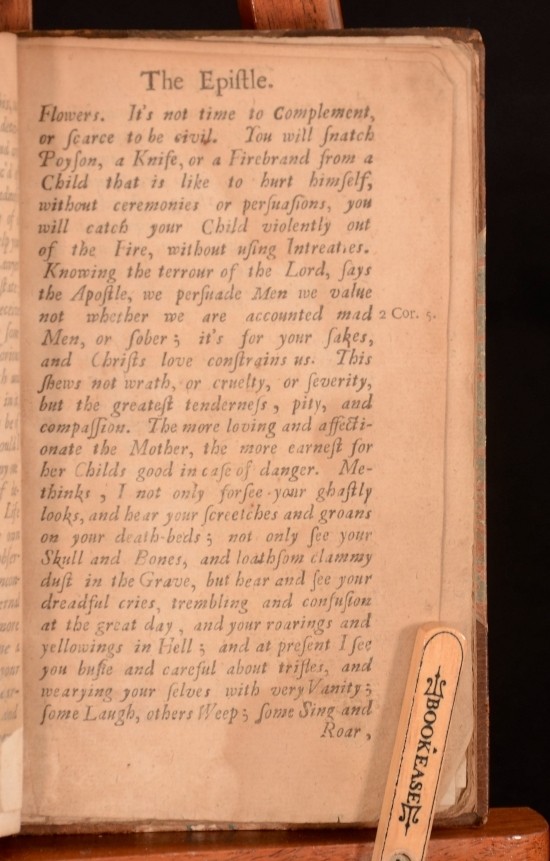 Click here to see our other books! A second guide to heaven : shewing, that it is every mans indispensable duty and interest to secure heaven for himself; because whoever misseth it, and is lost, is utterly undone, and miserably wretched, and the whole world is nothing to him, to help, or comfort him. And the man that is sav'd is unspeakably and eternally blessed· Likewise representing to consideration the common and notorious neglects and mistakes about this business of so great concernment the saving or losing self. By S.H. the author of the former Guide to heaven. Samuel Hardy 1687 A Churchill : London 7" by 4.5" [14], 272pp SUMMARY An extremely scarce edition of Samuel Hardy's Second Guide to Heaven. Very Scarce Overall Condition: Good Only This book weighs 0.75 KG when packed UK Postage: £ 3.99 US Postage: £ 19.99 EU Postage : £ 15.99 European Postage: £ 16.99 Asia Postage: £ 21.99 Worldwide Postage: £ 25.99 DESCRIPTION Lacking title page, title so author and publisher's information sourced from Copac. Collated, lacking title page, final twenty pages and errata. Final twenty pages include the rest of chapter XIII and chapter XIV. The full title reads as: A second guide to heaven : shewing, that it is every mans indispensable duty and interest to secure heaven for himself; because whoever misseth it, and is lost, is utterly undone, and miserably wretched, and the whole world is nothing to him, to help, or comfort him. And the man that is sav'd is unspeakably and eternally blessed· Likewise representing to consideration the common and notorious neglects and mistakes about this business of so great concernment the saving or losing self. By S.H. the author of the former Guide to heaven. Misbound, with the spine label allocating authorship to Baxter, presumably English Puritan, Richard Baxter. Spine label also lists title as 'Grand Interest', the title to the main section of this text. Samuel Hardy (1636/7-1691) was a nonconformist minister from Frampton, Dorset. He was educated at Wadham College, Oxford from 1656 to 1659. Upon graduation he became chaplain to the Trenchard family of Wolfeton House, Charminster near Dorchester. Prior to this publication he wrote another Guide to Heaven. CONDITION In a half calf binding. Externally, smart with light rubbing to extremities. Internally, firmly bound. Lacking title page and final twenty pages. Pages are rather age toned with minor loss to corners, not affecting text. Leaves A2, A3, B2-B5 with amateur repair to corners and leaf A2 laid down onto newer paper. scattered spots throughout. Overall Condition: Good Only GLOSSARY OF TERMS Overall Condition (Dustwrapper condition rating is shown after that for the book itself, where a dustwrapper is present) Fine - Very well preserved copy showing very little wear Very Good Indeed - Only one or two minor faults, really a very attractive copy Very Good - Quite a wide term meaning no major faults but probably several smaller ones often expected given the age of the book, but still a respectable copy Good - Meaning not very good. Some more serious faults as will be described in the condition report under 'condition' Good Only - Meaning one or more faults that could really do with repair Fair - As with good only above but with other faults leaving a compromised copy even after repair Poor - Really bad and possibly seriously incomplete. We only sell books in this condition where their rarity or value makes them attractive none the less. Major defects will be described. GUARANTEE We offer a full money back guarantee on our descriptions. Please ask for details and conditions. We prefer PAYPAL. If you pay via PAYPAL we will post the item off the same or the next working day with the postage you have selected. Please note we cannot accept USD cheques