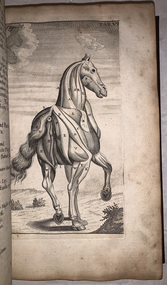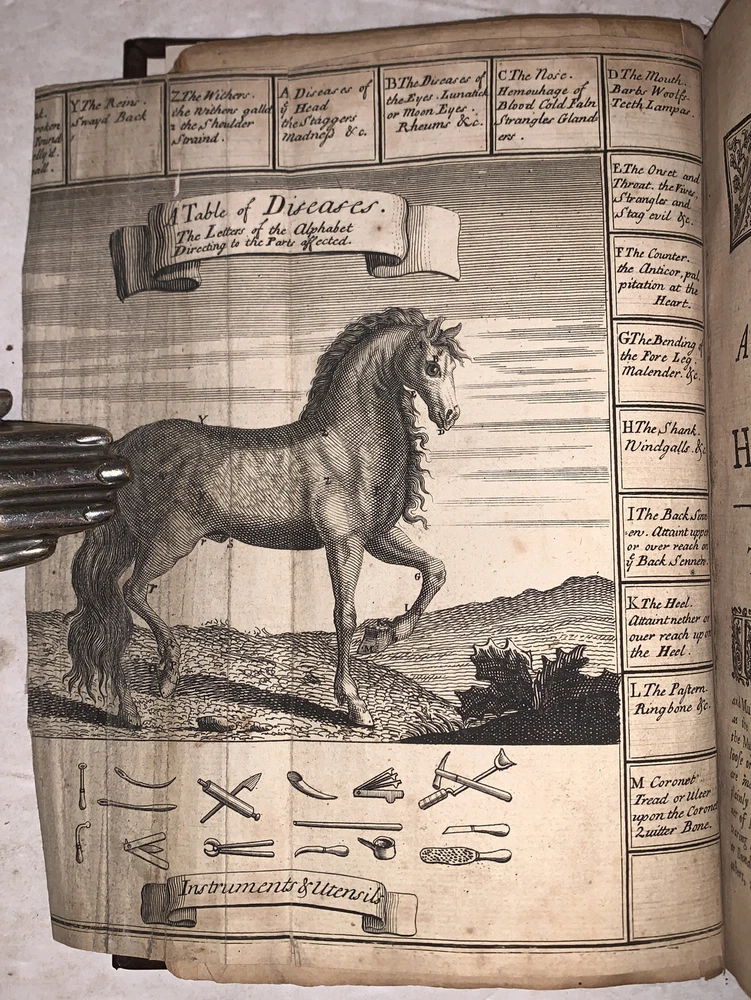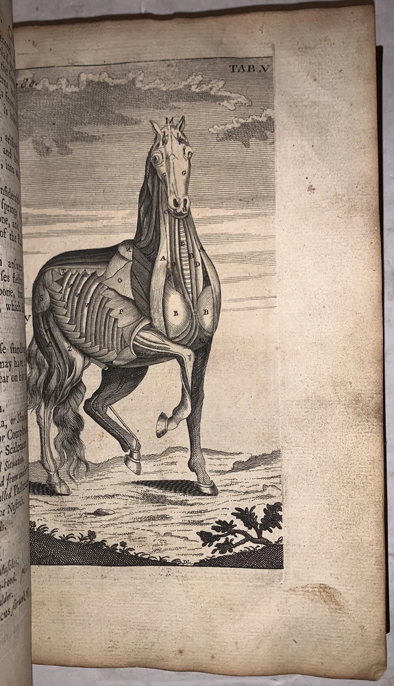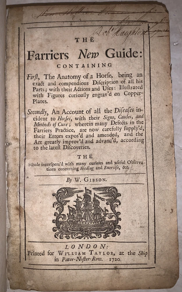 The Farriers New Guide: Containing First, The Anatomy of a Horse. Being an exact and compendious description of all his parts; with their actions and uses: illustrated with figures curiously engrav'd on copper-plates. Secondly, an account of all the diseases incident to horses, with their signs, causes, and methods of cure. Wherein many defects in the farriers practice, are now carefully supply'd, their errors expos'd and ammended, and the art greatly improv'd and advanc'd, according to the latest discoveries. The whole interspers'd with many curious and useful Observations concerning Feeding and Exercise, &c. by W. Gibson London: Printed for William Taylor 1720 First Edition Octavo, xii, viii, 125, 303, [1] pages, bound in recent full leather preserving part of the original boards. Gilt and raised bands to spine, blind stamped decoration. Illustrated with black and white engravings. Some slight rubbing and wear, discoloration, part of the fold out plate is missing, previous owner's inscription, else in very good condition. The Farrier's New Guide by W. Gibson, first published in 1720, is a foundational text in the field of farriery and veterinary medicine, specifically focusing on the care and treatment of horses. William Gibson, a farrier and surgeon, wrote this comprehensive guide to offer practical advice on the anatomy, diseases, and overall health management of horses, which were vital to transportation, agriculture, and military endeavors during that period. The book is divided into two parts: the first deals with the anatomy of horses, including detailed descriptions of their structure, while the second part provides treatments for various common ailments. Gibson’s work was highly regarded for its thoroughness and practical approach, making it an important reference for farriers and horse owners for many decades. If you have any questions, feel free to ask, and don't forget to check out my other listings.