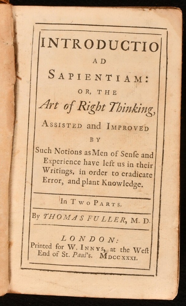 Click here to see our other books! Introductio ad Sapientiam: or, the Art of Right Thinking Thomas Fuller 1731 W. Innys : London 7" by 4.5" vi [1], 2-288pp SUMMARY The scarce first edition of the first part only of Thomas Fuller's guide to 'The Art of Right Thinking'. First Edition,Leather Binding,Scarce Overall Condition: Good This book weighs 1 KG when packed UK Postage: £ 3.99 US Postage: £ 22.99 EU Postage : £ 16.99 European Postage: £ 17.99 Asia Postage: £ 22.99 Worldwide Postage: £ 28.99 DESCRIPTION The first part only of a two part work by Thomas Fuller. The scarce first edition of this work. ESTC T138941 An unusual guide to thought and logic, in which the author utilises 'such notions as men of sense and experience have left us in their writings, in order to eradicate error, and plant knowledge'. Fuller offers instructional information on correct conduct, moral practice and ethics, and offers maxims that may be useful to his readers. CONDITION In a full calf binding. Significant rubbing to binding. Lacking half of spine label. Loss of leather to spine tail. Joints starting, with rear board a touch tender, and front board detached to the tail. Internally, binding significantly strained. One gathering, pages 99-118, detached and loosely inserted. Pages lightly age toned, but generally clean and bright. Overall Condition: Good GLOSSARY OF TERMS Overall Condition (Dustwrapper condition rating is shown after that for the book itself, where a dustwrapper is present) Fine - Very well preserved copy showing very little wear Very Good Indeed - Only one or two minor faults, really a very attractive copy Very Good - Quite a wide term meaning no major faults but probably several smaller ones often expected given the age of the book, but still a respectable copy Good - Meaning not very good. Some more serious faults as will be described in the condition report under 'condition' Good Only - Meaning one or more faults that could really do with repair Fair - As with good only above but with other faults leaving a compromised copy even after repair Poor - Really bad and possibly seriously incomplete. We only sell books in this condition where their rarity or value makes them attractive none the less. Major defects will be described. GUARANTEE We offer a full money back guarantee on our descriptions. Please ask for details and conditions. We prefer PAYPAL. If you pay via PAYPAL we will post the item off the same or the next working day with the postage you have selected. Please note we cannot accept USD cheques