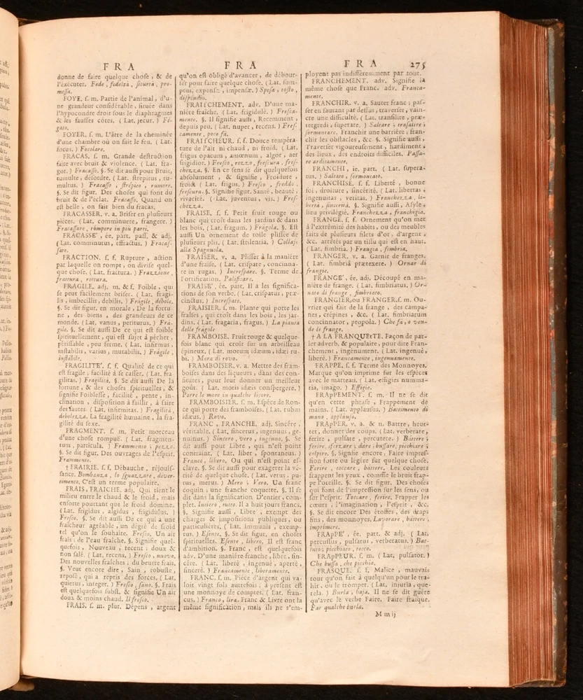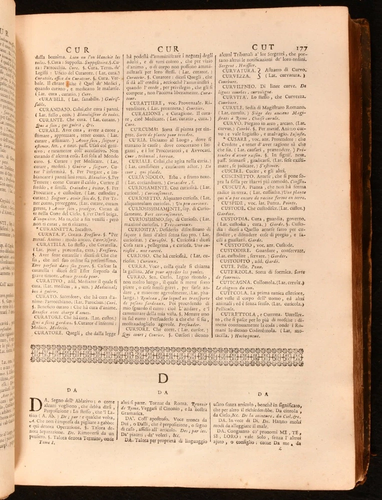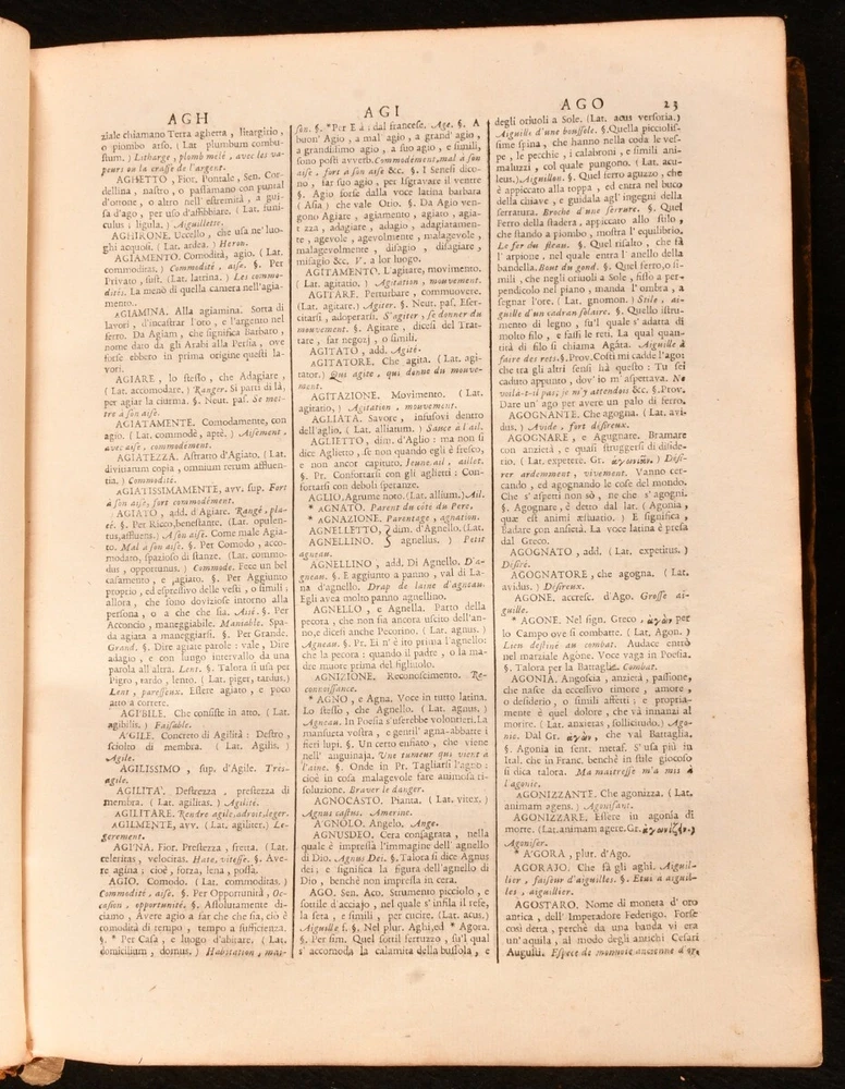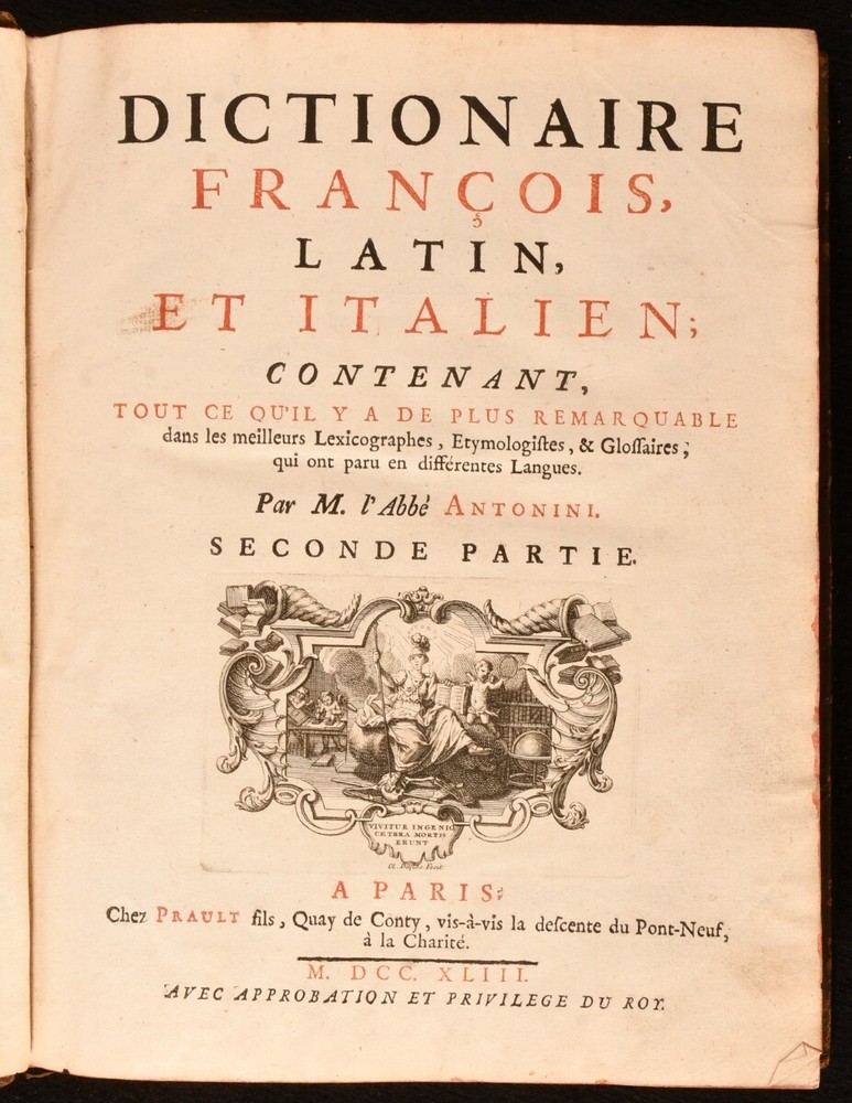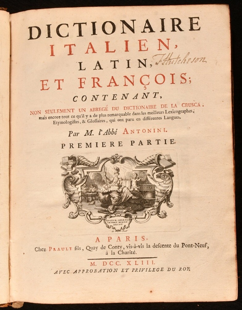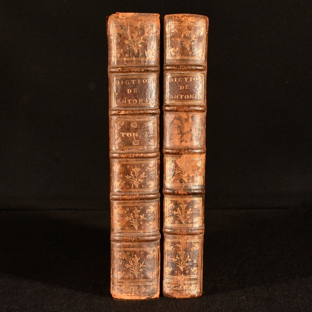 Click here to see our other books! Dictionaire Italien, Latin, Et Francois; Dictionaire Francois, Latin, et Italien M. L'Abbe Antonini [Annibale Antonini] 1743 Prault : Paris 10.5" by 8.5" [2], v-xxvii [2], 2-698; 600pp SUMMARY The very scarce first French edition of Italian scholar Annibale Antonini's French, Latin and Italian dictionary. First Edition,Leather Binding,Scarce Overall Condition: Very Good This book weighs 4 KG when packed UK Postage: £ 4.49 US Postage: £ 39.99 EU Postage : £ 26.99 European Postage: £ 36.99 Asia Postage: £ 65.99 Worldwide Postage: £ 99.99 DESCRIPTION In Italian, Latin, and French. Antonini published a successful Italian grammar in 1726 in Paris, and an Italian dictionary in 1735. This is the very scarce first French abridged edition, with Latin and Italian entries. In two volumes, printed in treble columns. Part I is Italian to French, and Part II French to Italian. The Latin is subsidiary. Lacking the frontispiece to volume I. With the armorial bookplate of F. Hutcheson M.D. to each front pastedown, and his inscription to a front blank of volume I, and to the title page of volume I. A very scarce work from the Italian philologist, grammarian, lexicographer and translator. CONDITION In full calf bindings, with gilt detailing to back strips. Light rubbing to back strip heads and tails and joints. Volume II lacking volume number spine label. Head of front joint of volume I starting, with board holding firm. Rear hinge of volume II strained but firmly held. Bookplates to front pastedowns, with inscription to front blank and title page of volume I. Internally, firmly bound. Pages lightly age toned due to paper type, but generally clean and bright. Volume I lacking frontispiece. Overall Condition: Very Good GLOSSARY OF TERMS Overall Condition (Dustwrapper condition rating is shown after that for the book itself, where a dustwrapper is present) Fine - Very well preserved copy showing very little wear Very Good Indeed - Only one or two minor faults, really a very attractive copy Very Good - Quite a wide term meaning no major faults but probably several smaller ones often expected given the age of the book, but still a respectable copy Good - Meaning not very good. Some more serious faults as will be described in the condition report under 'condition' Good Only - Meaning one or more faults that could really do with repair Fair - As with good only above but with other faults leaving a compromised copy even after repair Poor - Really bad and possibly seriously incomplete. We only sell books in this condition where their rarity or value makes them attractive none the less. Major defects will be described. GUARANTEE We offer a full money back guarantee on our descriptions. Please ask for details and conditions. We prefer PAYPAL. If you pay via PAYPAL we will post the item off the same or the next working day with the postage you have selected. Please note we cannot accept USD cheques