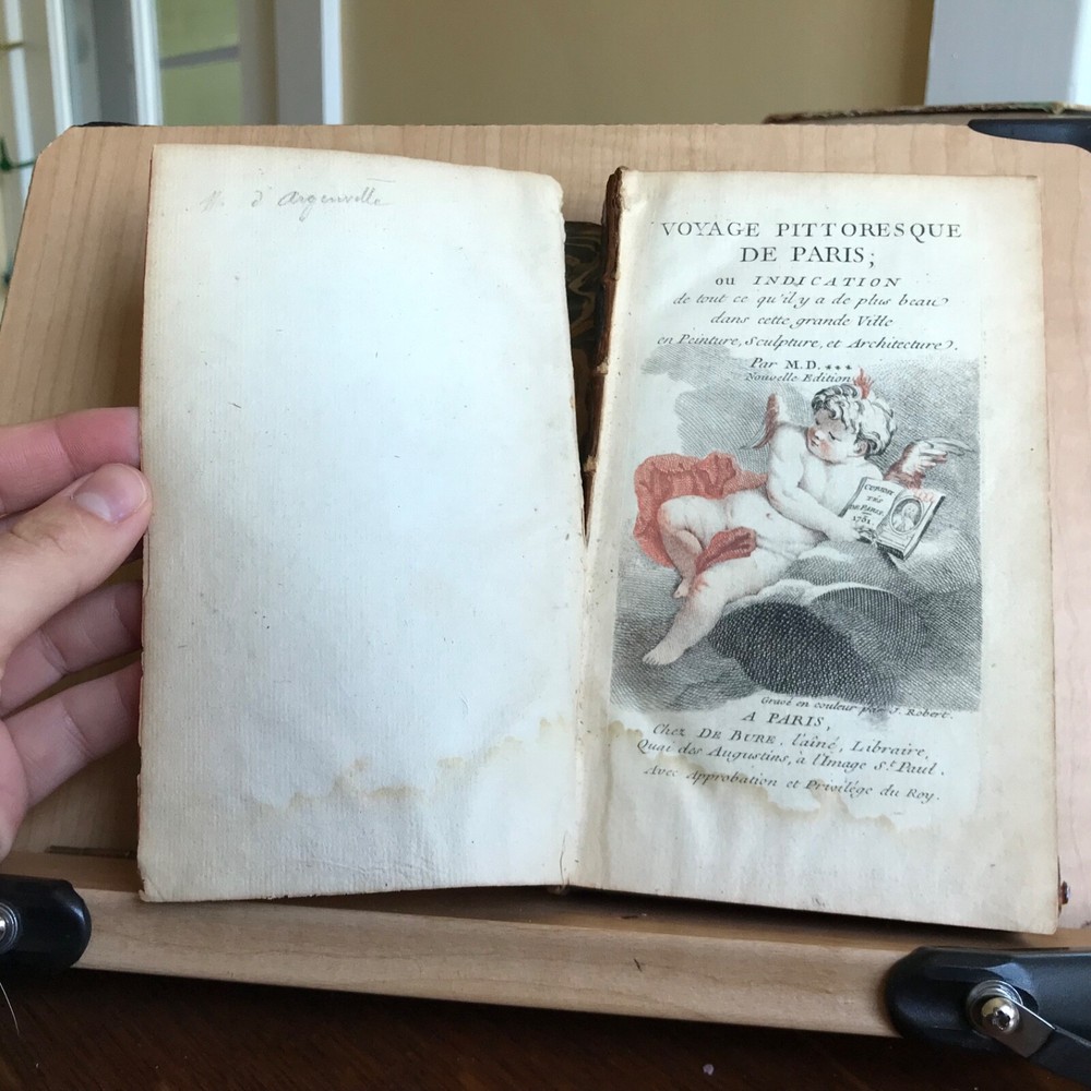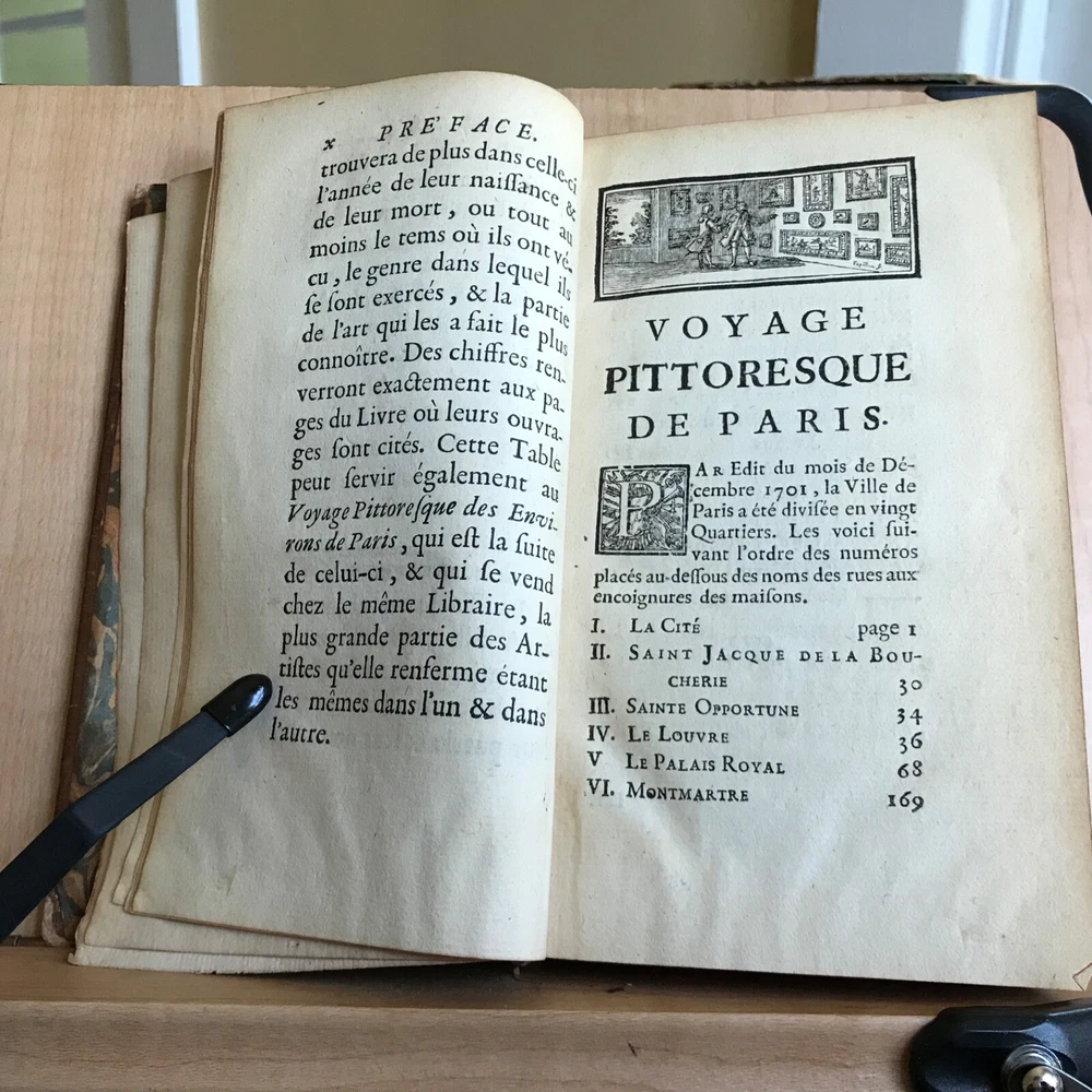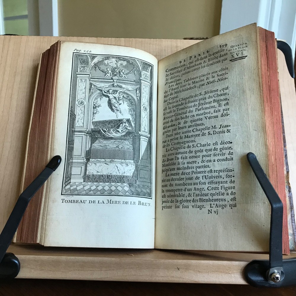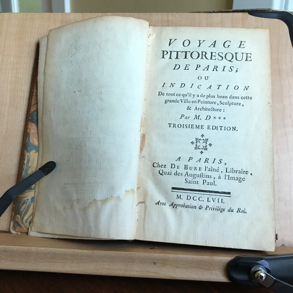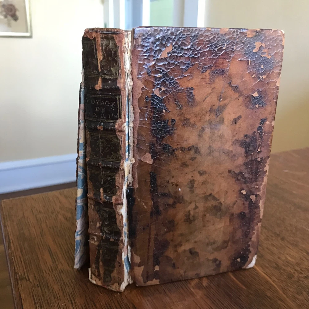 Voyage Pittoresque de Paris de tout ce qu'il y a de plus beau dans cette grande Ville en Peinture, Sculpture, & Architecture: Par M.D.*** Troisieme Edition, A Paris, CHez De Burel’aine, 1757, hand-colored illustrated title, two black and white full-page engravings and one folding illustrated engraving, 496 pp, full original leather, 7 x 4”, 12mo. In as-is condition. Binding copy. Both boards are detached. A great candidate for restoration. Original binding quite worn with heavy rubbing to extremities with peeling. Leather quite desiccated and cracking. A non-archival epoxy has likely been painted over the spine remnants. Heavy loss to spine. Marbled end papers free of markings, remain bright for their age. All edges red. First fly and end papers are nearly detached from the front of the text block. Internally good with light toning and minor instances of foxing. Free of known markings. Binding remains intact. An important work worth restoring. Please see photos. A guide to Paris’ art and monuments by Antoine-Nicholas Dezallier d’Argenville (1723-1796). Anonymously wrote under M.D.***. This work first appeared in Paris in 1749, and was a connoisseur’s guide to the chief artistic and architectural monuments of Paris, with accounts of the leading academic and scientific organizations of the city. At least six further editions appeared before the Revolution. COLH1757AJKW-FORN-TUB0004(HK)