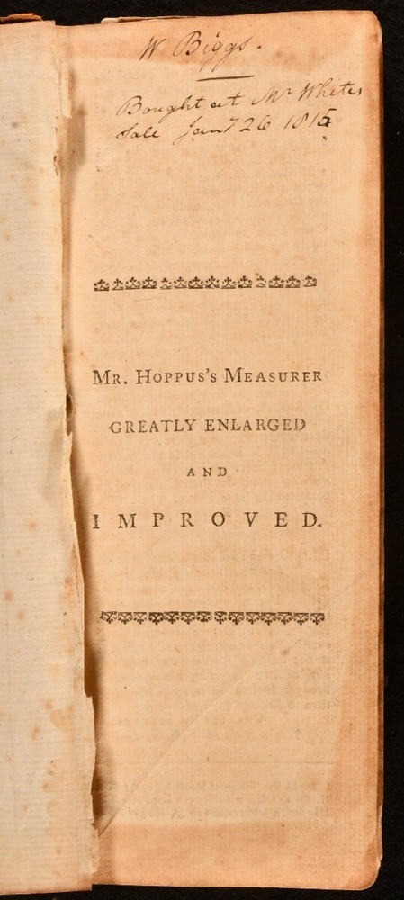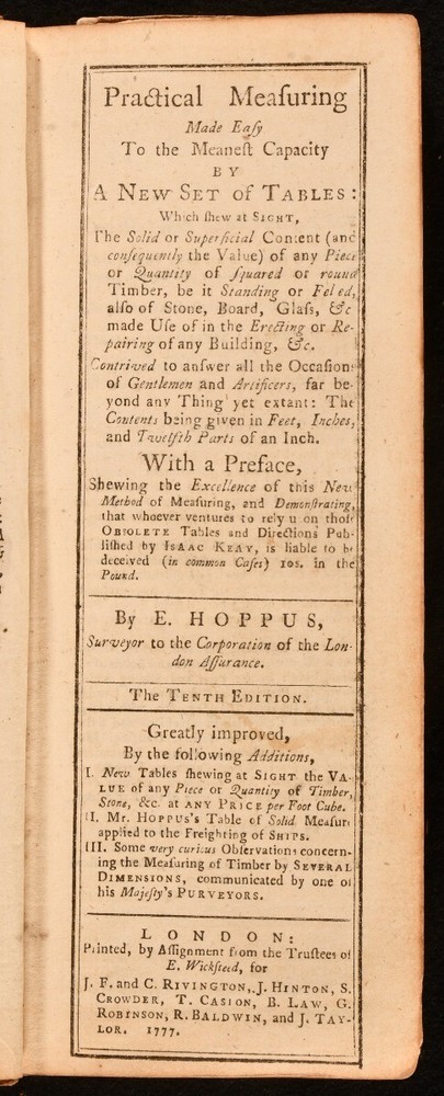 Click here to see our other books! Practical Measuring Made Easy to the Meanest Capacity by A New Set of Tables E. Hoppus 1777 W. Wicksteed : London 7.5" by 3" [4], v-lxxvi, 204pp SUMMARY A tenth edition of this practical measuring guide. Leather Binding Overall Condition: Good Only This book weighs 0.5 KG when packed UK Postage: £ 3.99 US Postage: £ 15.99 EU Postage : £ 13.99 European Postage: £ 14.99 Asia Postage: £ 18.99 Worldwide Postage: £ 19.99 DESCRIPTION A tenth edition copy of Practical Measuring Made Easy to the Meanest Capacity by A New Set of Tables by E. Hoppus, published in 1777. This volume is a collection of tables which show he solid or superficial content of any piece or quantity of squared or round timber, stone, glass &c. made use of in the erecting or repairing of any building. With a half title page and folding plates, all pages are present. Collated, complete. CONDITION In full calf binding. Externally, worn. The joints are cracking and there is bumping to the extremities, rubbing to the spine and marks to the boards. Hinges are weakening. Previous owner inscription to the front and rear endpapers and half title page. Internally, generally firmly bound with generally bright and clean pages. Overall Condition: Good Only GLOSSARY OF TERMS Overall Condition (Dustwrapper condition rating is shown after that for the book itself, where a dustwrapper is present) Fine - Very well preserved copy showing very little wear Very Good Indeed - Only one or two minor faults, really a very attractive copy Very Good - Quite a wide term meaning no major faults but probably several smaller ones often expected given the age of the book, but still a respectable copy Good - Meaning not very good. Some more serious faults as will be described in the condition report under 'condition' Good Only - Meaning one or more faults that could really do with repair Fair - As with good only above but with other faults leaving a compromised copy even after repair Poor - Really bad and possibly seriously incomplete. We only sell books in this condition where their rarity or value makes them attractive none the less. Major defects will be described. GUARANTEE We offer a full money back guarantee on our descriptions. Please ask for details and conditions. We prefer PAYPAL. If you pay via PAYPAL we will post the item off the same or the next working day with the postage you have selected. Please note we cannot accept USD cheques