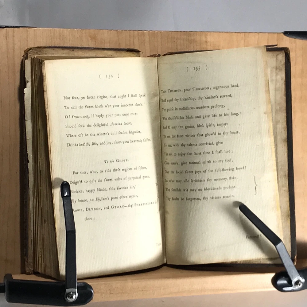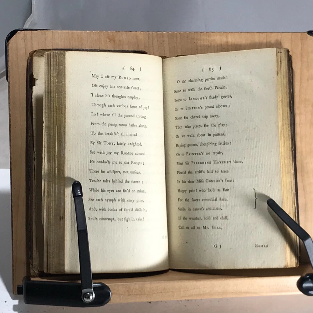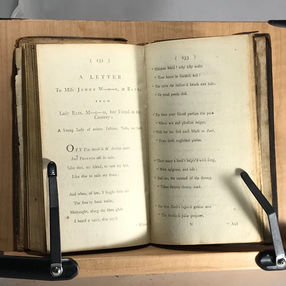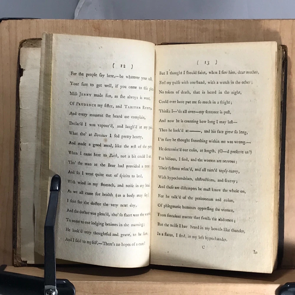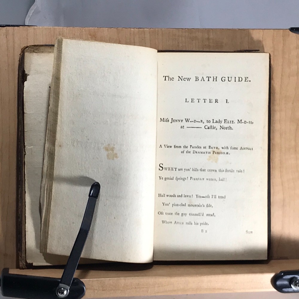 The New Bath Guide: or, Memoirs of the B—N—R—D Family in a Series of Poetical Epistles, A New Edition, Printed for Robert Dodsley, London, 1788, full leather, 156 pages, 12mo. In fair condition. Front board and fly leaf are detached but intact. Attractive Greek meander design on spine in gilt. Some light staining. Front board may not be original to book, does not match rear board. Previous owner’s name on front fly leaf. Text block appropriately toned with minimal foxing. Unmarked. Binding remains intact. Please see photos. The New Bath Guide reprints the rules for both the Upper and the Lower Rooms. The two sets of rules are similar, and cover matters such as clothing, the allocation of seats and the times at which balls had to start and finish. The New Bath Guide also contains a humorous set of rules which pokes fun at the culture of the Assembly Rooms. Some of these allude to the Rooms’ reputation as centers of gossip, as in Rule X: 'That all whisperers of lies and scandal be taken for their authors'. FORN-ABE-MSB-0120-Shelf-571-lh007