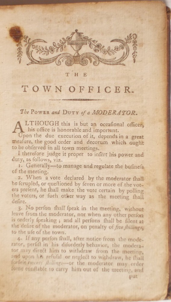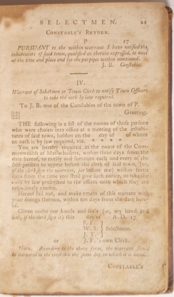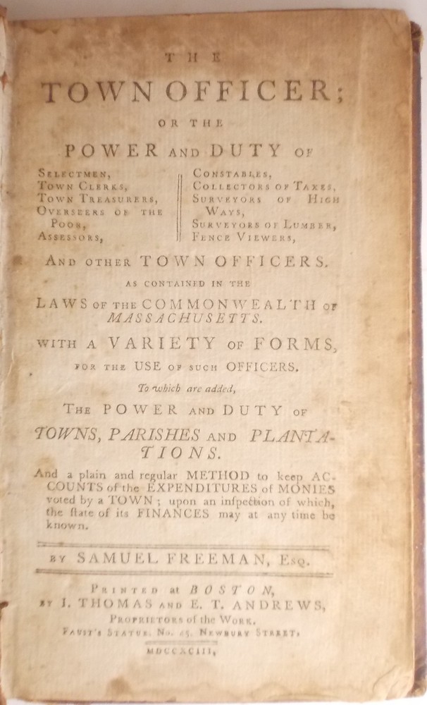Freeman, Samuel. The Town Officer: or the Power and Duty of Selectmen, Town Clerks, Town Treasurers, Overseers of the Poor, Assessors, Constables, Collectors of Taxes, Surveyors of High Ways, Surveyors of Lumber, Fence Viewers and Other Town Officials As Contained in The. :Laws of the Commonwealth of Massachusetts. with a Variety of Forms for the Use of Such Officers to Which is Added the Power and Duty of Towns, Parishes and Plantations. and a Plain and Regular Method to Keep Accounts of the Expenditures and Monies Voted. Isaiah Thomas and E. T. Andrews, 1793. Second Edition. Leather: Good condition. A scarce and important reference published just after the Constitution was adopted the outlined the duties and responsibilities of Massachusetts local officials from Selectmen to Fence Viewers. Contemporary calf with some scuffing, Bound in sixes: A-U6, 7" x 4.5". 239pp. + an advertisement for Thomas and Andrews publications (including Mary Woolstonecraft's [sic] "Vindication of the Rights of Woman". Foxing and a stain on the top margin. Brief inscription inside the cover, small chip on the corner of leaf K3 with the loss of a few words on the last two lines. We can quote priority or international postage rates. We're happy to combine purchases to save you shipping fees. All items are guaranteed as described, feel free to contact us with any questions. We buy & sell books in all subjects The Book Rack 300 Oak St. #1110 Pembroke, MA Powered by eBay Turbo Lister The free listing tool. List your items fast and easy and manage your active items.