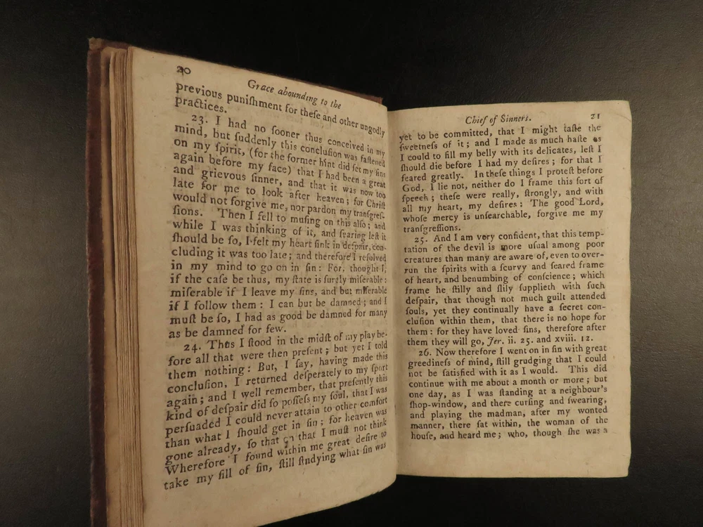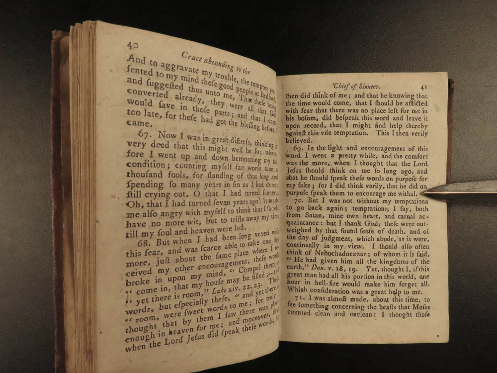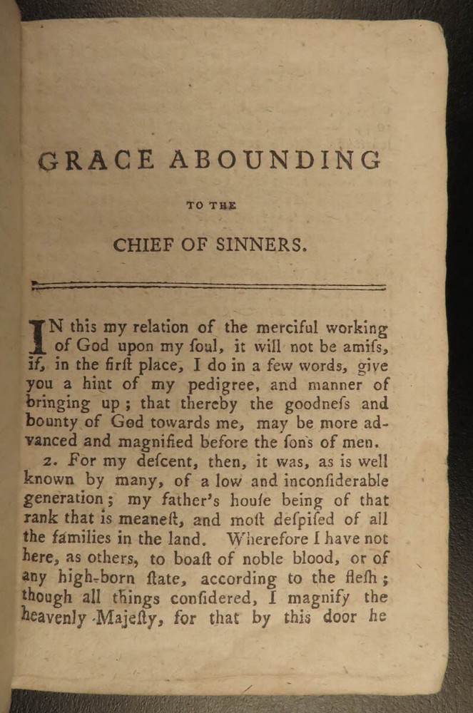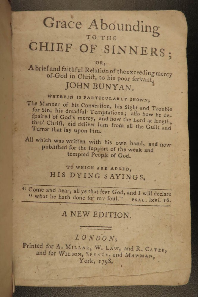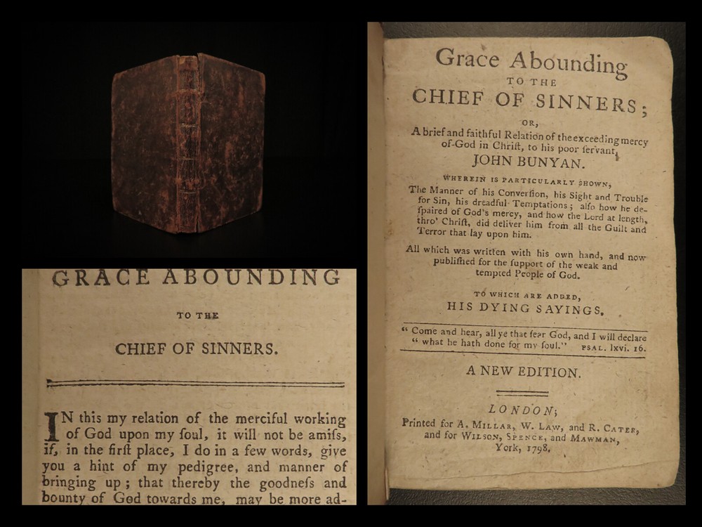 1798 John Bunyan Puritan Grace Abounding to Chief of Sinners Spiritual Guide John Bunyan was best-known for his masterpiece ‘ The Pilgrim’s Progress ’, one of the most important pieces of Puritan literature. In addition to ‘ Pilgrim’s Progress’ , Bunyan wrote a work entitled ‘ Grace Abounding to the Chief of Sinners ’. This book was written while Bunyan was in prison and is a sort of autobiography of Bunyan’s own spiritual life and journey. Item number: #16346 Price: $499 BUNYAN, John Grace abounding to the chief of sinners London: printed for A. Millar, Law, etc. 1798. Details : · Collation: Complete with all pages o ix, 189, [1] · Language: English · Binding: Leather; tight and secure · Size : ~5in X 3.5in (12.5cm x 8.5cm) Our Guarantee: Very Fast. Very Safe. Free Shipping Worldwide. Customer satisfaction is our priority! Notify us with 7 days of receiving, and we will offer a full refund without reservation! 16346