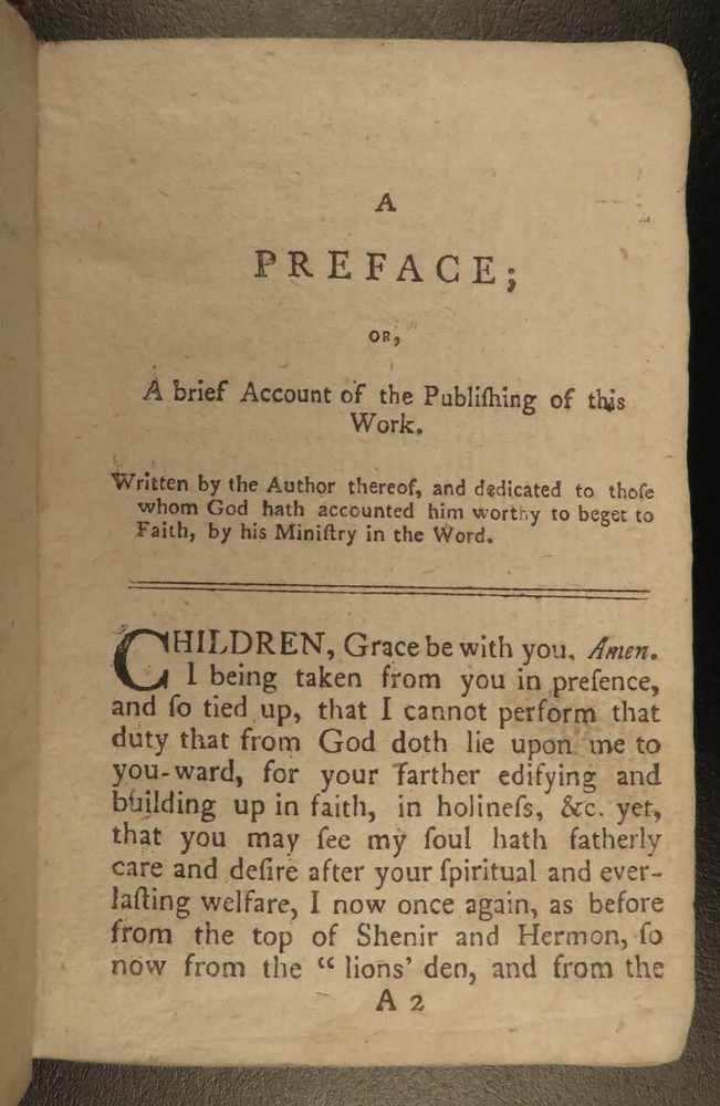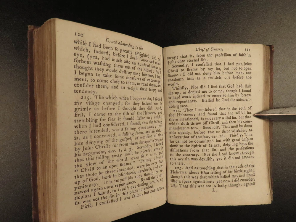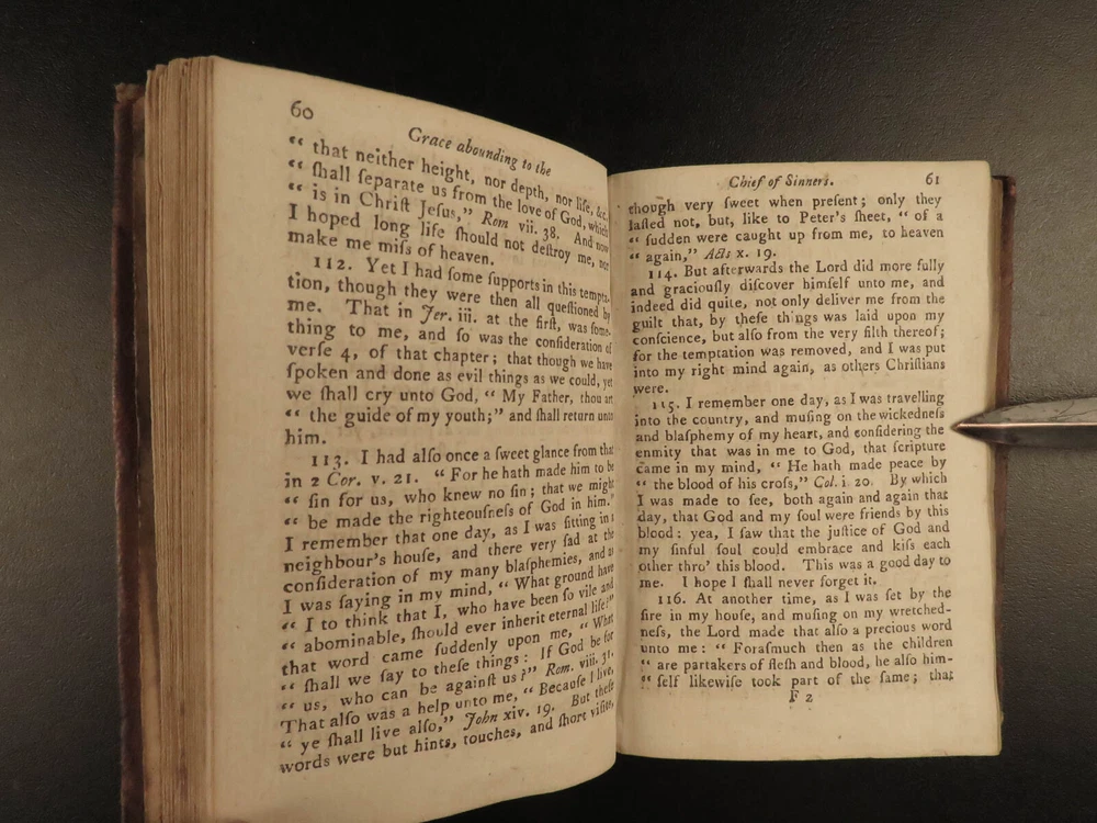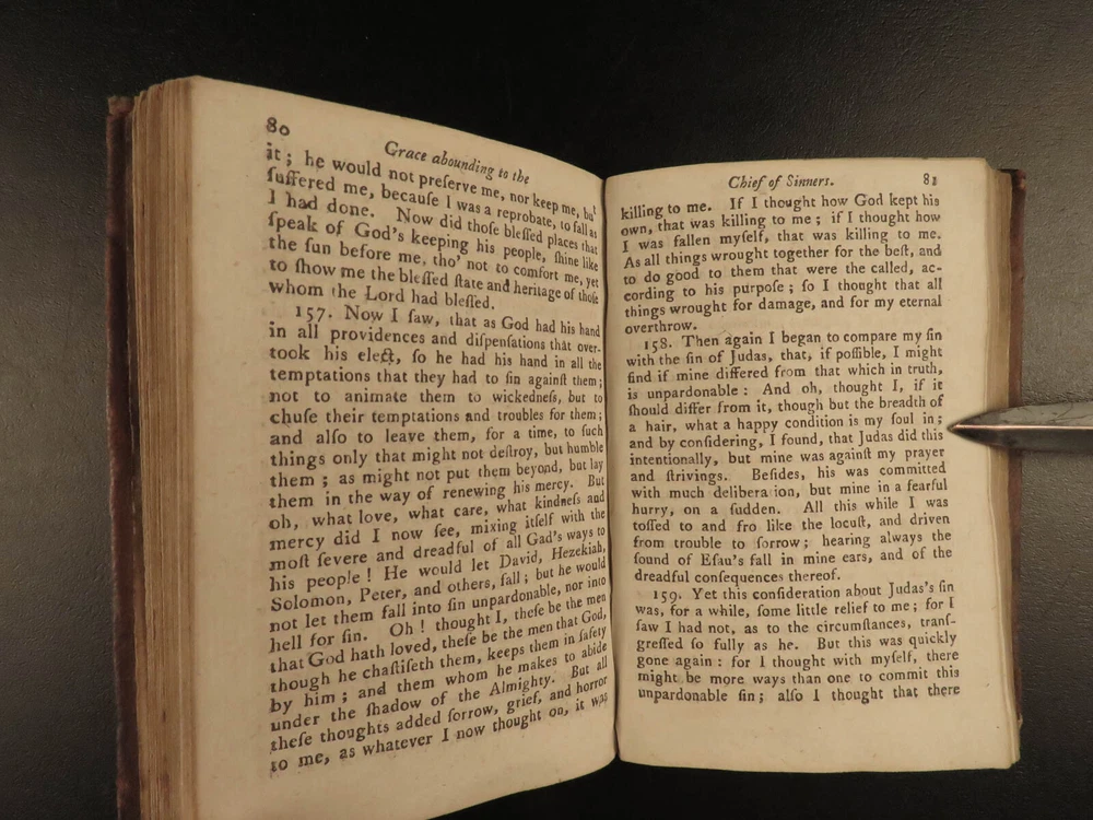 1798 John Bunyan Puritan Grace Abounding to Chief of Sinners Spiritual Guide John Bunyan was best-known for his masterpiece ‘ The Pilgrim’s Progress ’, one of the most important pieces of Puritan literature. In addition to ‘ Pilgrim’s Progress’ , Bunyan wrote a work entitled ‘ Grace Abounding to the Chief of Sinners ’. This book was written while Bunyan was in prison and is a sort of autobiography of Bunyan’s own spiritual life and journey. Item number: #16346 Price: $499 BUNYAN, John Grace abounding to the chief of sinners London: printed for A. Millar, Law, etc. 1798. Details : · Collation: Complete with all pages o ix, 189, [1] · Language: English · Binding: Leather; tight and secure · Size : ~5in X 3.5in (12.5cm x 8.5cm) Our Guarantee: Very Fast. Very Safe. Free Shipping Worldwide. Customer satisfaction is our priority! Notify us with 7 days of receiving, and we will offer a full refund without reservation! 16346