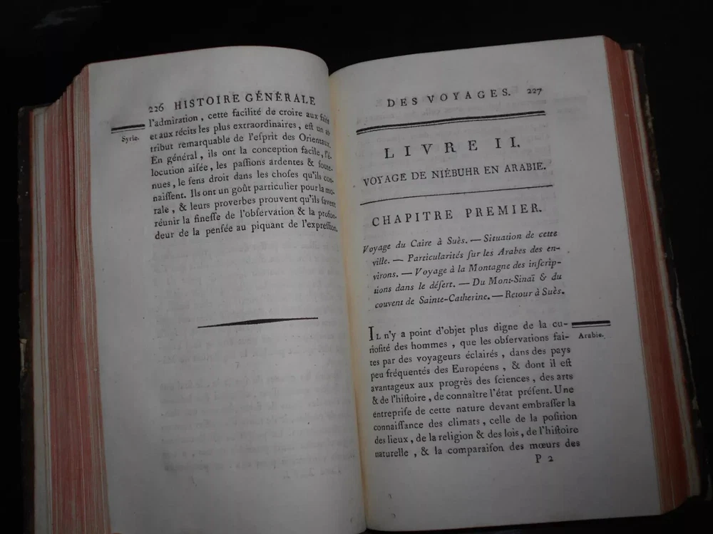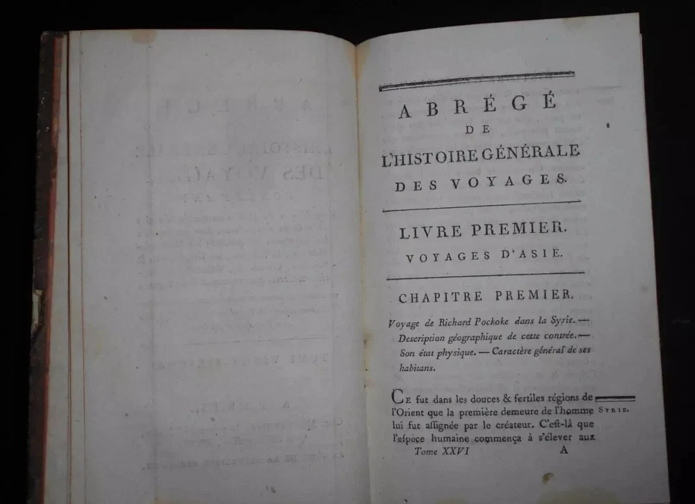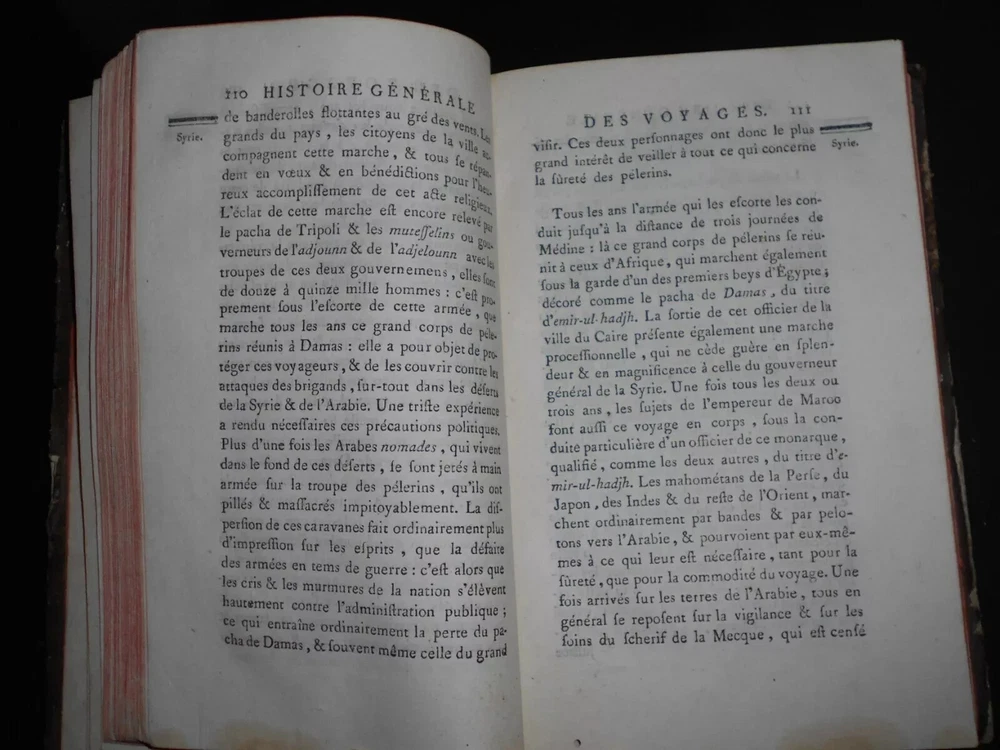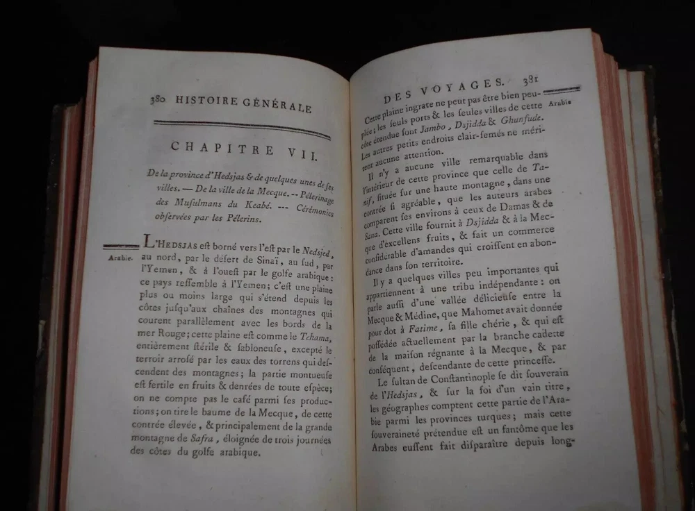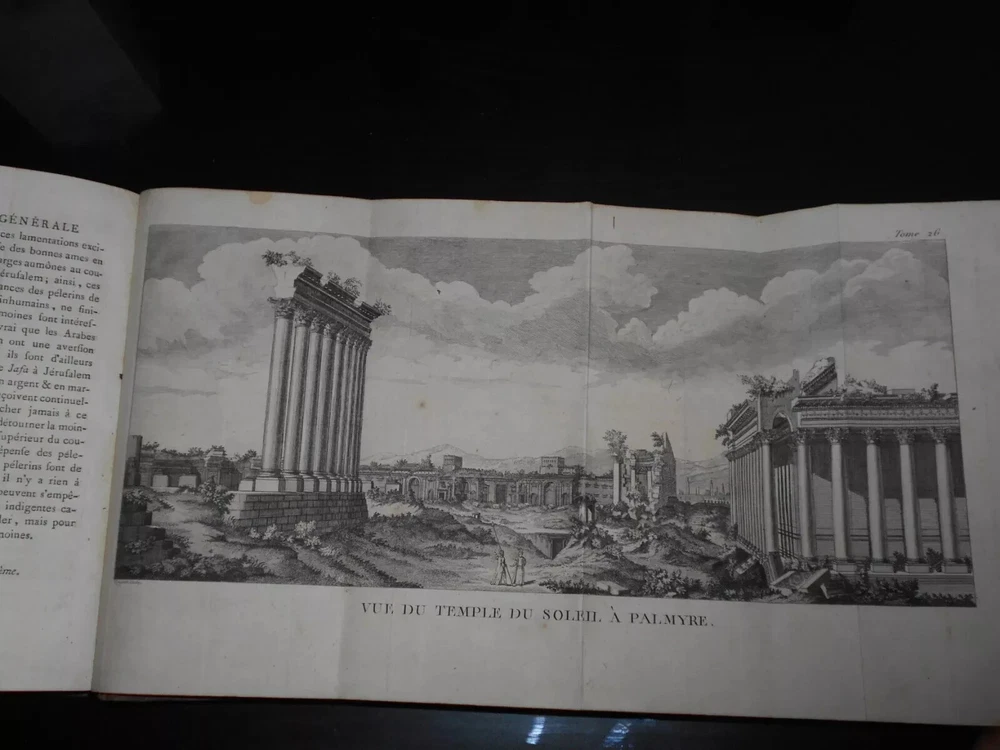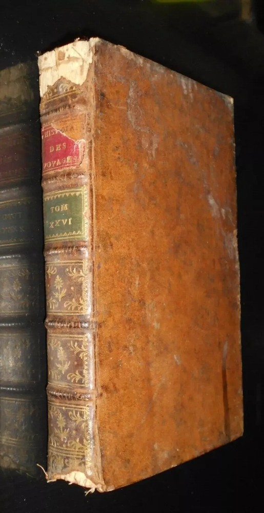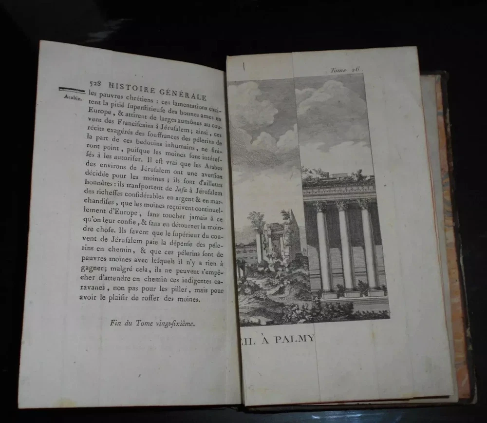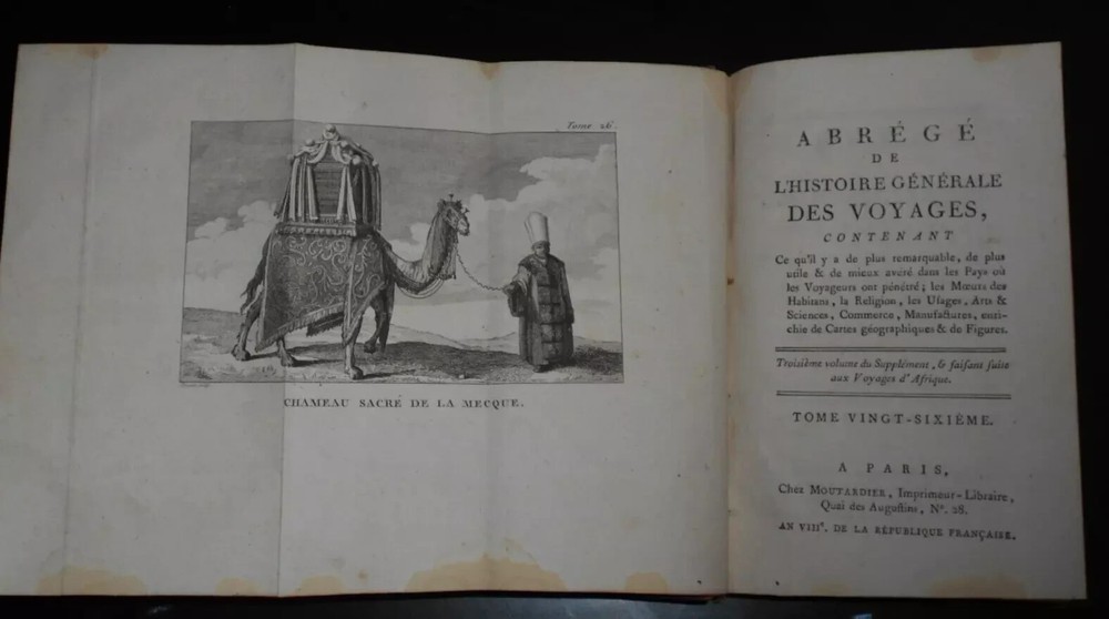 Antique travel book . Tome vingt-sixieme (Volume XXVI). A Paris, chez Moutardier, MDCCLXXXXIX/MDCCC ( 1799/1800 ). Illustrated with 2 fine fold-out engravings (one depicting a Sacred Camel in Mecca and the other a view of the ancient city of Baalbeck). Among the contents: Voyage de Richard Pockoke dans la Syrie, Caractere general de ses habitans, De la Palestine en general, Depart de Damiette, De Rama, Entree a Jerusalem, Pelerinage, De la ville de Saide, jadis Sidon, Du village de Sour, jadis Tyr, Du Mont-Carmel, Du Mont-Thabor, De la Mer de Tiberiade, Des montagnes de Castravan et des endroits qui sont sur la route de Tripoli, Des cedres du Liban, Route de Tripoli a Baalbeck, Ruines de Palmyre, Digression sur Odenat et Zenobie, Route de Damas a Alep, par Hems, l'ancienne Emese, Etat actuel d'Alexandrette, Du Deabekir ou de la Meopotamie, De Diarbeck et de Bagdad, Climat de la Syrie, Les Turcomans, les Kourdes, les Arabes, Gouvernement des Turcs en Syrie, L'administration de la justice, Influence de la religion, Etat de l'agriculture et du commerce, Voyage du Caire a Suez, Du Mont Sinai et du couvent de Sainte-Catherine, Description de l'Arabie, Gouvernement des Arabes, Route jusqu'a Moka, Audience de l'Iman et du Visir, De la ville de la Mecque, Pelerinage des Musulmans du Keabe, Ceremonies observes par les Pelerins, Du Scherif de la Mecque et du Pacha de Dsjidda, De la ville de Medine et du Sepulchre du Prophete, Courte notice du Couran, Des limites de l'Yemen, Etablissements des Arabes sur les cotes de Perse. Leather binding. Text in french. 532 pages, 19 x 12.5 x 3.5 cm. Good condition in general ( foxi ng, yellow/brown stains, some creased pages’ corners, merely worn cover, rubbing on boards' corners/edges/stains/splotchy parts/missing pieces/fragile parts/holes, leather on boards' edges is more worn and partly unmounted from the surface of edges, &c). Shipping (registered letter) worldwide: $25.