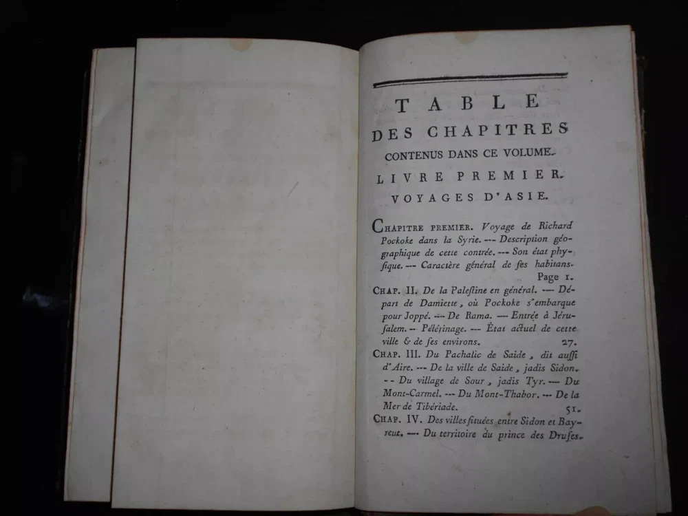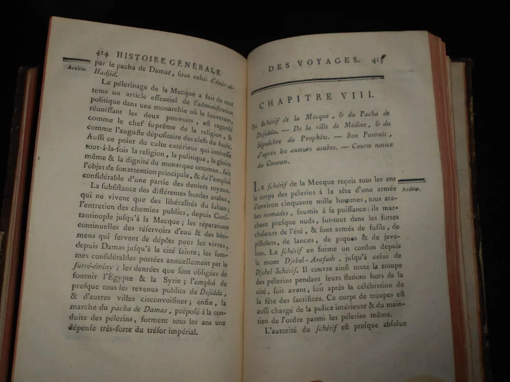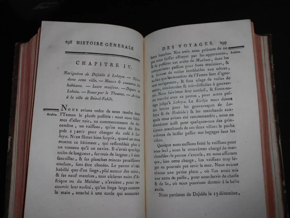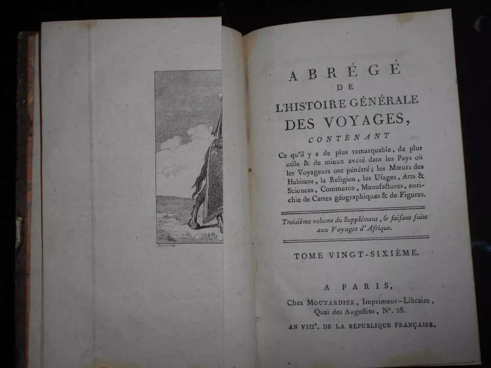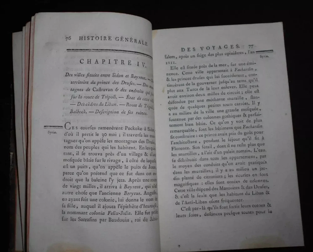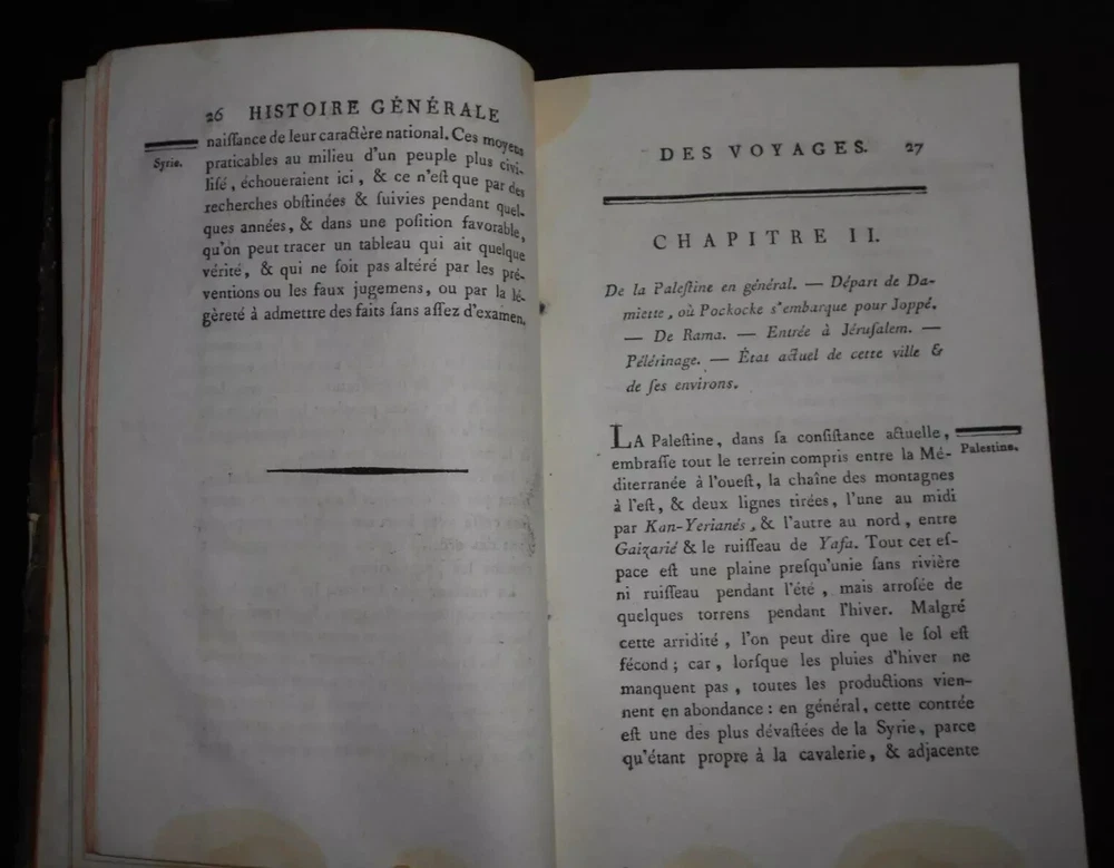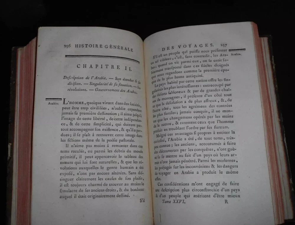 Antique travel book . Tome vingt-sixieme (Volume XXVI). A Paris, chez Moutardier, MDCCLXXXXIX/MDCCC ( 1799/1800 ). Illustrated with 2 fine fold-out engravings (one depicting a Sacred Camel in Mecca and the other a view of the ancient city of Baalbeck). Among the contents: Voyage de Richard Pockoke dans la Syrie, Caractere general de ses habitans, De la Palestine en general, Depart de Damiette, De Rama, Entree a Jerusalem, Pelerinage, De la ville de Saide, jadis Sidon, Du village de Sour, jadis Tyr, Du Mont-Carmel, Du Mont-Thabor, De la Mer de Tiberiade, Des montagnes de Castravan et des endroits qui sont sur la route de Tripoli, Des cedres du Liban, Route de Tripoli a Baalbeck, Ruines de Palmyre, Digression sur Odenat et Zenobie, Route de Damas a Alep, par Hems, l'ancienne Emese, Etat actuel d'Alexandrette, Du Deabekir ou de la Meopotamie, De Diarbeck et de Bagdad, Climat de la Syrie, Les Turcomans, les Kourdes, les Arabes, Gouvernement des Turcs en Syrie, L'administration de la justice, Influence de la religion, Etat de l'agriculture et du commerce, Voyage du Caire a Suez, Du Mont Sinai et du couvent de Sainte-Catherine, Description de l'Arabie, Gouvernement des Arabes, Route jusqu'a Moka, Audience de l'Iman et du Visir, De la ville de la Mecque, Pelerinage des Musulmans du Keabe, Ceremonies observes par les Pelerins, Du Scherif de la Mecque et du Pacha de Dsjidda, De la ville de Medine et du Sepulchre du Prophete, Courte notice du Couran, Des limites de l'Yemen, Etablissements des Arabes sur les cotes de Perse. Leather binding. Text in french. 532 pages, 19 x 12.5 x 3.5 cm. Good condition in general ( foxi ng, yellow/brown stains, some creased pages’ corners, merely worn cover, rubbing on boards' corners/edges/stains/splotchy parts/missing pieces/fragile parts/holes, leather on boards' edges is more worn and partly unmounted from the surface of edges, &c). Shipping (registered letter) worldwide: $25.