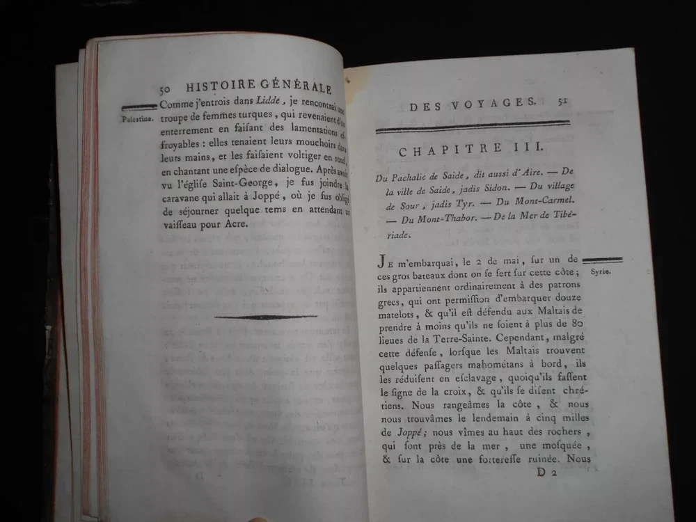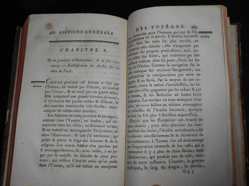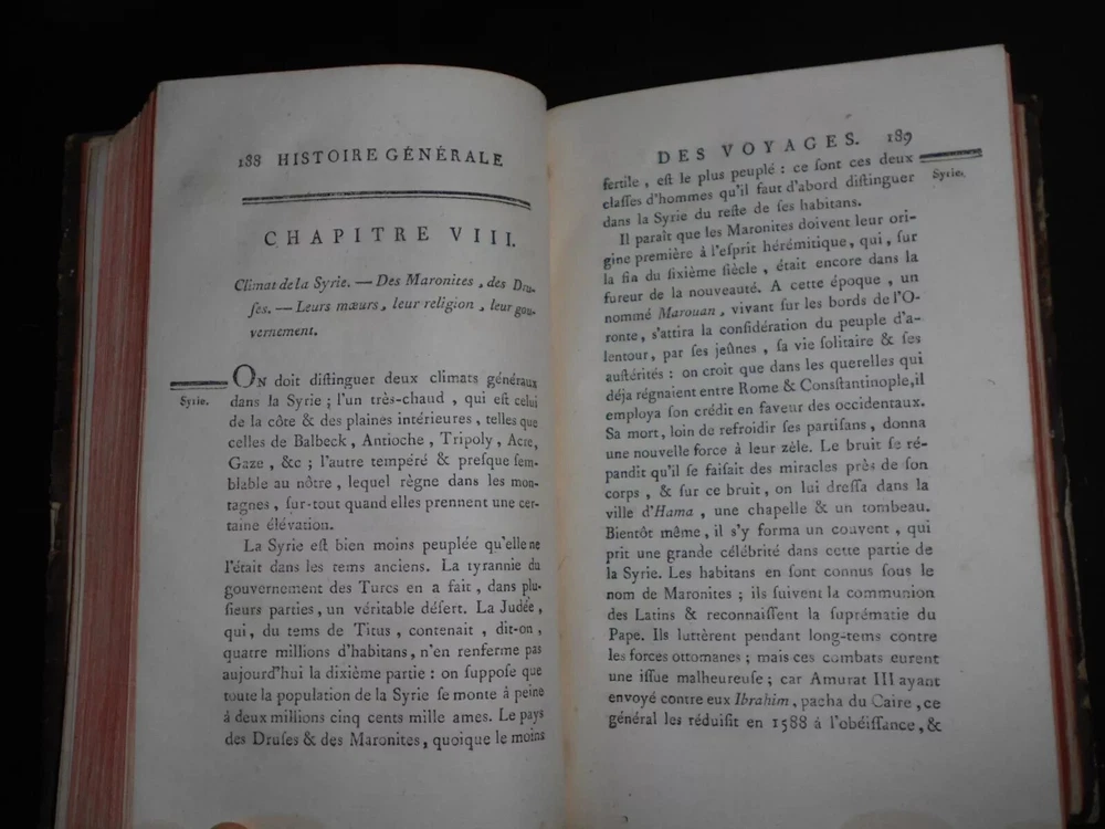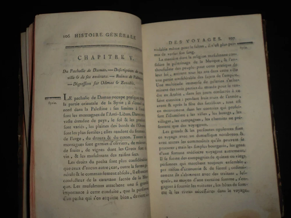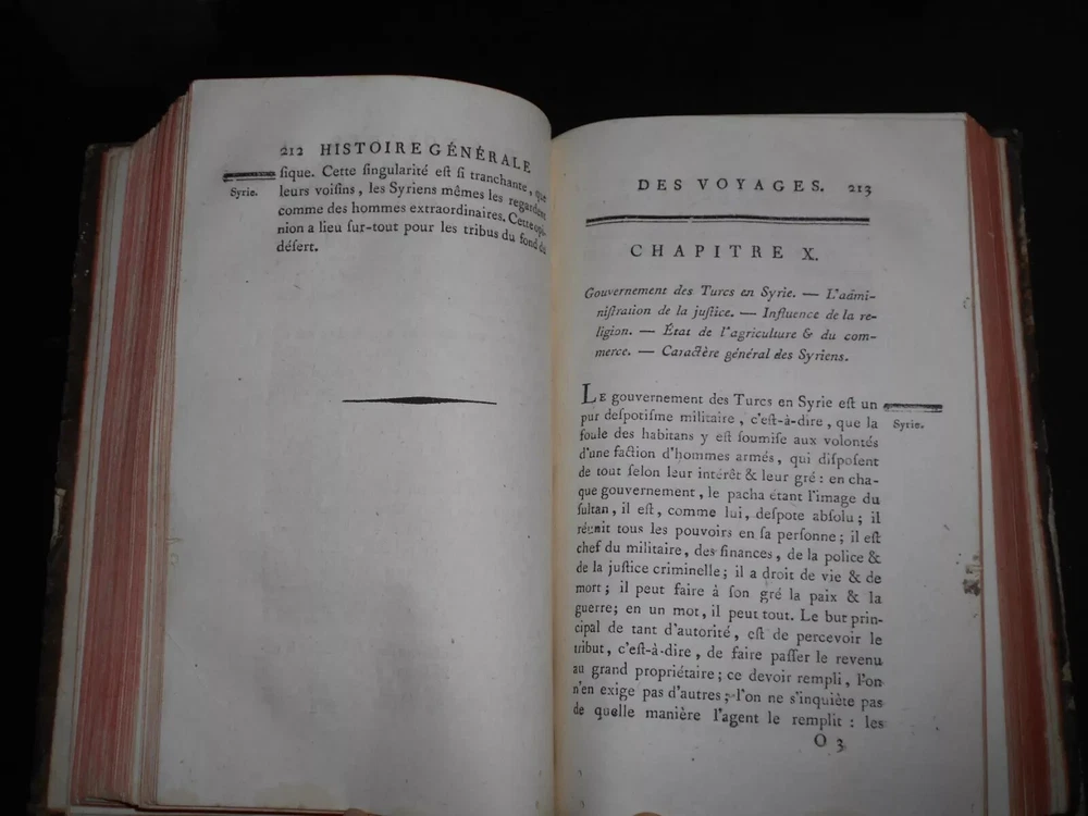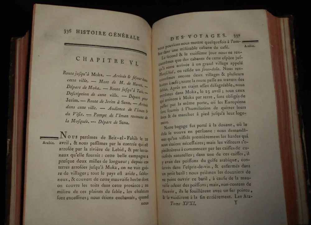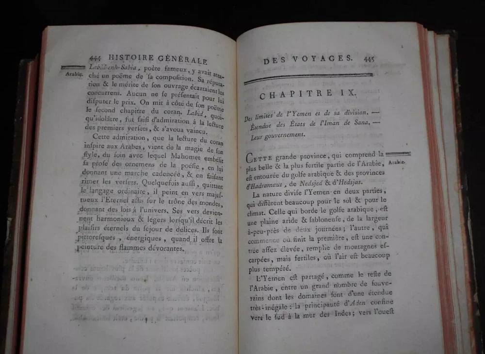 Antique travel book . Tome vingt-sixieme (Volume XXVI). A Paris, chez Moutardier, MDCCLXXXXIX/MDCCC ( 1799/1800 ). Illustrated with 2 fine fold-out engravings (one depicting a Sacred Camel in Mecca and the other a view of the ancient city of Baalbeck). Among the contents: Voyage de Richard Pockoke dans la Syrie, Caractere general de ses habitans, De la Palestine en general, Depart de Damiette, De Rama, Entree a Jerusalem, Pelerinage, De la ville de Saide, jadis Sidon, Du village de Sour, jadis Tyr, Du Mont-Carmel, Du Mont-Thabor, De la Mer de Tiberiade, Des montagnes de Castravan et des endroits qui sont sur la route de Tripoli, Des cedres du Liban, Route de Tripoli a Baalbeck, Ruines de Palmyre, Digression sur Odenat et Zenobie, Route de Damas a Alep, par Hems, l'ancienne Emese, Etat actuel d'Alexandrette, Du Deabekir ou de la Meopotamie, De Diarbeck et de Bagdad, Climat de la Syrie, Les Turcomans, les Kourdes, les Arabes, Gouvernement des Turcs en Syrie, L'administration de la justice, Influence de la religion, Etat de l'agriculture et du commerce, Voyage du Caire a Suez, Du Mont Sinai et du couvent de Sainte-Catherine, Description de l'Arabie, Gouvernement des Arabes, Route jusqu'a Moka, Audience de l'Iman et du Visir, De la ville de la Mecque, Pelerinage des Musulmans du Keabe, Ceremonies observes par les Pelerins, Du Scherif de la Mecque et du Pacha de Dsjidda, De la ville de Medine et du Sepulchre du Prophete, Courte notice du Couran, Des limites de l'Yemen, Etablissements des Arabes sur les cotes de Perse. Leather binding. Text in french. 532 pages, 19 x 12.5 x 3.5 cm. Good condition in general ( foxi ng, yellow/brown stains, some creased pages’ corners, merely worn cover, rubbing on boards' corners/edges/stains/splotchy parts/missing pieces/fragile parts/holes, leather on boards' edges is more worn and partly unmounted from the surface of edges, &c). Shipping (registered letter) worldwide: $25.
