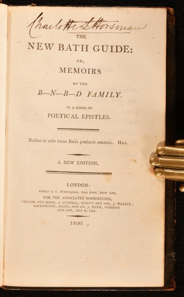 Click here to see our other books! The New Bath Guide: or, Memoirs of the B-N-R-D Family [Christopher Anstey] 1800 C. Whittingham; Vernor and Hood; J. Cuthell; et al : London 6.5" by 4" viii, 155, [5pp] SUMMARY The popular poem by Christopher Anstey in which he satirises the society of Bath during its heyday, complete with plates. Illustrated,Leather Binding Overall Condition: Good This book weighs 0.5 KG when packed UK Postage: £ 3.99 US Postage: £ 15.99 EU Postage : £ 13.99 European Postage: £ 14.99 Asia Postage: £ 18.99 Worldwide Postage: £ 19.99 DESCRIPTION A new edition of this work. A collection of fifteen poetical letters showing a satirical view of the fashionable live in Bath in the eighteenth century, following the adventures of three naive children of a Northern squire whilst on a visit to the city. This was Christopher Anstey's most popular work, and he never quite recaptured the success of this work, which was constantly in print during his lifetime. Illustrated with five plates. With five pages of publisher's adverts to the rear. Collated, complete. CONDITION In a full calf binding. Externally, a little worn, with a damp stain to the front board, and a smaller damp stain to the rear board. Light rubbing to the boards and spine. Minor bumping to the extremities. Internally, firmly bound. Pages are a little age-toned with some spots, mostly to the plates. Overall Condition: Good GLOSSARY OF TERMS Overall Condition (Dustwrapper condition rating is shown after that for the book itself, where a dustwrapper is present) Fine - Very well preserved copy showing very little wear Very Good Indeed - Only one or two minor faults, really a very attractive copy Very Good - Quite a wide term meaning no major faults but probably several smaller ones often expected given the age of the book, but still a respectable copy Good - Meaning not very good. Some more serious faults as will be described in the condition report under 'condition' Good Only - Meaning one or more faults that could really do with repair Fair - As with good only above but with other faults leaving a compromised copy even after repair Poor - Really bad and possibly seriously incomplete. We only sell books in this condition where their rarity or value makes them attractive none the less. Major defects will be described. GUARANTEE We offer a full money back guarantee on our descriptions. Please ask for details and conditions. We prefer PAYPAL. If you pay via PAYPAL we will post the item off the same or the next working day with the postage you have selected. Please note we cannot accept USD cheques