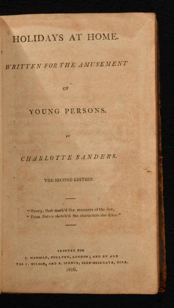 Click here to see our other books! Holidays at Home. Written for the Amusement of Young Persons. Charlotte Sanders 1806 J. Mawman : London 7" by 4" 312pp. SUMMARY The second edition of this very scarce collection of amusing moral tales for children, written by Charlotte Sanders. Early Edition,Leather Binding,Very Scarce Overall Condition: Very Good This book weighs 0.5 KG when packed UK Postage: £ 3.99 US Postage: £ 15.99 EU Postage : £ 13.99 European Postage: £ 14.99 Asia Postage: £ 18.99 Worldwide Postage: £ 19.99 DESCRIPTION Second edition. First published in 1803. Bound in full calf, rebacked and with a contemporary spine. Illustrated with a frontispiece. Collated, complete. A collection of humorous educational tales for young people written by Charlotte Sanders, an English author known for her children's fiction and poetry. With three pages of publisher's advertisements to the rear. With an ink inscription of Jane Ball, dated 1810. CONDITION Bound in full calf, rebacked and with a contemporary spine. Externally, very good, with rubbing causing a little loss to the extremities. Ink inscription to front free endpaper. Internally, firmly bound. Pages are bright and clean, with the occasional mark and a few light spots. Overall Condition: Very Good GLOSSARY OF TERMS Overall Condition (Dustwrapper condition rating is shown after that for the book itself, where a dustwrapper is present) Fine - Very well preserved copy showing very little wear Very Good Indeed - Only one or two minor faults, really a very attractive copy Very Good - Quite a wide term meaning no major faults but probably several smaller ones often expected given the age of the book, but still a respectable copy Good - Meaning not very good. Some more serious faults as will be described in the condition report under 'condition' Good Only - Meaning one or more faults that could really do with repair Fair - As with good only above but with other faults leaving a compromised copy even after repair Poor - Really bad and possibly seriously incomplete. We only sell books in this condition where their rarity or value makes them attractive none the less. Major defects will be described. GUARANTEE We offer a full money back guarantee on our descriptions. Please ask for details and conditions. We prefer PAYPAL. If you pay via PAYPAL we will post the item off the same or the next working day with the postage you have selected. Please note we cannot accept USD cheques