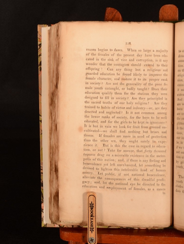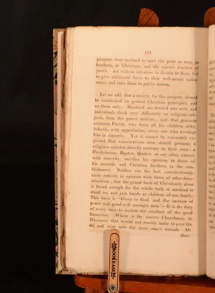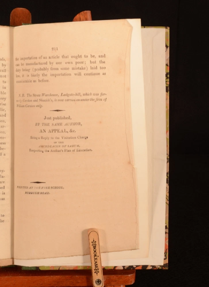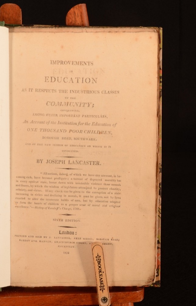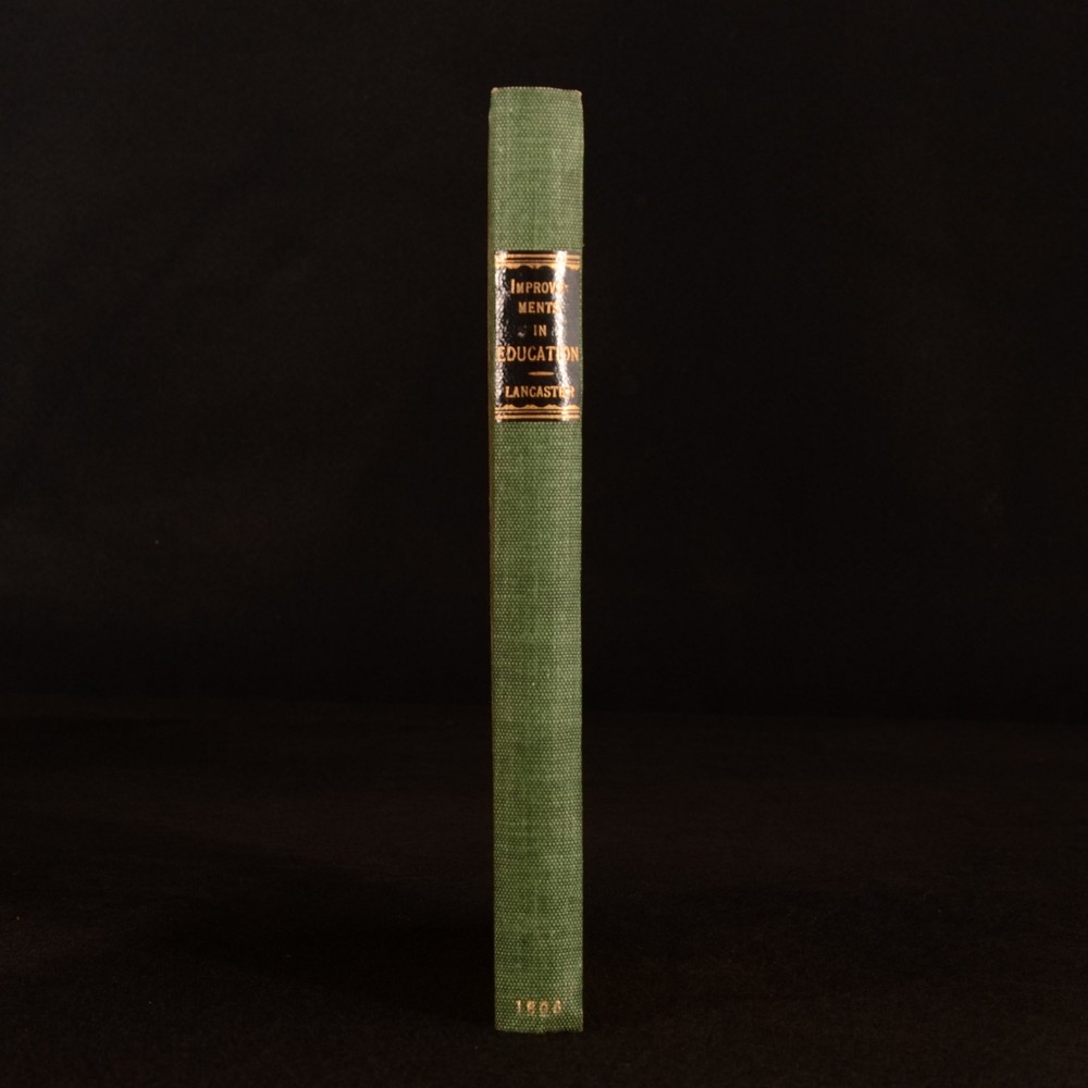 Click here to see our other books! Improvements in Education Joseph Lancaster 1806 J Lancaster : London 9.5" by 5.5" xvi, 211pp SUMMARY A sixth edition copy of Joseph Lancaster's renowned early nineteenth century treatise on education. Leather Binding,Pleasing Copy,Rebound Overall Condition: Very Good Indeed This book weighs 0.5 KG when packed UK Postage: £ 3.99 US Postage: £ 15.99 EU Postage : £ 13.99 European Postage: £ 14.99 Asia Postage: £ 18.99 Worldwide Postage: £ 19.99 DESCRIPTION Joseph Lancaster was an English Quaker and public education innovator, renowned for developing a variant of the monitorial system with a recursive method of instruction and delivery. As a precursor to the modern-day method of 'peer tutoring', within this method students were rewarded for successfully passing on information to the next pupil. Printed and Sold by J. Lancaster Free School Borough Road; Darton and Harvey Gracechurch Street and Hatchard Piccadilly This work succinctly details Lancaster's methods and was written by Lancaster shortly before he travelled to the United States to lecture and promote his ideas. The height of popularity of his system came in the first decades of the nineteenth century, and in 1808 "The Society for Promoting the Lancasterian System for the Education of the Poor" was created. This is a very important work in the history of education. Rebound in a lovely quarter cloth binding with marbled paper boards and morocco label tipped to spine. CONDITION Externally lovely with minor shelfwear to extremities and head and tail of spine. Hinges reinforced. Bookseller's label tipped to front pastedown. Internally firmly bound. Pages age toned but bright, with the odd spot to the occasional page and age toning to textblock. Overall Condition: Very Good Indeed GLOSSARY OF TERMS Overall Condition (Dustwrapper condition rating is shown after that for the book itself, where a dustwrapper is present) Fine - Very well preserved copy showing very little wear Very Good Indeed - Only one or two minor faults, really a very attractive copy Very Good - Quite a wide term meaning no major faults but probably several smaller ones often expected given the age of the book, but still a respectable copy Good - Meaning not very good. Some more serious faults as will be described in the condition report under 'condition' Good Only - Meaning one or more faults that could really do with repair Fair - As with good only above but with other faults leaving a compromised copy even after repair Poor - Really bad and possibly seriously incomplete. We only sell books in this condition where their rarity or value makes them attractive none the less. Major defects will be described. GUARANTEE We offer a full money back guarantee on our descriptions. Please ask for details and conditions. We prefer PAYPAL. If you pay via PAYPAL we will post the item off the same or the next working day with the postage you have selected. Please note we cannot accept USD cheques