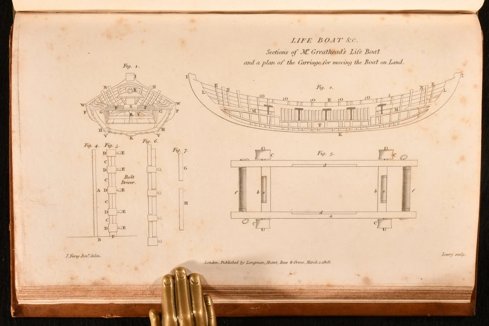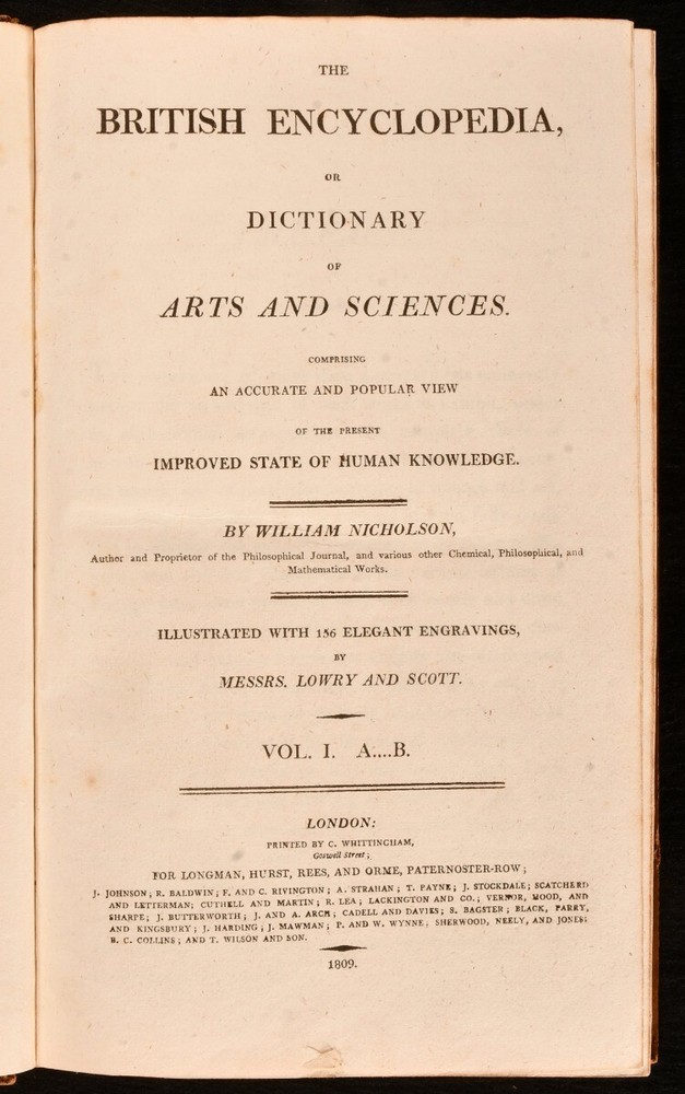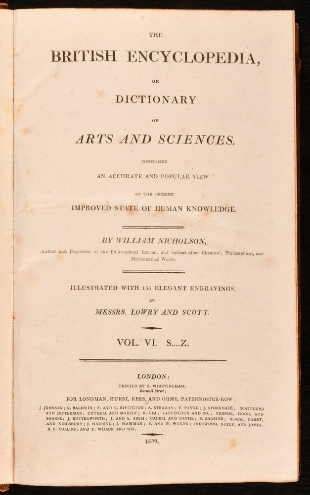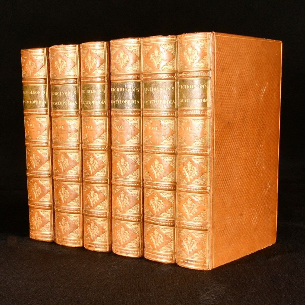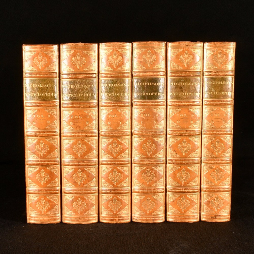 Click here to see our other books! The British Encyclopedia, or Dictionary of Arts and Sciences William Nicholson 1809 C. Whittingham for Longman, Hurst, Rees et al : London 9" by 6" Unpaginated SUMMARY A beautifully illustrated six volume encyclopaedia by the chemist William Nicholson, in lovely diced calf bindings. Illustrated,Leather Binding Overall Condition: Very Good This book weighs 5 KG when packed UK Postage: £ 4.49 US Postage: £ 42.99 EU Postage : £ 27.99 European Postage: £ 45.99 Asia Postage: £ 74.99 Worldwide Postage: £ 129.99 DESCRIPTION A complete six volume set of this enormously informative work. Illustrated with 155 plates in total; twenty-seven to volume I; thirty-three to volume II; twenty-four to volume III; twenty-four to volume IV; twenty-six to volume V, and twenty-one to volume VI. Collated, complete. This richly illustrated alphabetically arranged encyclopaedia includes entries on subjects surrounding maths, horology, architecture, heraldry, astronomy, microscopes, entomology, and other diverse topics such as lifeboats and Rowntree's Beer Engine. CONDITION In full diced calf bindings, with gilt detailing to back strip. Minor rubbing to joints, otherwise externally lovely. Front hinges of volume II and IV strained, but firmly held. Internally, firmly bound. Foxing to plates of volumes II, III, IV, and VI, with foxing most significant to volume V. Offsetting to pages facing plates. Overall Condition: Very Good GLOSSARY OF TERMS Overall Condition (Dustwrapper condition rating is shown after that for the book itself, where a dustwrapper is present) Fine - Very well preserved copy showing very little wear Very Good Indeed - Only one or two minor faults, really a very attractive copy Very Good - Quite a wide term meaning no major faults but probably several smaller ones often expected given the age of the book, but still a respectable copy Good - Meaning not very good. Some more serious faults as will be described in the condition report under 'condition' Good Only - Meaning one or more faults that could really do with repair Fair - As with good only above but with other faults leaving a compromised copy even after repair Poor - Really bad and possibly seriously incomplete. We only sell books in this condition where their rarity or value makes them attractive none the less. Major defects will be described. GUARANTEE We offer a full money back guarantee on our descriptions. Please ask for details and conditions. We prefer PAYPAL. If you pay via PAYPAL we will post the item off the same or the next working day with the postage you have selected. Please note we cannot accept USD cheques