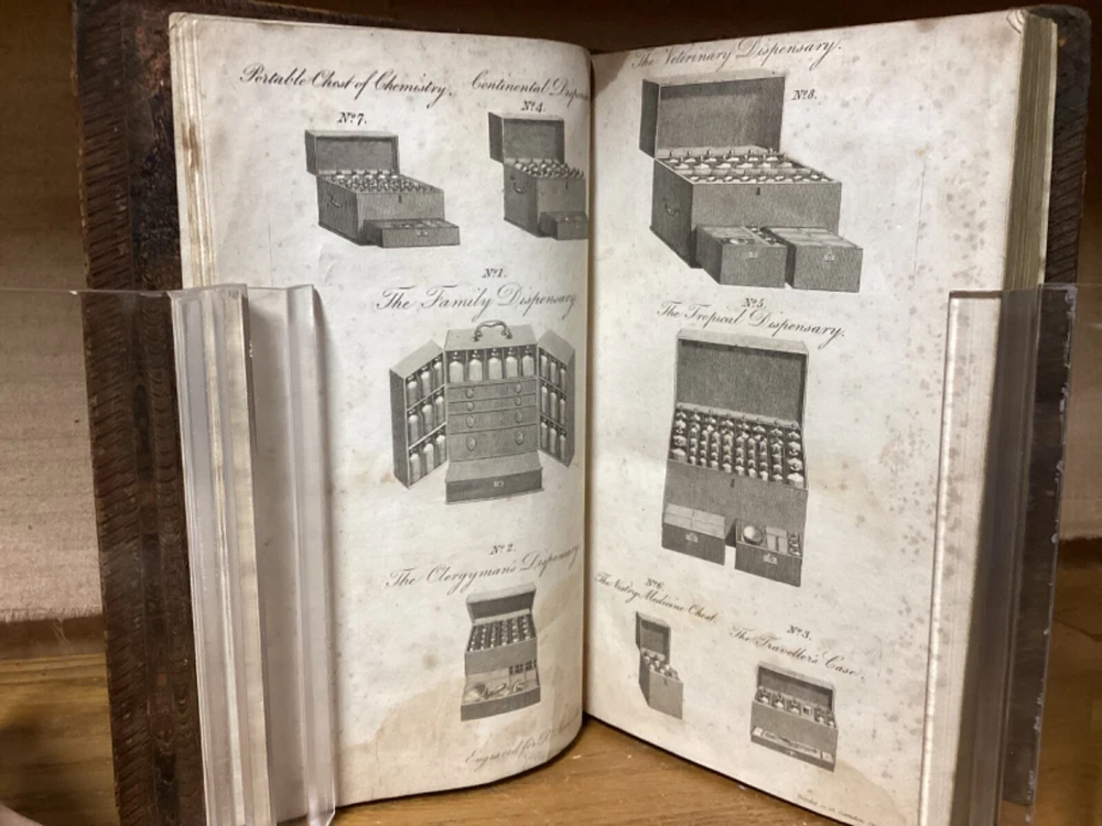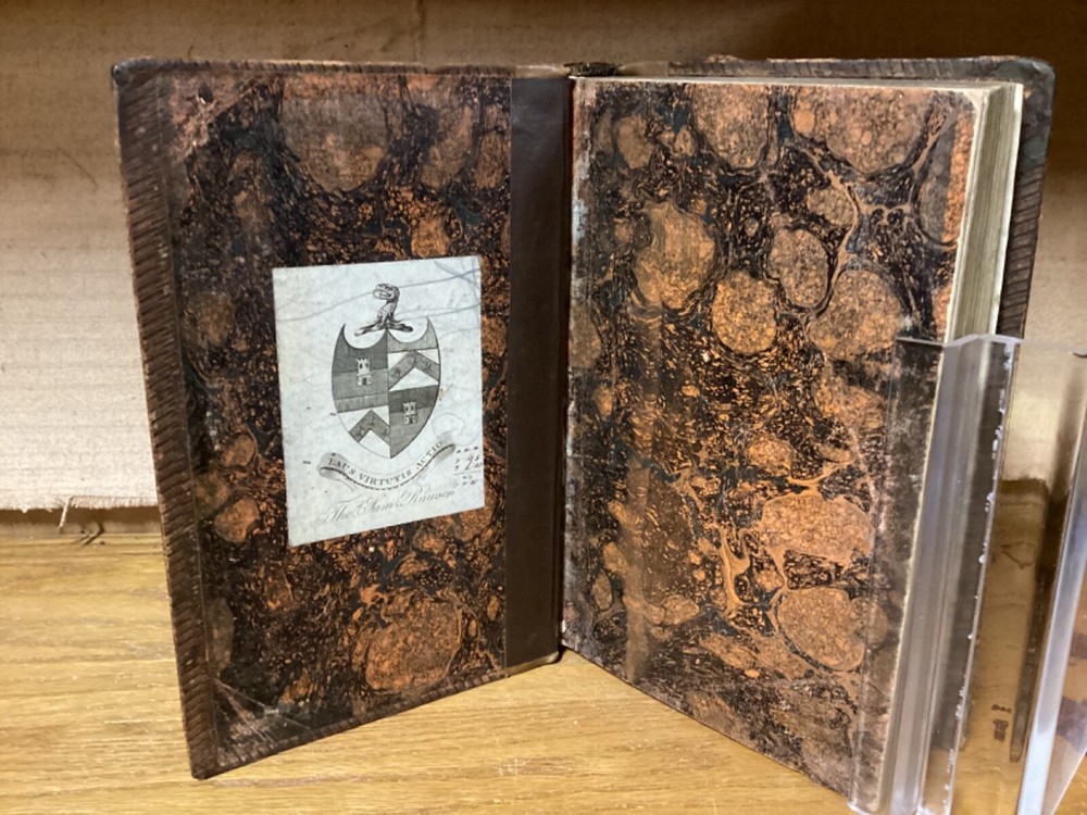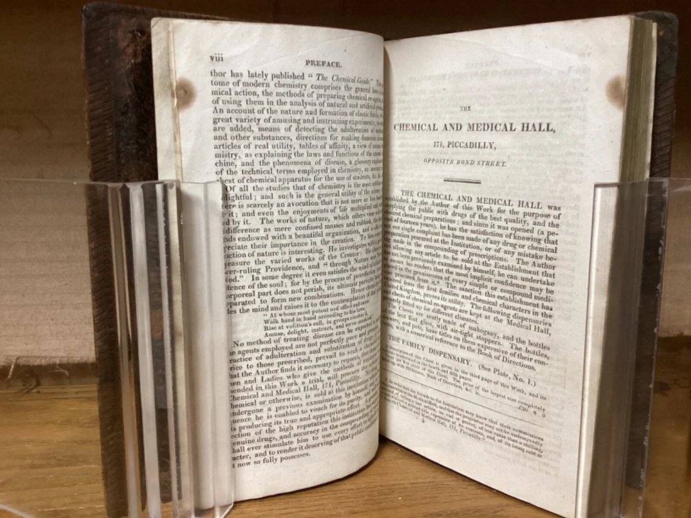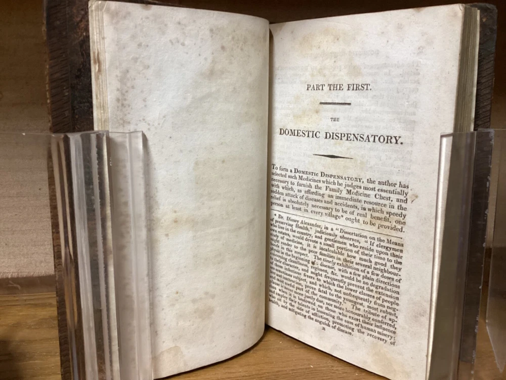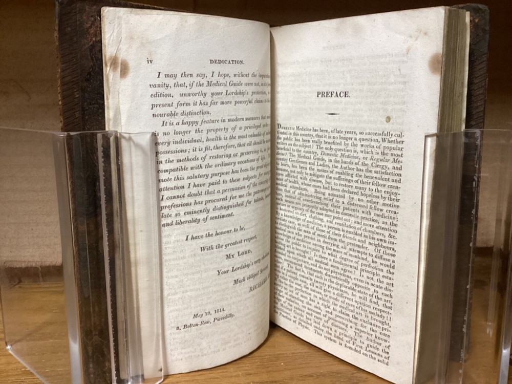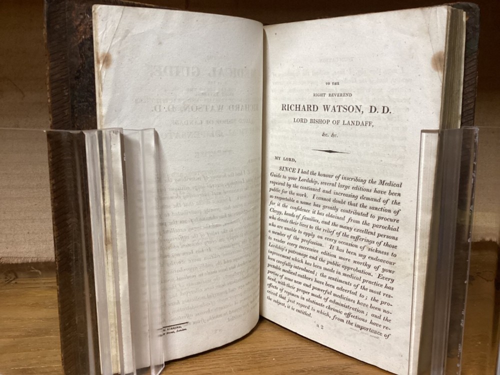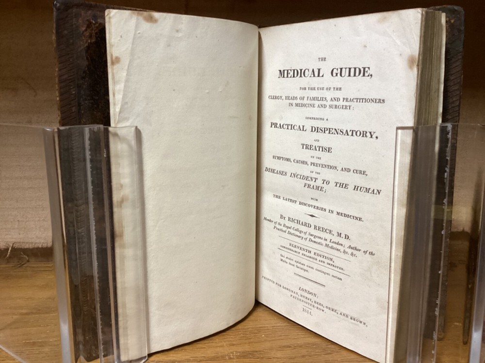 The Medical Guide, for the use of the Clergy, Heads of Families, and Practitioners in Medicine and Surgery: Comprising a Practical Dispensatory, and Treatise on the Symptoms, Causes, Prevention, and Cure of the Diseases Incident to the Human Frame. By Richard Reece and printed in London for Longman, Hurst, Rees, Orme, and Brown. 1814, 484 pp + index. 8.75” x 5.75”, 8vo, hardcover rebacked full leather. In good rebacked condition, with rubbing to edges and corners of boards. Hinges reinforced and in good condition. Text block remains bound well, with looseness to first tissue guard at front. Light markings and marginalia, along with bookplate to front pastedown. Includes two pages of images of dispensary chests. General age-related toning to pages, along with periodic foxing and wear. Please see photographs and ask any questions prior to purchasing. A scarce early 19th Century medical guide. Nicely restored and preserved. Richard Reece (1775-1831) was a British doctor and prolific author, having helped develop several types of medicine during his lifetime. COLN1814ADFX-0724-aj1969