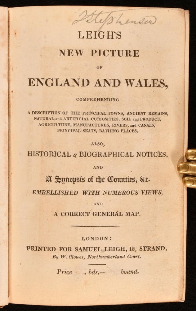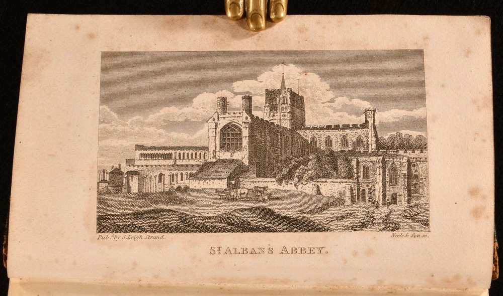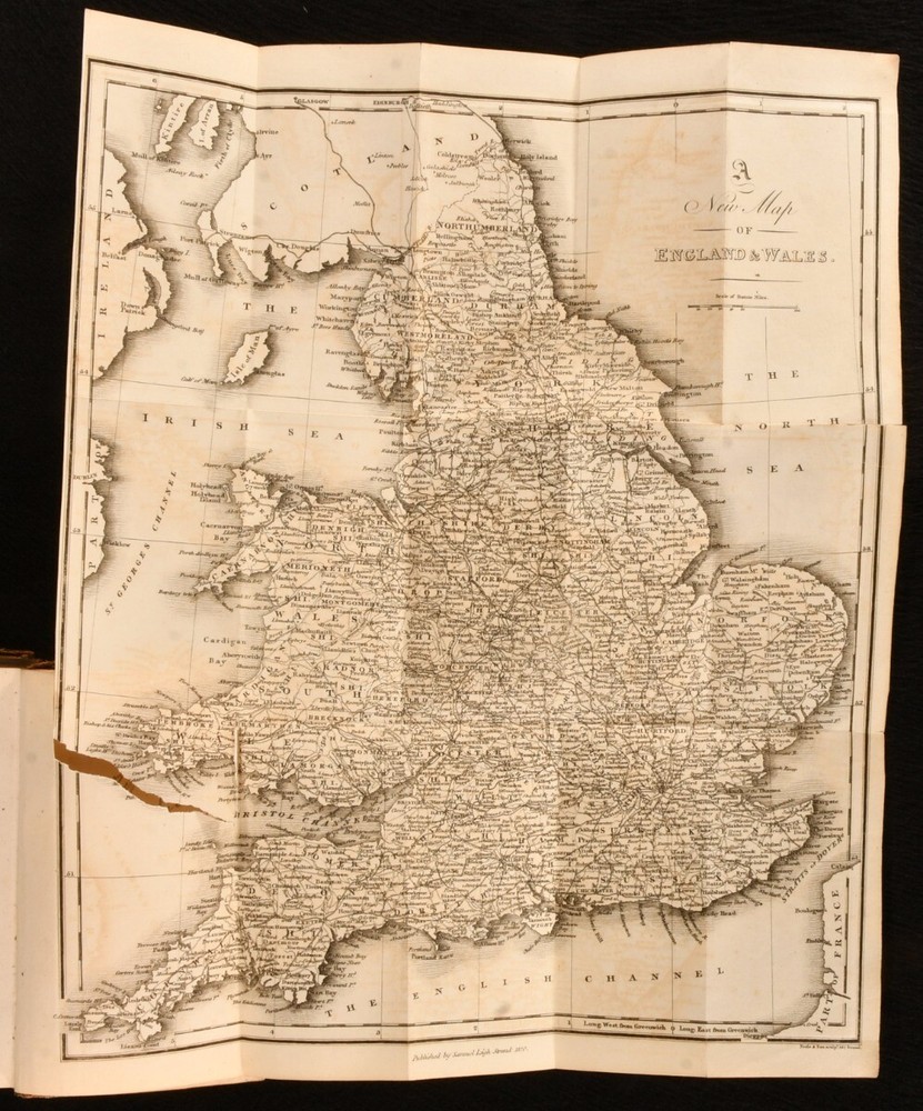 Click here to see our other books! Leigh's New Picture of England and Wales Not Stated 1820 Samuel Leigh; W. Clowes : London 5.5" by 3.5" viii, 693, 11pp SUMMARY A very scarce illustrated topographical guide to England and Wales, published by Samuel Leigh, including a folding map. Folding Maps,Illustrated,Leather Binding,Very Scarce Overall Condition: Good Only This book weighs 0.5 KG when packed UK Postage: £ 3.99 US Postage: £ 15.99 EU Postage : £ 13.99 European Postage: £ 14.99 Asia Postage: £ 18.99 Worldwide Postage: £ 19.99 DESCRIPTION A very scarce work. Illustrated with a frontispiece, a folding map, and twenty-nine plates. A fantastic topographical exploration of England and Wales, describing the principal towns, ancient remains, agriculture, principal seats, rivers, and more, as well as historical and biographical notices. This work approaches the two countries county by county, discussing the important historical notes and features in each county, highlighted by detailed engraved plates. Undated, dated from the map, and from Jisc from a copy held at the British Library. Eleven pages of adverts to the rear. CONDITION In the original morocco binding. Externally, the front board is held by two cords only, and may detach with further handling. Light bumping to the extremities. Loss to the tail of the spine, a smaller amount of loss to the head and to the rear joint. Light marks and discolouration to the boards and spine. Rubbing to the spine and extremities. Front endpaper is detached but present. Internally, firmly bound. Pages are bright and clean. Closed tear to the folding map. Overall Condition: Good Only GLOSSARY OF TERMS Overall Condition (Dustwrapper condition rating is shown after that for the book itself, where a dustwrapper is present) Fine - Very well preserved copy showing very little wear Very Good Indeed - Only one or two minor faults, really a very attractive copy Very Good - Quite a wide term meaning no major faults but probably several smaller ones often expected given the age of the book, but still a respectable copy Good - Meaning not very good. Some more serious faults as will be described in the condition report under 'condition' Good Only - Meaning one or more faults that could really do with repair Fair - As with good only above but with other faults leaving a compromised copy even after repair Poor - Really bad and possibly seriously incomplete. We only sell books in this condition where their rarity or value makes them attractive none the less. Major defects will be described. GUARANTEE We offer a full money back guarantee on our descriptions. Please ask for details and conditions. We prefer PAYPAL. If you pay via PAYPAL we will post the item off the same or the next working day with the postage you have selected. Please note we cannot accept USD cheques