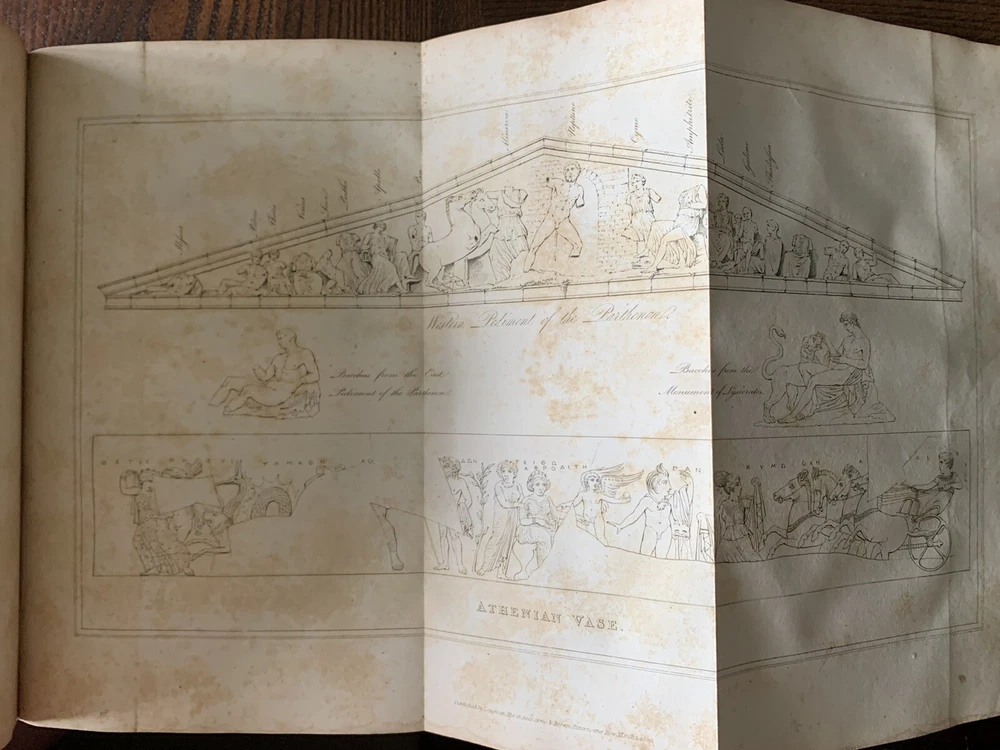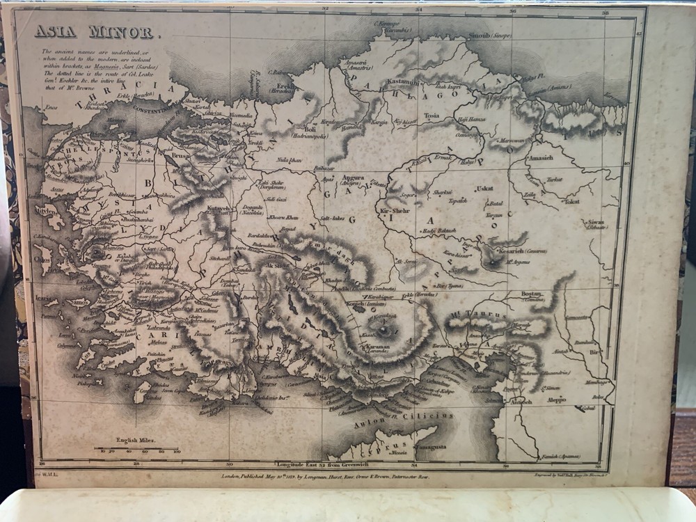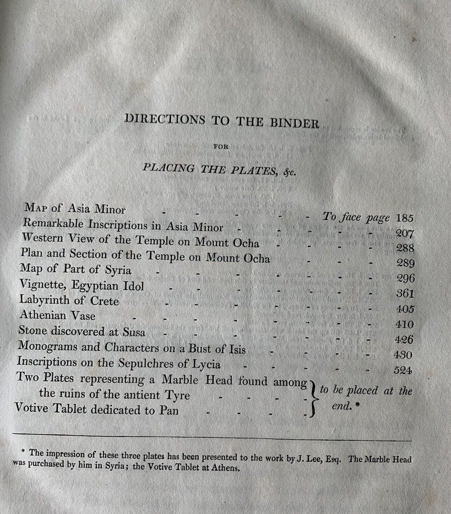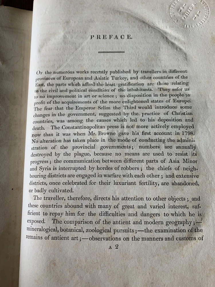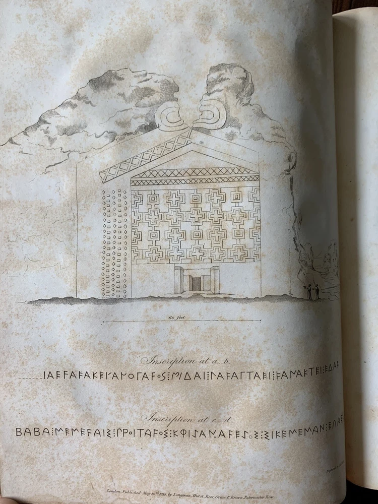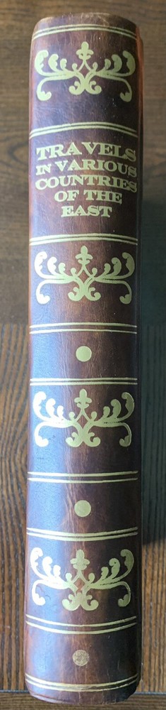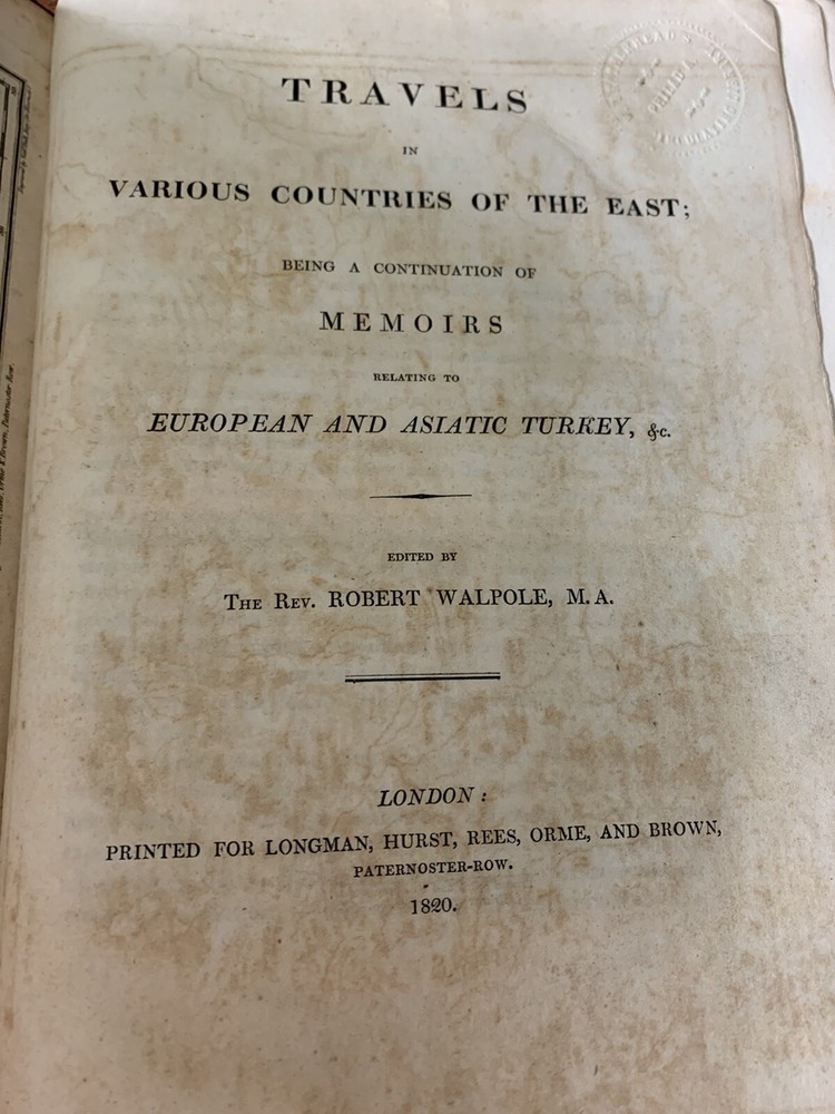 1820 Robert Walpole Travels East Greek Greeks Cyprus Greece Turks Turkey Armenia. First Edition. Modern leather spine, new recent binding. Plates have foxing. Book is over 200 years old, first Edition. Map has been moved from facing page 185 to facing page one. Very rare, printed in London in 1820 Travels in Various Countries of the East; Being a Continuation of Memoirs Relating to European and Asiatic Turkey, &c Walpole, Robert [ed.] Published by Longman, Hurst, Rees, Orme, and Brown, London, 1820. Nicely rebacked. 11" x 9" size. xxi, 603pp, + appendix and plates. The book has 2 maps and many plates, some folding, one engraved. Heavy item - in Good condition. Some offsetting and browning to plates and some light scattered spotting to text.