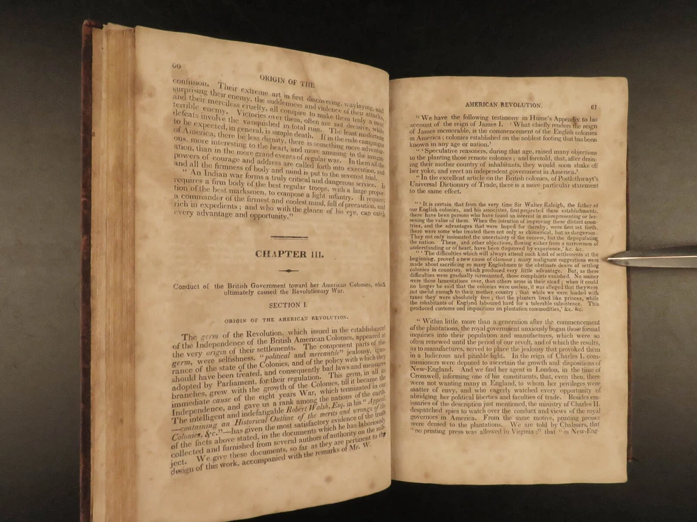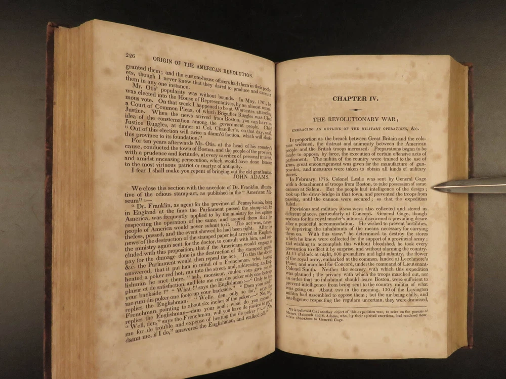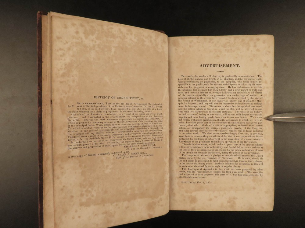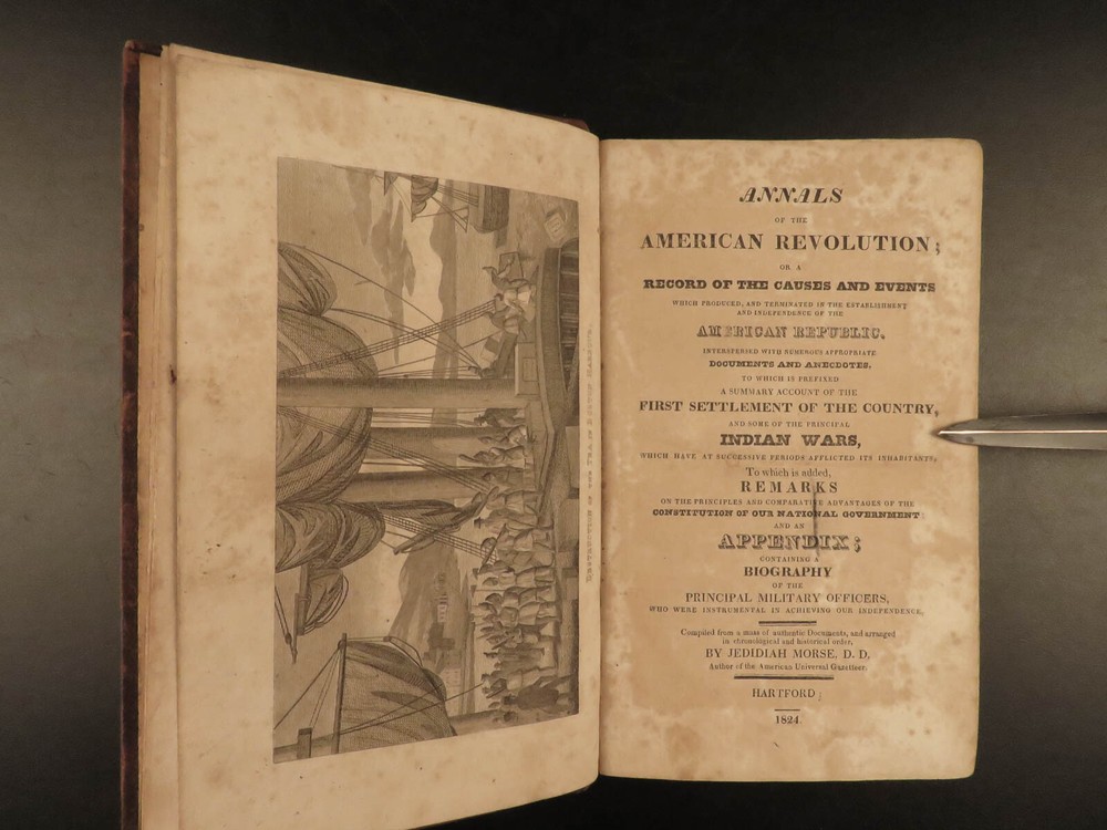 1824 American Revolution Annals Jedidiah Morse INDIAN WARS Battle Illustrated Jedidiah Morse was an important and prominent geographer known for his American textbooks, books that earned him the name ‘father of American geography.’ This ‘ Annals of the American Revolution ’ is a chronological history of the early settlement of America, the Indian Wars, and the Revolution, with biographical sketches of army officers, and six illustrated plates depicting various battles and events. Larned states, “ This was for many years the standard book on the Revolution …” Item number: #16481 Price: $499 MORSE, Jedidiah Annals of the American Revolution; or, A record of the causes and events which produced, and terminated in the establishment and independence of the American Republic... Hartford: [1824]. Details : · Collation: Complete with all pages o [4], 400, 50 o 6 engraved plates · References: Howes M 840; Sabin 50927; Field 1097; Larned 1440 · Provenance: Bookplate – Edward Hooker o Possibly Commander Edward Hooker (1822-1903), a Union commanding officer for the Potomac Flotilla, a unit of the United States Navy created in the early days of the American Civil War to secure Union communications in the Chesapeake Bay, the Potomac River and their tributaries, and to disrupt Confederate communications and shipping in the same. · Language: English · Binding: Leather; tight & secure · Size : ~8.75in X 5.5in (22.5cm x 14cm) Our Guarantee: Very Fast. Very Safe. Free Shipping Worldwide. Customer satisfaction is our priority! Notify us with 7 days of receiving, and we will offer a full refund without reservation! 16481