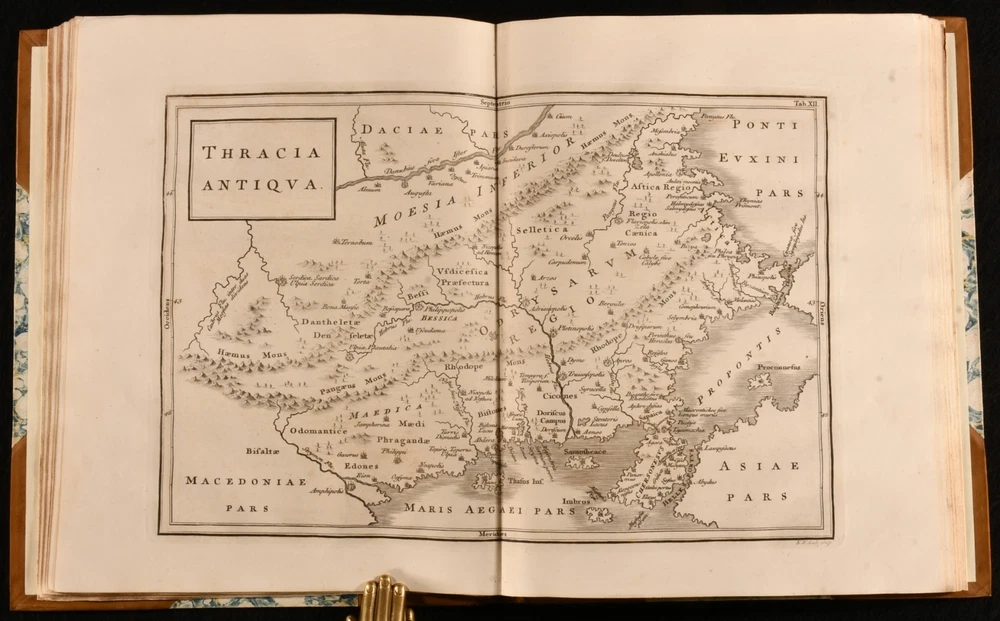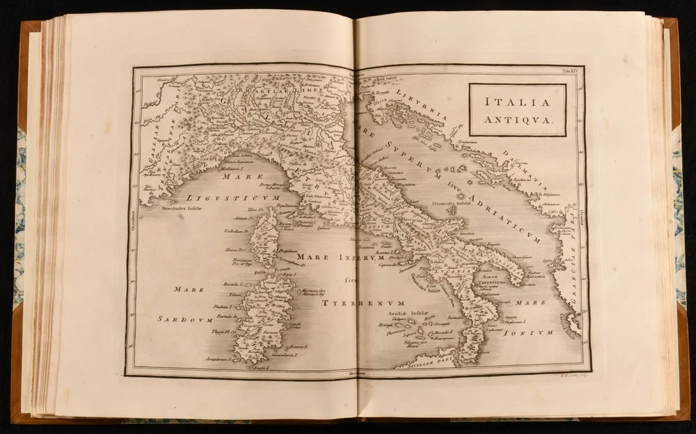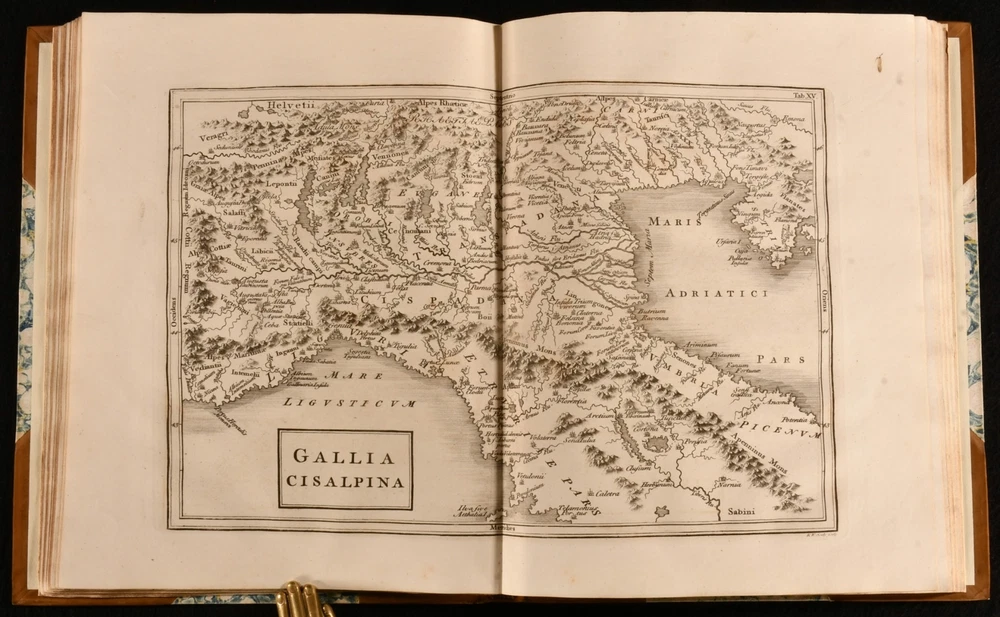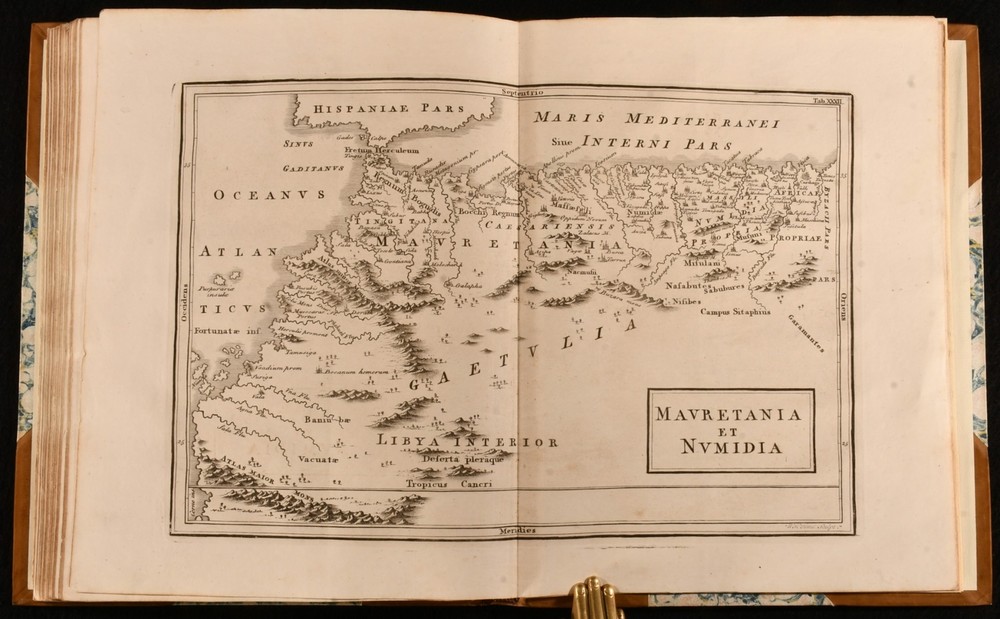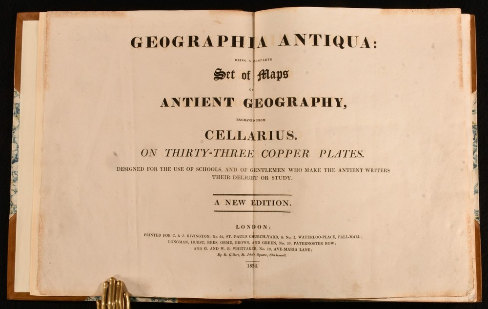 Click here to see our other books! Geographia Antiqua: Being a Set of Maps of Antient Geography, Engraved from Cellarius. Andreas Cellarius 1824 C. & J. Rivington : London 10.5" by 9" [70] pp SUMMARY A 'New Edition' of Cellarius's guide to the ancient world, consisting of thirty-three copper plate double page maps, titled in Latin, and in a lovely half calf binding. Illustrated,Leather Binding,Rebound Overall Condition: Near Fine This book weighs 1 KG when packed UK Postage: £ 3.99 US Postage: £ 22.99 EU Postage : £ 16.99 European Postage: £ 17.99 Asia Postage: £ 22.99 Worldwide Postage: £ 28.99 DESCRIPTION Consisting of a double page title page, double page contents leaf, and thirty-three double page engraved plates. Collated, complete. Cellarius's maps include depictions of the interior of Africa, Egypt, Thrace, Italy and Mesopotamia. The work of Dutch-German cartographer and cosmographer Andreas Cellarius, best known for his 1660 major star atlas, 'Harmonia Macrocosmica'. With the inscriptions of John Fressman and M. Perkins, dated March 22nd 1827, to the recto of the title page. With the subtitle 'Designed for the use of schools, and of gentlemen who make the antient writers their delight or study', this is a charming visual guide to the geography of the ancient world. CONDITION Rebound in half calf, with marbled paper covered boards, and endpapers renewed. Externally, fine. Contemporary inscription to recto of title page. Internally, firmly bound. The odd spot and instances of light handling marks throughout, with pages otherwise clean and bright. Overall Condition: Near Fine GLOSSARY OF TERMS Overall Condition (Dustwrapper condition rating is shown after that for the book itself, where a dustwrapper is present) Fine - Very well preserved copy showing very little wear Very Good Indeed - Only one or two minor faults, really a very attractive copy Very Good - Quite a wide term meaning no major faults but probably several smaller ones often expected given the age of the book, but still a respectable copy Good - Meaning not very good. Some more serious faults as will be described in the condition report under 'condition' Good Only - Meaning one or more faults that could really do with repair Fair - As with good only above but with other faults leaving a compromised copy even after repair Poor - Really bad and possibly seriously incomplete. We only sell books in this condition where their rarity or value makes them attractive none the less. Major defects will be described. GUARANTEE We offer a full money back guarantee on our descriptions. Please ask for details and conditions. We prefer PAYPAL. If you pay via PAYPAL we will post the item off the same or the next working day with the postage you have selected. Please note we cannot accept USD cheques