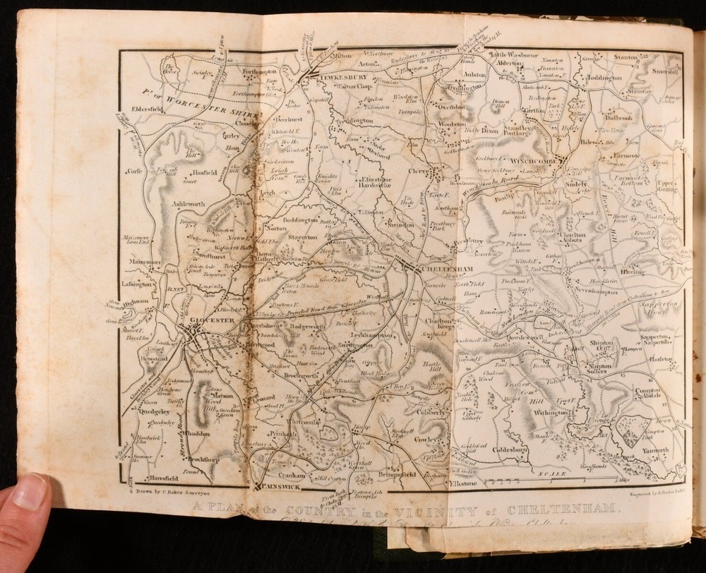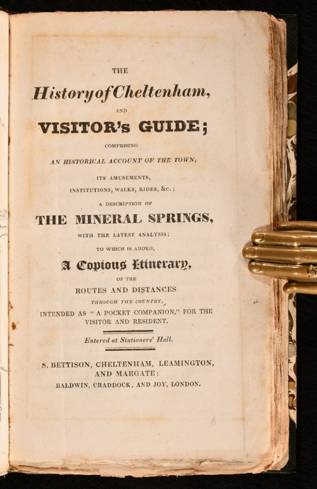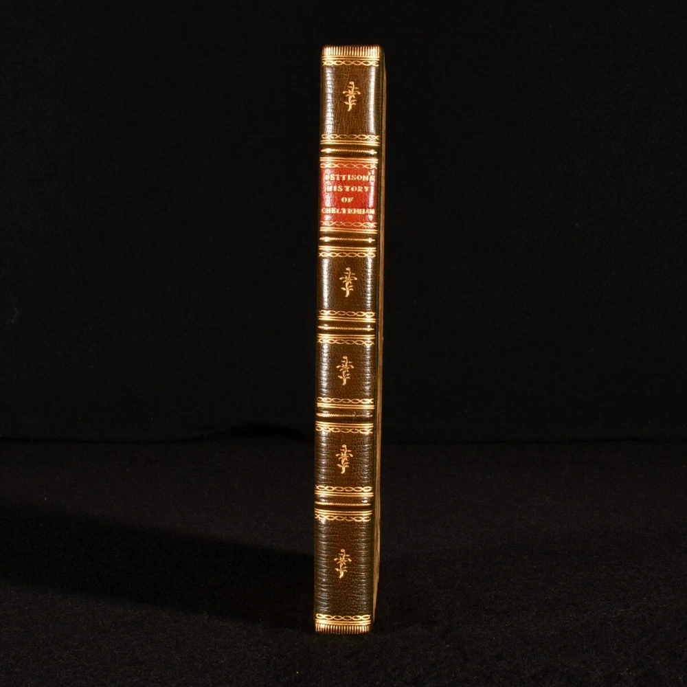 Click here to see our other books! The History of Cheltenham, and Visitor's Guide; Comprising an Historical Account of the Town, its Amusements, Institutions, Walks, Rides, &C. A Description of the Mineral Springs, With the Latest Analysis; to Which is Added a Copious Itinerary, of the Routes and Distances Through the Country, Intended as 'A Pocket Companion', for the Visitor and Resident Not Stated 1825 S. Bettison; Baldwin, Craddock, and Joy : Cheltenham; London 8" by 5" [5], vi-xii, [1], 14-201, [3pp] SUMMARY A very scarce illustrated Georgian guide and history of Cheltenham, a nice volume complete with a folding map. Folding Maps,Illustrated,Leather Binding,Very Scarce Overall Condition: Very Good This book weighs 0.5 KG when packed UK Postage: £ 3.99 US Postage: £ 15.99 EU Postage : £ 13.99 European Postage: £ 14.99 Asia Postage: £ 18.99 Worldwide Postage: £ 19.99 DESCRIPTION A very scarce work. Original blue wraps bound in. Illustrated with a folding map to the frontispiece, and seven plates. Bettison's comprehensive visitor's guide and history of Cheltenham, a useful pocket guide for the resident and visitor. A charming work that shows the town as it was during its heyday. Cheltenham started to rapidly gain popularity after the discovery of mineral springs in 1716, the town subsequently becoming a popular resort in Georgian England. Notable residents include Sarah Burney and Eddie the Eagle. Undated, dated from Jisc from a copy held at the British Library. Two pages of adverts to the rear. CONDITION Rebound in a half straight grain morocco binding with marbled paper to the boards. Externally, smart. Spine is very lightly faded. Prior owner's ink inscription to the recto to the front endpaper. Internally, firmly bound. Pages are lightly age-toned and generally clean with occasional spots. Folding map has been closely trimmed to the bottom edge, affecting the caption. Some pages unopened to the top edge. Overall Condition: Very Good GLOSSARY OF TERMS Overall Condition (Dustwrapper condition rating is shown after that for the book itself, where a dustwrapper is present) Fine - Very well preserved copy showing very little wear Very Good Indeed - Only one or two minor faults, really a very attractive copy Very Good - Quite a wide term meaning no major faults but probably several smaller ones often expected given the age of the book, but still a respectable copy Good - Meaning not very good. Some more serious faults as will be described in the condition report under 'condition' Good Only - Meaning one or more faults that could really do with repair Fair - As with good only above but with other faults leaving a compromised copy even after repair Poor - Really bad and possibly seriously incomplete. We only sell books in this condition where their rarity or value makes them attractive none the less. Major defects will be described. GUARANTEE We offer a full money back guarantee on our descriptions. Please ask for details and conditions. We prefer PAYPAL. If you pay via PAYPAL we will post the item off the same or the next working day with the postage you have selected. Please note we cannot accept USD cheques