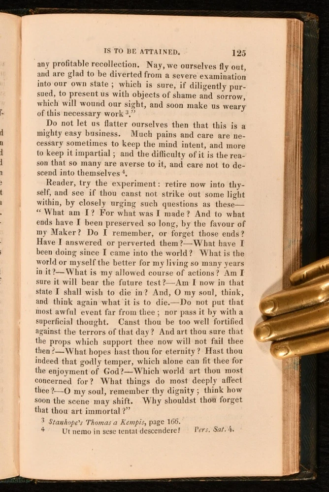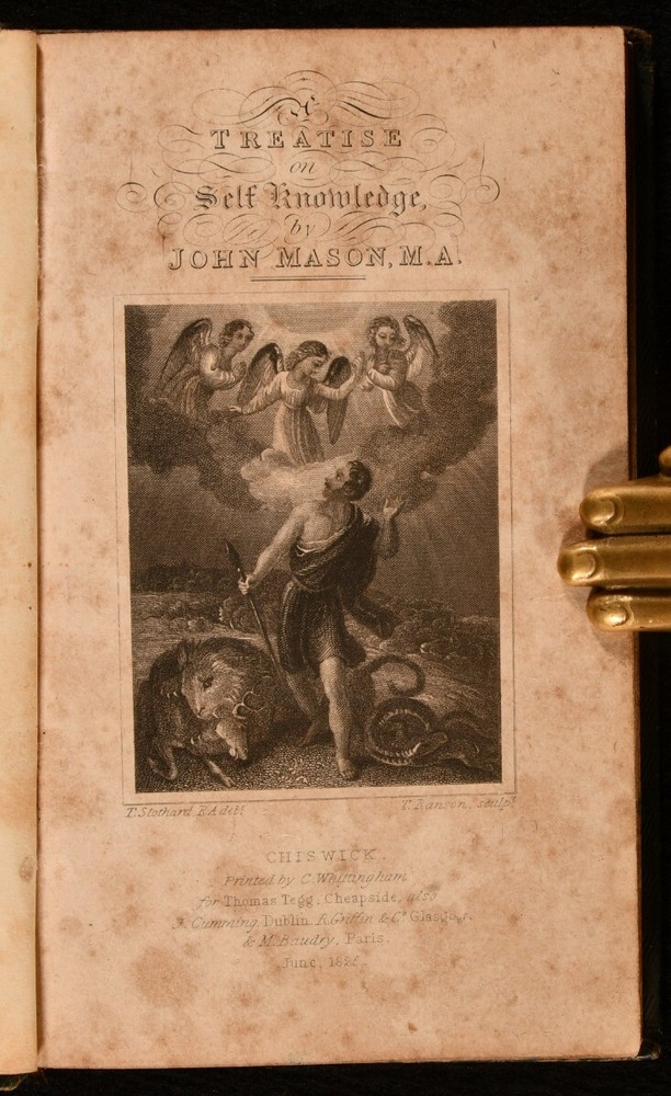 Click here to see our other books! Self-Knowledge. A Treatise, Showing the Nature and Benefit of that Important Science John Mason 1825 C. & C. Whittingham : Chiswick 5.5" by 3.5" vi-viii [1], 10-160pp SUMMARY An attractively bound edition of nonconformist minister John Mason's guide to the attainment of self-knowledge. Leather Binding Overall Condition: Very Good This book weighs 0.5 KG when packed UK Postage: £ 3.99 US Postage: £ 15.99 EU Postage : £ 13.99 European Postage: £ 14.99 Asia Postage: £ 18.99 Worldwide Postage: £ 19.99 DESCRIPTION Illustrated with an engraved title page. First published in 1745, in this work John Mason offers an instructive guide to self-knowledge, with advice on refining mental taste, memory, self-possession, general conduct, prejudices of the heart, and self-inspection. The work of John Mason. Mason was a nonconformist divine and author, who also wrote ‘A Plain and Modest Plea for Christianity’, ‘An Essay on Elocution’, ‘An Essay on the Power and Harmony of Prosaic Numbers', and more. In an attractive calf Cathedral binding. CONDITION In a calf binding with blind tooling to boards, and gilt detailing to back strip. Head of front joint starting, with board firmly held. Internally, firmly bound. Engraved title page age toned with significant spotting. Pages otherwise clean and bright. Overall Condition: Very Good GLOSSARY OF TERMS Overall Condition (Dustwrapper condition rating is shown after that for the book itself, where a dustwrapper is present) Fine - Very well preserved copy showing very little wear Very Good Indeed - Only one or two minor faults, really a very attractive copy Very Good - Quite a wide term meaning no major faults but probably several smaller ones often expected given the age of the book, but still a respectable copy Good - Meaning not very good. Some more serious faults as will be described in the condition report under 'condition' Good Only - Meaning one or more faults that could really do with repair Fair - As with good only above but with other faults leaving a compromised copy even after repair Poor - Really bad and possibly seriously incomplete. We only sell books in this condition where their rarity or value makes them attractive none the less. Major defects will be described. GUARANTEE We offer a full money back guarantee on our descriptions. Please ask for details and conditions. We prefer PAYPAL. If you pay via PAYPAL we will post the item off the same or the next working day with the postage you have selected. Please note we cannot accept USD cheques