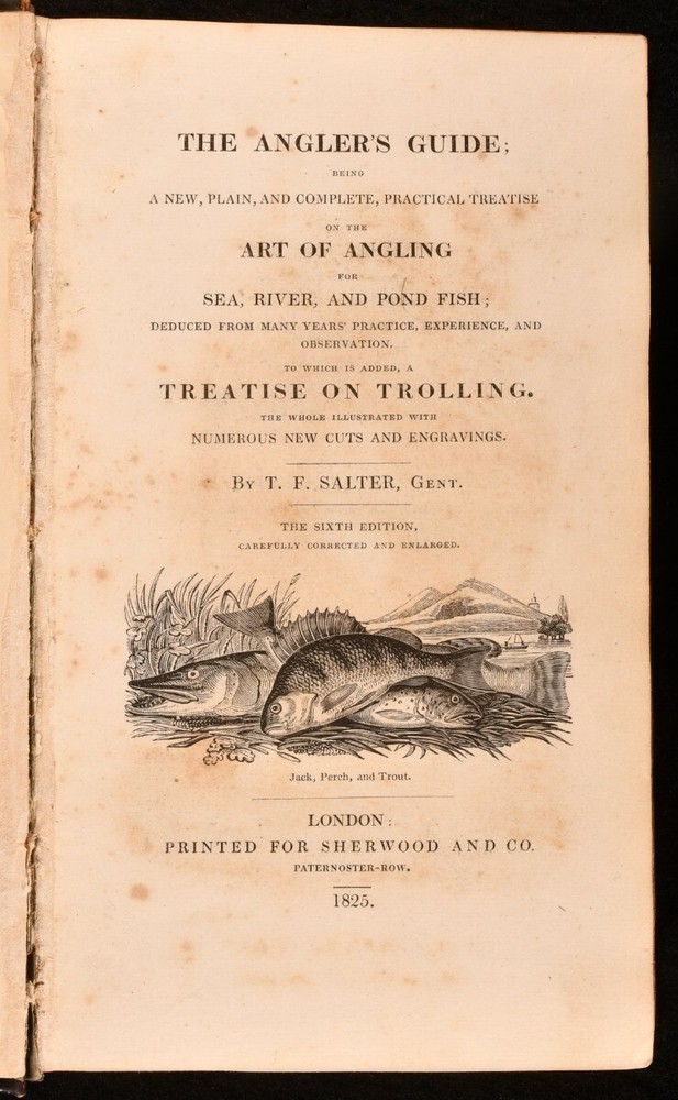 Click here to see our other books! The Angler's Guide; Being a New, Plain and Complete Practical Treatise on the Art of Angling for Sea, River and Pond Fish T. F. Salter 1825 Sherwood and Co : London 8.5" by 5.5" xi, 2-382pp SUMMARY The sixth edition of T. F. Salter's illustrated and immensely popular guide to angling, fly-fishing and trolling. Illustrated,Leather Binding Overall Condition: Very Good This book weighs 0.75 KG when packed UK Postage: £ 3.99 US Postage: £ 19.99 EU Postage : £ 15.99 European Postage: £ 16.99 Asia Postage: £ 21.99 Worldwide Postage: £ 25.99 DESCRIPTION The sixth edition of T. F. Salter's popular guide to angling. First published in 1814, this edition is greatly enlarged and features a number of further plates. Illustrated with a portrait frontispiece, eight plates, folding map, vignette title page and further in-text illustrations. Collated, complete. Salter discusses the capture of pong, river and sea fish, alongside a 'treatise on trolling', discussion of apparatus, and section dedicated to fly-fishing. With the armorial bookplate of George Henry Cornewall to the front pastedown. A delightfully illustrated early nineteenth century angler's guide. CONDITION In a half calf binding, with gilt detailing to boards. Rubbing to back strip head and tail and joints, resulting in losses to leather. Front hinge starting, with board holding firm. Armorial bookplate to front pastedown. Internally, firmly bound, aside from frontispiece, which is detached but present. Pages bright and generally clean, with the odd light spot. Overall Condition: Very Good GLOSSARY OF TERMS Overall Condition (Dustwrapper condition rating is shown after that for the book itself, where a dustwrapper is present) Fine - Very well preserved copy showing very little wear Very Good Indeed - Only one or two minor faults, really a very attractive copy Very Good - Quite a wide term meaning no major faults but probably several smaller ones often expected given the age of the book, but still a respectable copy Good - Meaning not very good. Some more serious faults as will be described in the condition report under 'condition' Good Only - Meaning one or more faults that could really do with repair Fair - As with good only above but with other faults leaving a compromised copy even after repair Poor - Really bad and possibly seriously incomplete. We only sell books in this condition where their rarity or value makes them attractive none the less. Major defects will be described. GUARANTEE We offer a full money back guarantee on our descriptions. Please ask for details and conditions. We prefer PAYPAL. If you pay via PAYPAL we will post the item off the same or the next working day with the postage you have selected. Please note we cannot accept USD cheques