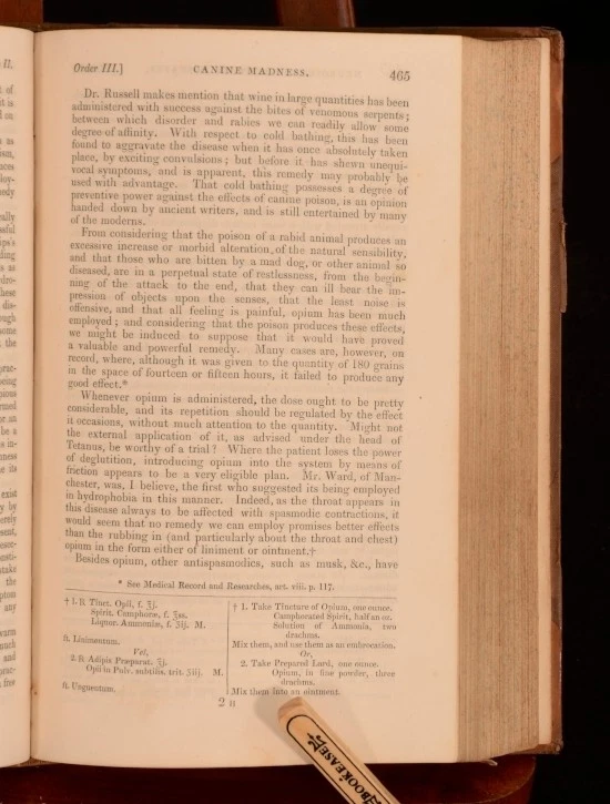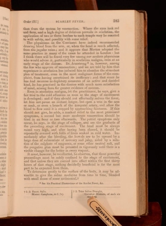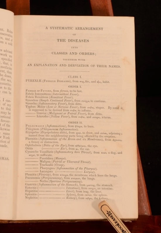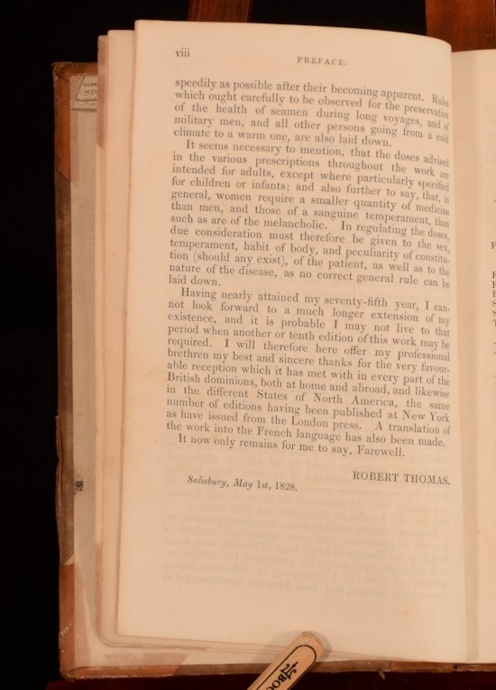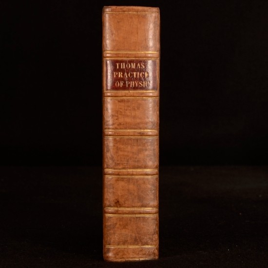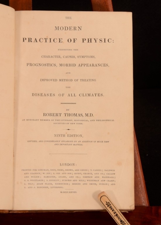 Click here to see our other books! The Modern Practice of Physic Exhibiting the Character, Causes, Symptoms, Prognostis, Morbid Appearances and Improved Method of Treating the Diseases of All Climates Robert Thomas 1828 Longman, Rees, Orme, Brown and Green et al. : London 9" by 5.5" xvi, 995pp SUMMARY A nineteenth century medical guide to several different diseases and ailments Leather Binding,Signed Binding Overall Condition: Very Good This book weighs 1.5 KG when packed UK Postage: £ 3.99 US Postage: £ 23.99 EU Postage : £ 18.99 European Postage: £ 19.99 Asia Postage: £ 31.99 Worldwide Postage: £ 32.99 DESCRIPTION The ninth edition of this text. In a Robert Seton of Head of the Mound, Edinburgh, binding. Written by Robert Thomas, an honorary member of the literary, historical and philosophical societies of New York. This is the final edition of the book published in Thomas' lifetime, as noted to the preface at the time of this edition he had 'nearly attained my seventy-fifth year, I cannot look forward to a much longer extension of my existence'. This work was extremely popular and even had translations into French. Thomas arranges the diseases into classes and orders at the start, with an explanation and derivation of their names. He then goes into detail describing each with the solutions. To name a few of the diseases discussed there is yellow fever, gout, measles, catarrh, asthma, pulmonary consumption, rickets, herpes and leprosy. CONDITION In a half calf binding with cloth covered boards. Externally, generally smart with slight rubbing to the spine. Small surface cracks to spine and some marks to cloth covered boards. Bookbinder's label to front pastedown, Robert Seton, Edinburgh. Internally, firmly bound. Pages are bright with instances of scattered spots throughout. Overall Condition: Very Good GLOSSARY OF TERMS Overall Condition (Dustwrapper condition rating is shown after that for the book itself, where a dustwrapper is present) Fine - Very well preserved copy showing very little wear Very Good Indeed - Only one or two minor faults, really a very attractive copy Very Good - Quite a wide term meaning no major faults but probably several smaller ones often expected given the age of the book, but still a respectable copy Good - Meaning not very good. Some more serious faults as will be described in the condition report under 'condition' Good Only - Meaning one or more faults that could really do with repair Fair - As with good only above but with other faults leaving a compromised copy even after repair Poor - Really bad and possibly seriously incomplete. We only sell books in this condition where their rarity or value makes them attractive none the less. Major defects will be described. GUARANTEE We offer a full money back guarantee on our descriptions. Please ask for details and conditions. We prefer PAYPAL. If you pay via PAYPAL we will post the item off the same or the next working day with the postage you have selected. Please note we cannot accept USD cheques