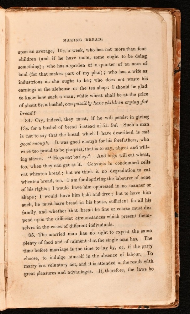 Click here to see our other books! Cottage Economy William Cobbett 1831 William Cobbett : London 7.5" by 4.5" Unpaginated SUMMARY William Cobbett's detailed instructional guide to cottage economy, a fantastic work on how to live self-sufficiently. Leather Binding Overall Condition: Good This book weighs 0.5 KG when packed UK Postage: £ 3.99 US Postage: £ 15.99 EU Postage : £ 13.99 European Postage: £ 14.99 Asia Postage: £ 18.99 Worldwide Postage: £ 19.99 DESCRIPTION 'Cottage Economy' is a fascinating study into the running of a successful cottage. The work gives instructions on how to bake bread, brew beer, keeping livestock, and more. Cobbett's work is considered to be a timeless guide on how to live self-sufficiently. A new edition of this work. Bound without the publisher's adverts. CONDITION In a half calf binding with marbled paper to the boards. Externally, generally smart. Light bumping to the head and tail of the spine and to the extremities. A small amount of loss of paper to the tail of the front board. Small chips to the rear joint. Boards are lightly age-toned. Small tears to the head and tail of the joints and to the tail of the spine. Ink to the spine. Hinges are starting. Internally, firmly bound. Pages are lightly age-toned with scattered spots and handling marks. Front endpaper and title page are working loose. Closed tear to the tail of leaf B2. Overall Condition: Good GLOSSARY OF TERMS Overall Condition (Dustwrapper condition rating is shown after that for the book itself, where a dustwrapper is present) Fine - Very well preserved copy showing very little wear Very Good Indeed - Only one or two minor faults, really a very attractive copy Very Good - Quite a wide term meaning no major faults but probably several smaller ones often expected given the age of the book, but still a respectable copy Good - Meaning not very good. Some more serious faults as will be described in the condition report under 'condition' Good Only - Meaning one or more faults that could really do with repair Fair - As with good only above but with other faults leaving a compromised copy even after repair Poor - Really bad and possibly seriously incomplete. We only sell books in this condition where their rarity or value makes them attractive none the less. Major defects will be described. GUARANTEE We offer a full money back guarantee on our descriptions. Please ask for details and conditions. We prefer PAYPAL. If you pay via PAYPAL we will post the item off the same or the next working day with the postage you have selected. Please note we cannot accept USD cheques