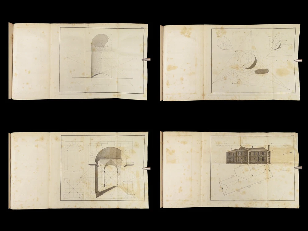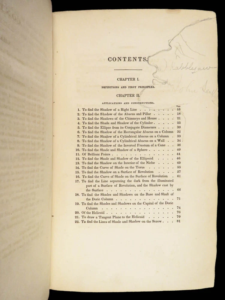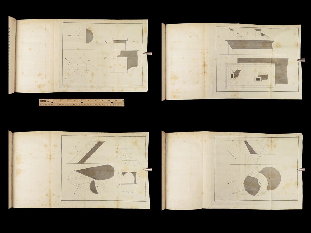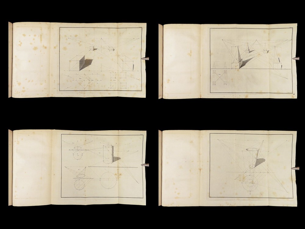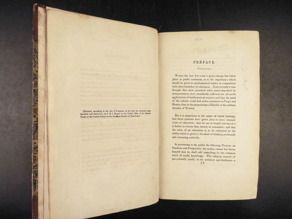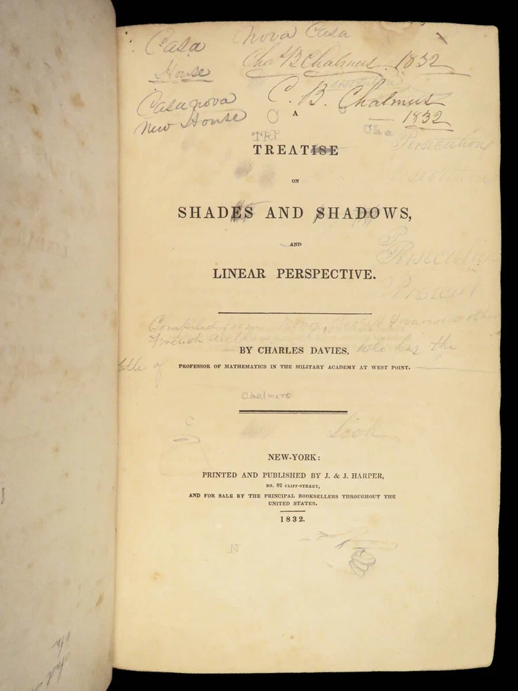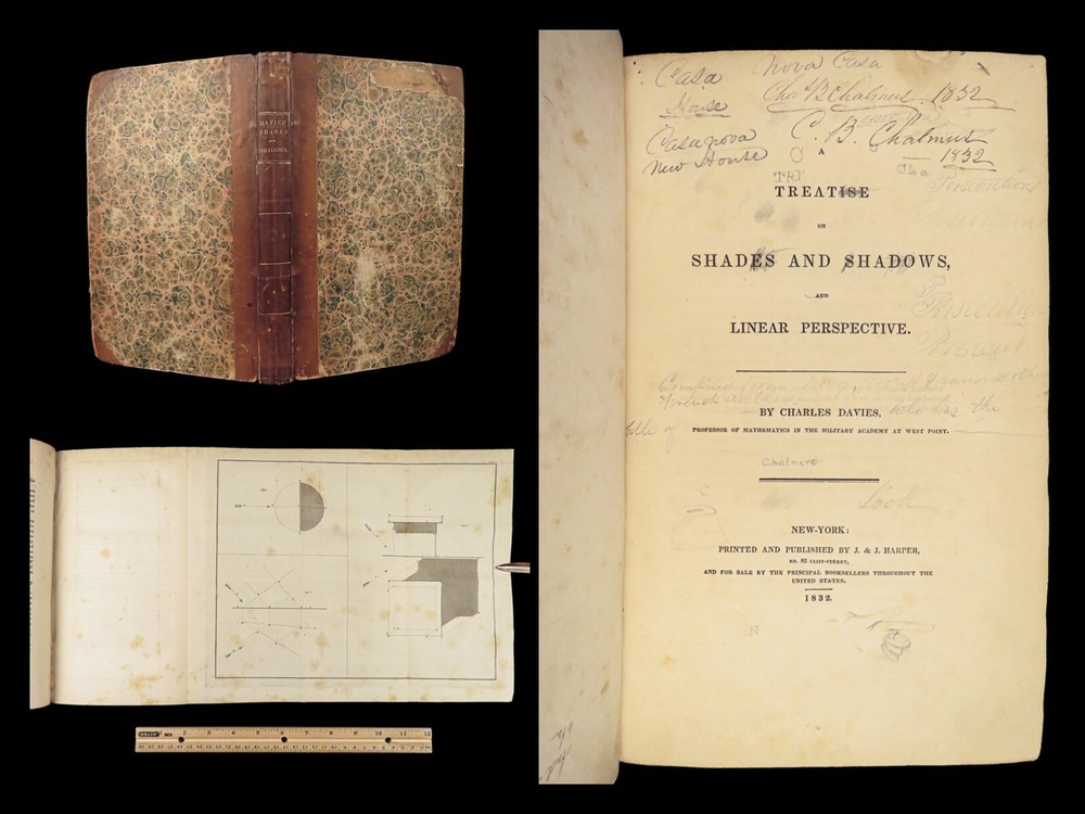 1832 Architecture 1 ed Perspective Charles Davies MATH Pyramids PROVENANCE Charles Davies was an early 19 th -century American mathematician known for teaching at the Military Academy at West Point. His most important writing was his treatise on perspective, “ On Shades and Shadows and Linear Perspective ”. This book proved to be an important instructional guide on how to find and illustrated all matters of architecture including: · Drawing tangential planes · Shading and shadowing Doric columns · On the frustum of a cone · Cylindrical abacuses · Pillars · Finding the perspectives of spheres, pyramids, circles, arches, etc. This 1832 first edition includes 20 folding plates – a must see! Item number: #27168 Price: $499 DAVIES, Charles Treatise on shades and shadows and linear perspective. New York: printed and published by J. & J. Harper, 1832. First edition. Details : · Collation: Complete with all pages o viii, 9-157 o 20 folding plates · Provenance: Handwritten – Cadet Chas. B. Chalmers, 1832 o Possibly Charles B. Chalmers (d. 1841), a cadet at West Point until his graduation in 1834. He was eventually promoted to First Lieutenant in the 1 st Artillery, where he served during the Second Seminole War. It is likely that the numerous sketches and marginalia in this book are also his work. · Language: English · Binding: Leather; tight and secure · Size : ~10.25in X 6.5in (26cm x 16.5cm) Our Guarantee: Very Fast. Very Safe. Free Shipping Worldwide. Customer satisfaction is our priority! Notify us with 7 days of receiving, and we will offer a full refund without reservation!