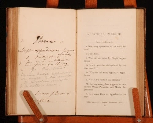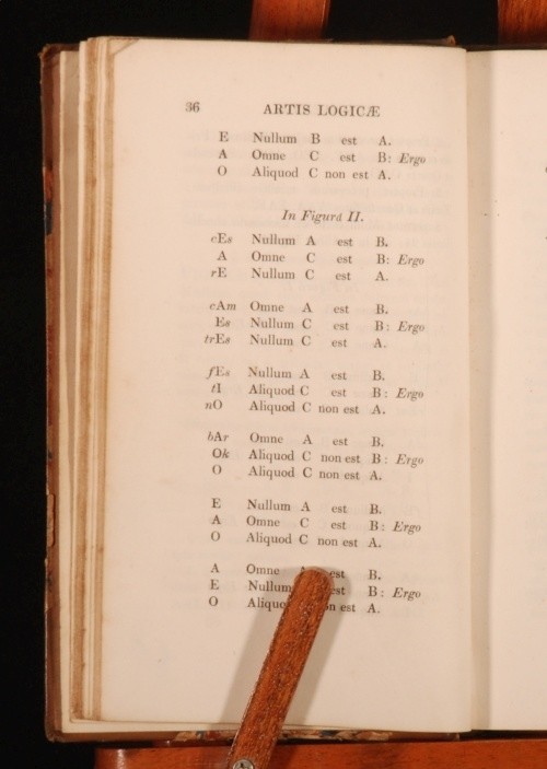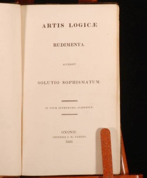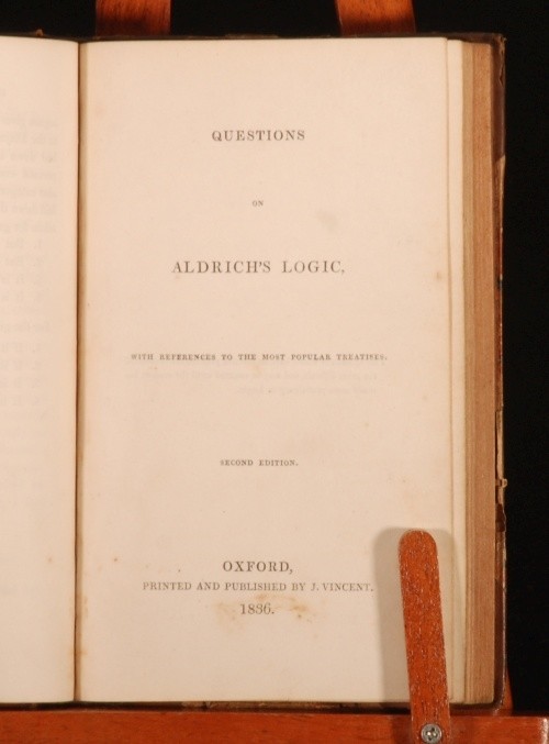 Click here to see our other books! Artis Logicae Rudimenta with Questions on Aldrich's Logic Henry Aldrich 1832-1836 J H Parker; J Vincent : Oxford 7" by 4.5" 77, 63pp SUMMARY Two fantastic scarce little educational textbooks. A revised edition of Aldrich's lasting Compendium Artis Logica, bound with an exercise book regarding the former text. Leather Binding,Scarce Overall Condition: Very Good This book weighs 0.5 KG when packed UK Postage: £ 3.99 US Postage: £ 15.99 EU Postage : £ 13.99 European Postage: £ 14.99 Asia Postage: £ 18.99 Worldwide Postage: £ 19.99 DESCRIPTION Bound in half leather and marbled paper-covered boards, with gilt lettering and decoration. Questions on Aldrich's Logic is the Second Edition. The first work is an abbreviated edition of Aldrich's important work, designed for students. The second is an exercise book, with purposeful interleaved blank pages. It is interesting to note that this edition has numerous pencil annotations, and an ink inscription to the blank after the Questions title page. These two works are not widely held institutionally. With an ink inscription from University College, Dunelm, otherwise known as Durham University, to the front pastedown. Direct from the library at Newton Hall, the 18th century country house and estate in Northumberland, with a pencil shelfmark to the front free-endpaper. Henry Aldrich, 1648 - 1710, was an English theologian and philosopher. He held the position of dean of Christ Church, Oxford and became Vice-Chancellor of the University. "In 1691 Aldrich published Artis logicae compendium, a small treatise on logic which remained a standard textbook at Oxford into the late nineteenth century" -ODNB. CONDITION Bound in half leather and marbled paper-covered boards, with gilt lettering and decoration. There is only mild wear to the extremities, with just mild rubbing and discoloured marks. The binding is tight and firm. Internally the pages have very slight browning and intermittent foxing. Apart from those mentioned above, there is an ink inscription to the rear pastedown. Overall Condition: Very Good GLOSSARY OF TERMS Overall Condition (Dustwrapper condition rating is shown after that for the book itself, where a dustwrapper is present) Fine - Very well preserved copy showing very little wear Very Good Indeed - Only one or two minor faults, really a very attractive copy Very Good - Quite a wide term meaning no major faults but probably several smaller ones often expected given the age of the book, but still a respectable copy Good - Meaning not very good. Some more serious faults as will be described in the condition report under 'condition' Good Only - Meaning one or more faults that could really do with repair Fair - As with good only above but with other faults leaving a compromised copy even after repair Poor - Really bad and possibly seriously incomplete. We only sell books in this condition where their rarity or value makes them attractive none the less. Major defects will be described. GUARANTEE We offer a full money back guarantee on our descriptions. Please ask for details and conditions. We prefer PAYPAL. If you pay via PAYPAL we will post the item off the same or the next working day with the postage you have selected. Please note we cannot accept USD cheques