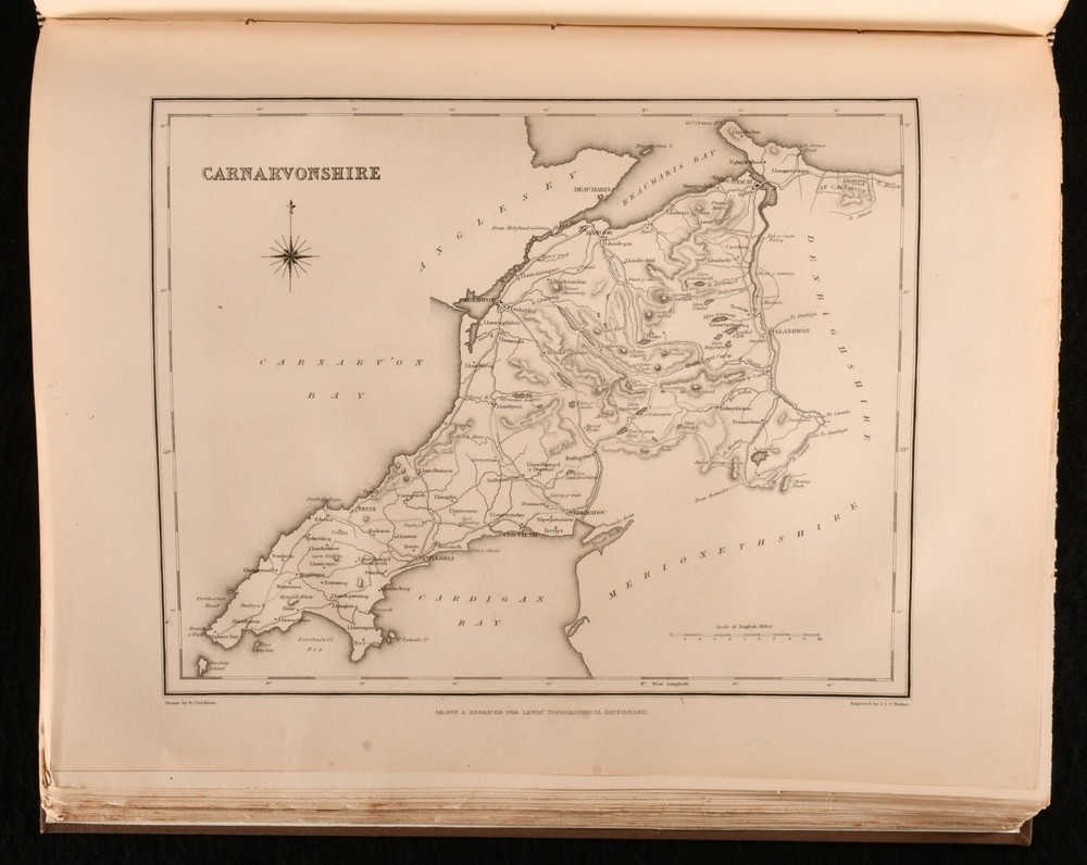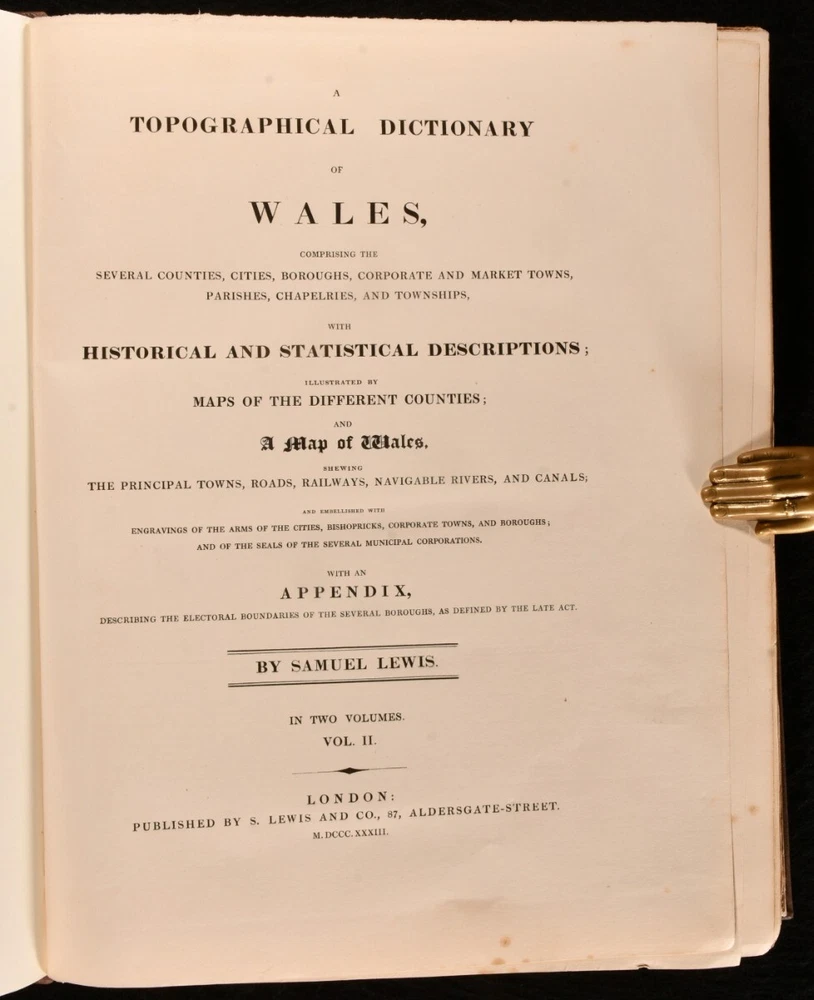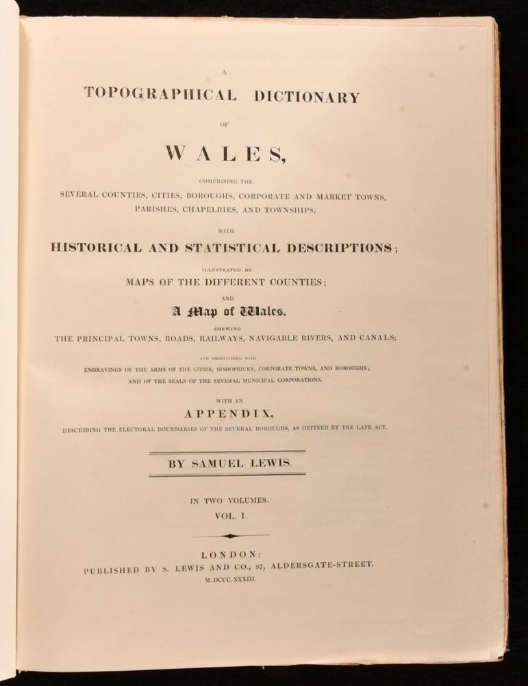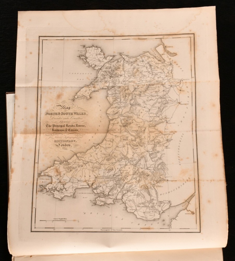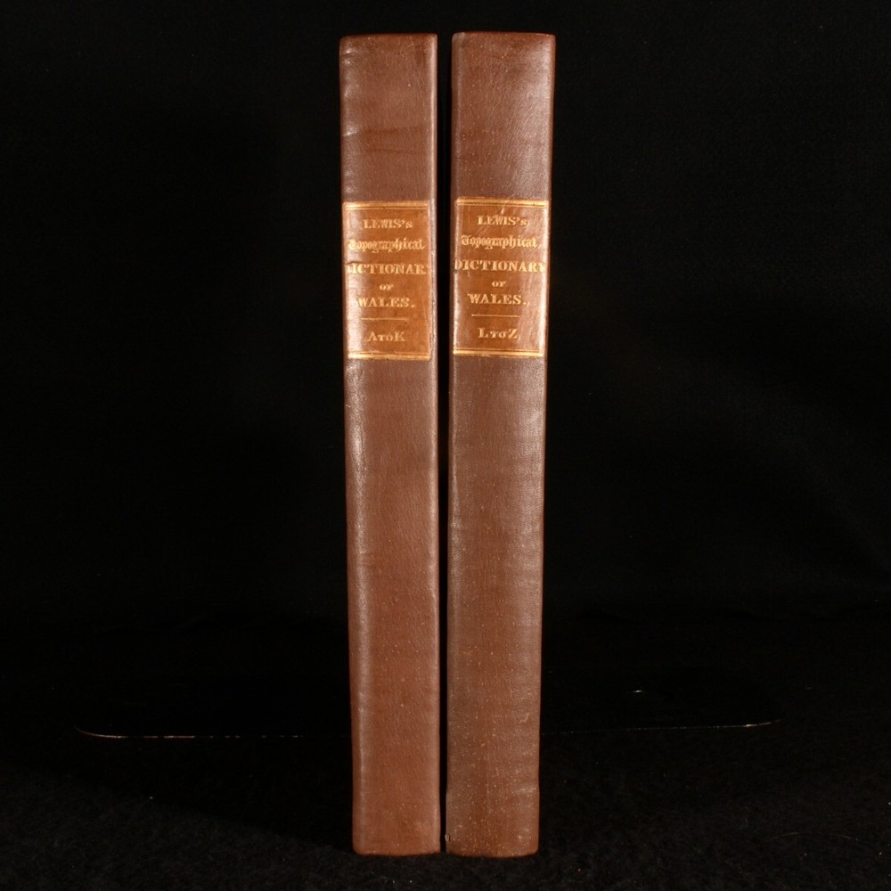 Click here to see our other books! A Topographical Dictionary of Wales Samuel Lewis 1833 S. Lewis and Co. : London 13.5" by 10.5" Unpaginated SUMMARY A fascinating topographical dictionary of Wales, handsomely bound in quarter morocco, and illustrated with numerous engravings and folding maps. First Edition,Folding Maps,Illustrated,Leather Binding,Pleasing Copy,Rebound Overall Condition: Near Fine This book weighs 4 KG when packed UK Postage: £ 4.49 US Postage: £ 39.99 EU Postage : £ 26.99 European Postage: £ 36.99 Asia Postage: £ 65.99 Worldwide Postage: £ 99.99 DESCRIPTION An early nineteenth-century topographical dictionary of Wales, comprising of the counties, cities, boroughs, corporate and market towns, parishes, chapelries, and townships. Also including historical, topographical, and statistical descriptions of these areas. A very useful topographical and referential guide to Wales. The first edition of this work. Written by Samuel Lewis. Complete in two volumes. Volume I includes nine maps, one of which is folding. Volume II contains four illustrated maps. Collated and complete. Signature: b1-b2, c1-d3, B1-2Y1; B1-3F2, 3G1-3H2 CONDITION Handsomely bound in quarter morocco with cloth covered boards. Externally, lovely. Internally, firmly bound. The odd spot to the pages, which are otherwise bright and clean. Overall Condition: Near Fine GLOSSARY OF TERMS Overall Condition (Dustwrapper condition rating is shown after that for the book itself, where a dustwrapper is present) Fine - Very well preserved copy showing very little wear Very Good Indeed - Only one or two minor faults, really a very attractive copy Very Good - Quite a wide term meaning no major faults but probably several smaller ones often expected given the age of the book, but still a respectable copy Good - Meaning not very good. Some more serious faults as will be described in the condition report under 'condition' Good Only - Meaning one or more faults that could really do with repair Fair - As with good only above but with other faults leaving a compromised copy even after repair Poor - Really bad and possibly seriously incomplete. We only sell books in this condition where their rarity or value makes them attractive none the less. Major defects will be described. GUARANTEE We offer a full money back guarantee on our descriptions. Please ask for details and conditions. We prefer PAYPAL. If you pay via PAYPAL we will post the item off the same or the next working day with the postage you have selected. Please note we cannot accept USD cheques