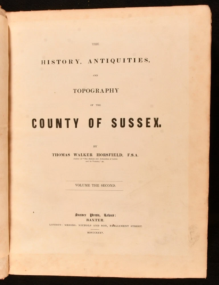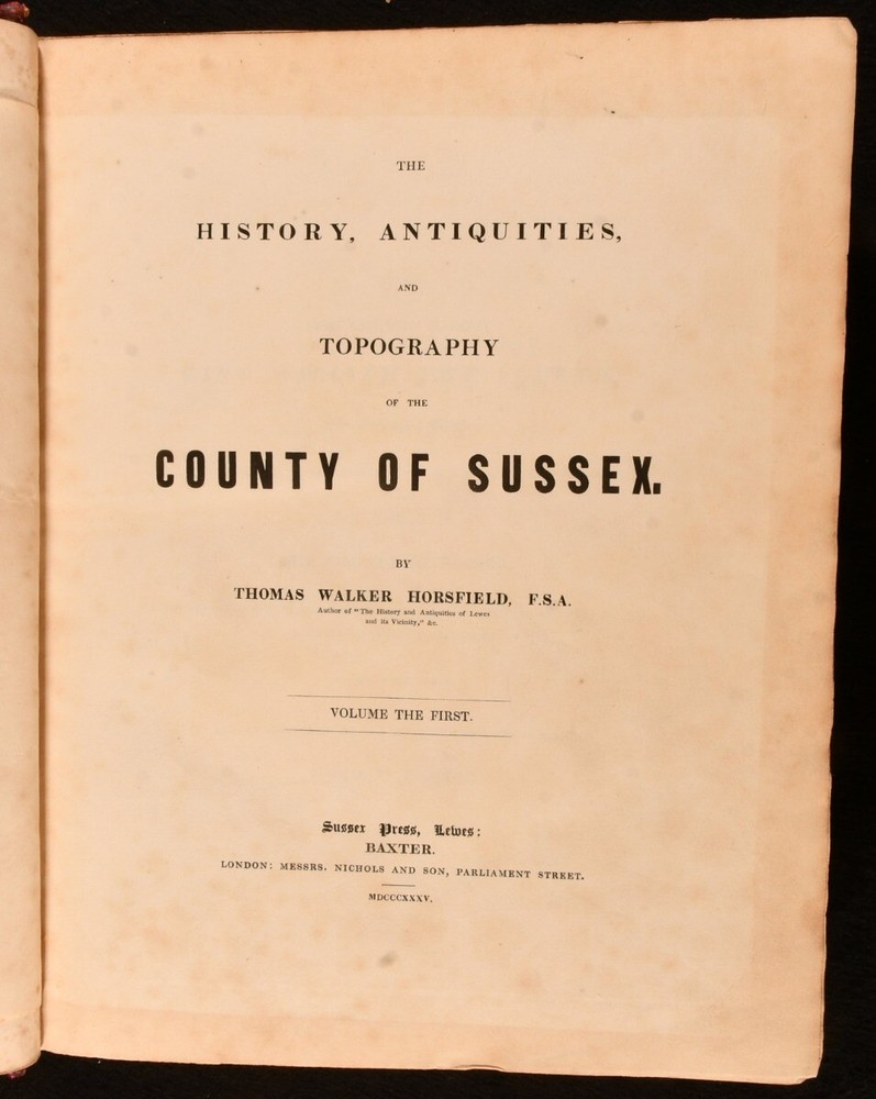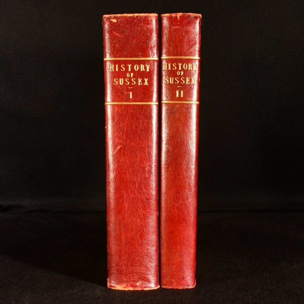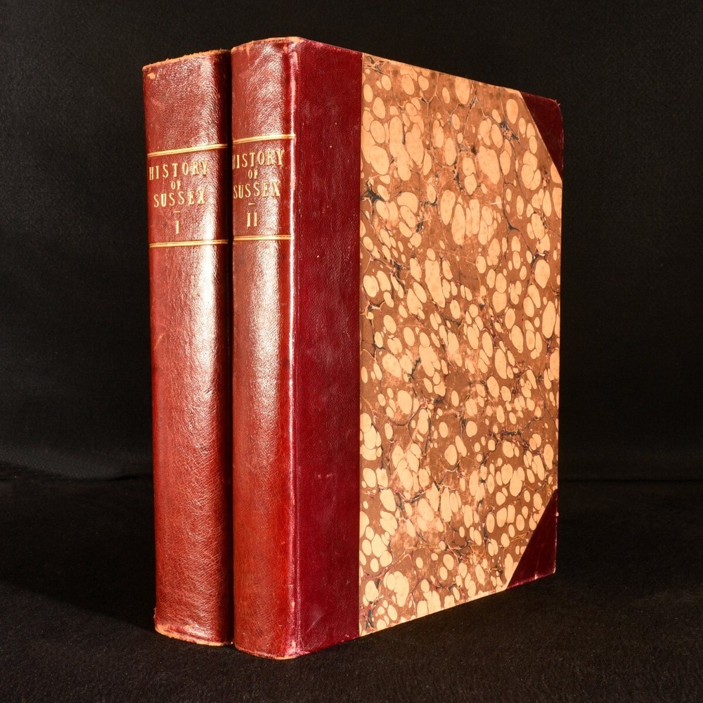 Click here to see our other books! The History, Antiquities, and Topography County Sussex Thomas Walker Horsfield 1835 Baxter Sussex Press; Messrs. Nichols and Son : Lewes; London 13.5" by 11" vii [2], 2-592 [1], ii-xv; 274 [1], 2-90 [1], ii-viii [1]pp SUMMARY The richly illustrated first edition of Thomas Walker Horsfield's historical and topographical study of the county of Sussex. First Edition,Folding Maps,Illustrated,Leather Binding,Rebound Overall Condition: Very Good This book weighs 6 KG when packed UK Postage: £ 4.49 US Postage: £ 47.99 EU Postage : £ 28.99 European Postage: £ 49.99 Asia Postage: £ 79.99 Worldwide Postage: £ 159.99 DESCRIPTION The two volume first edition of this work by Thomas Walker Horsfield, a topographer and historian best known for this work, which was considered a standard for its time. Collated, volume I is illustrated with a portrait frontispiece, folding map and a further twenty-seven plates. Volume II is illustrated with a frontispiece, folding map, and a further twenty-five engraved plates. Volume I lacks two plates. Horsfield was an English Nonconformist minister, topographer, and historian who authored a similar work about the town of Lewes. With the inscription 'To Bernard, from Mary', dated 1957, to the front free endpaper of volume I. Retaining the publisher's advertisement leaf to the rear of volume II. A smart example of this informative guide to early nineteenth century Sussex. CONDITION Rebound in half calf, with marbled paper covered boards. Endpapers renewed. Volume I hinges, and volume II rear hinge strained, but firmly held. Inscription to front free endpaper of volume I. Internally, firmly bound. Instances of significant spotting to plate perimeters and pages surrounding plates, with pages otherwise generally clean and bright. Overall Condition: Very Good GLOSSARY OF TERMS Overall Condition (Dustwrapper condition rating is shown after that for the book itself, where a dustwrapper is present) Fine - Very well preserved copy showing very little wear Very Good Indeed - Only one or two minor faults, really a very attractive copy Very Good - Quite a wide term meaning no major faults but probably several smaller ones often expected given the age of the book, but still a respectable copy Good - Meaning not very good. Some more serious faults as will be described in the condition report under 'condition' Good Only - Meaning one or more faults that could really do with repair Fair - As with good only above but with other faults leaving a compromised copy even after repair Poor - Really bad and possibly seriously incomplete. We only sell books in this condition where their rarity or value makes them attractive none the less. Major defects will be described. GUARANTEE We offer a full money back guarantee on our descriptions. Please ask for details and conditions. We prefer PAYPAL. If you pay via PAYPAL we will post the item off the same or the next working day with the postage you have selected. Please note we cannot accept USD cheques