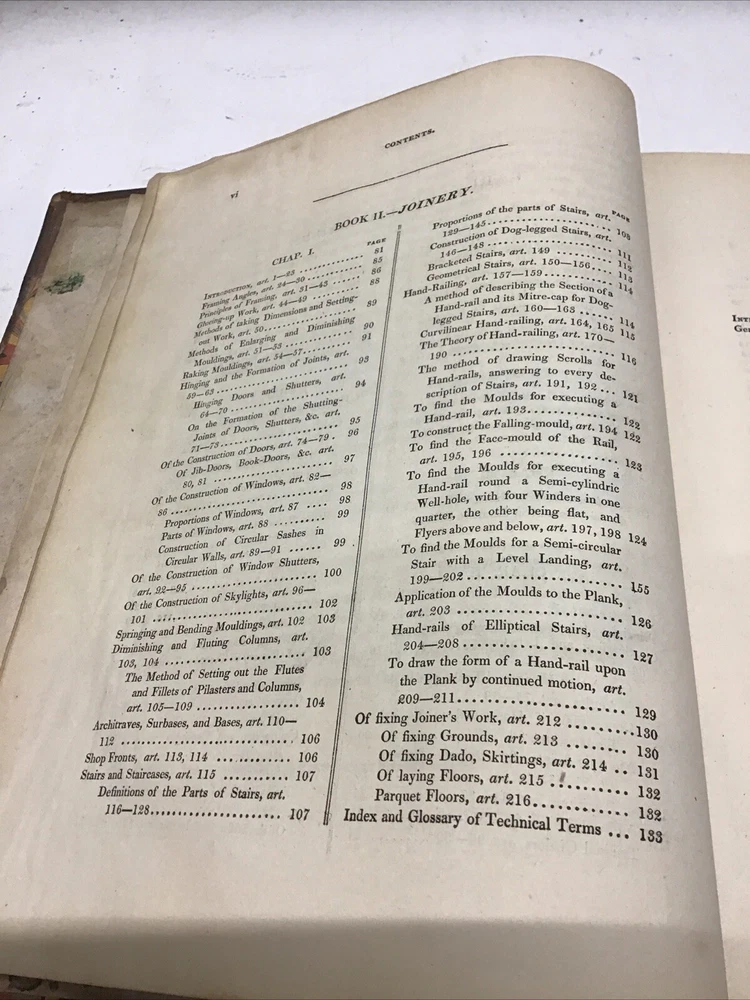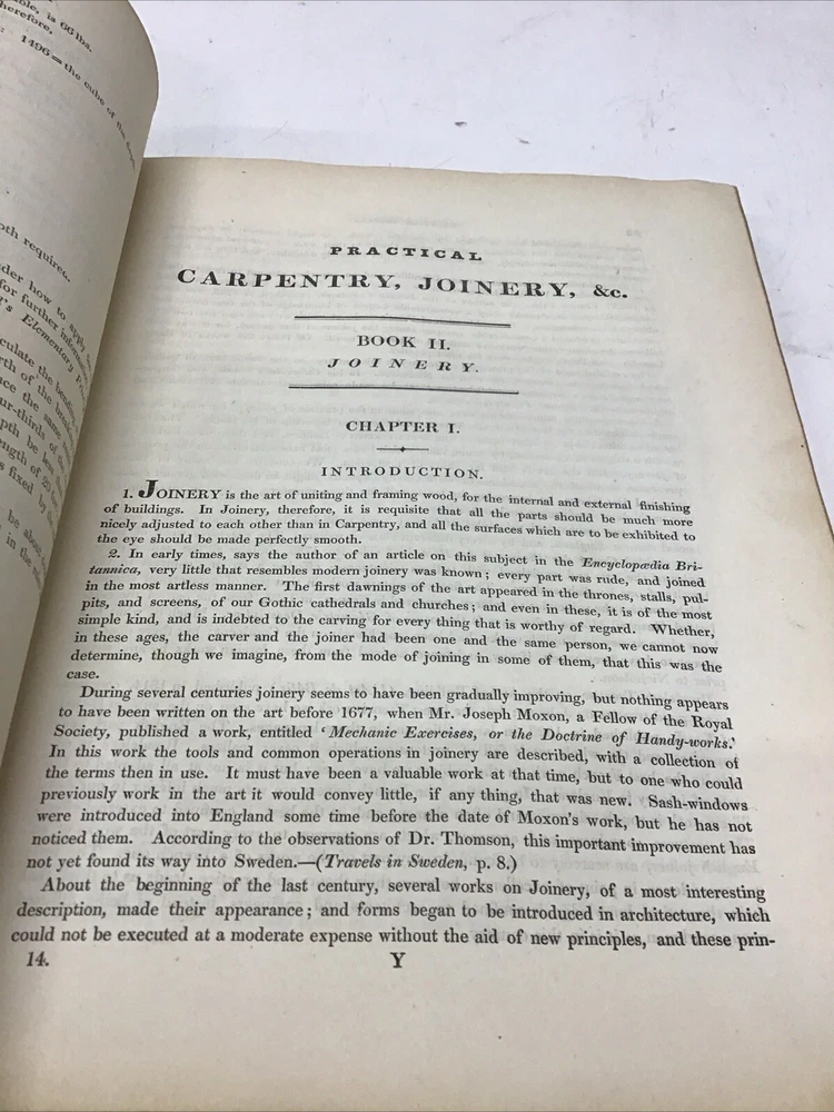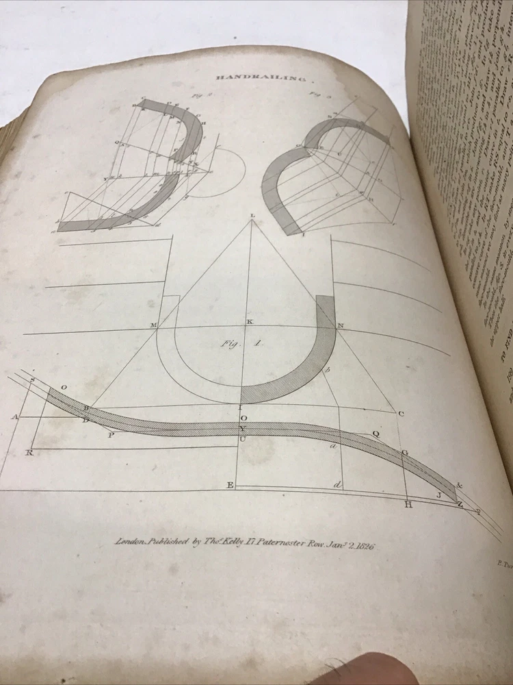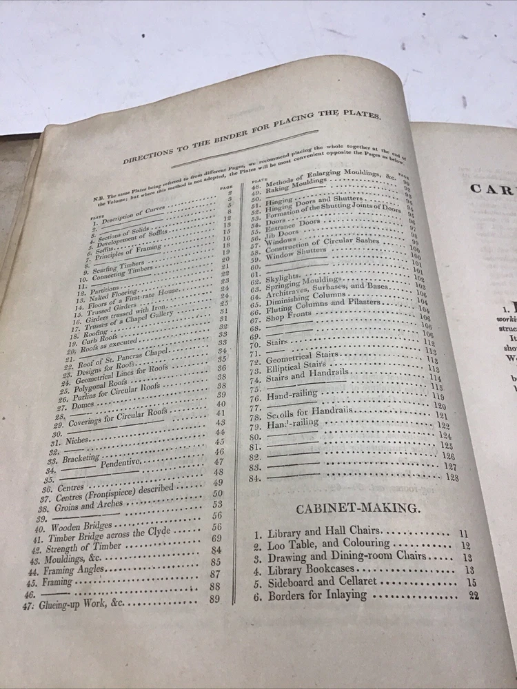 This 1835 publication titled "Practical Carpentry, Joinery, and Cabinet Making Explained & Illustrated" is a valuable addition to any collection of antique woodworking books. The book is bound in leather and features illustrations of the procedures described in the text. The author, NICHOLSON, provides a comprehensive guide to the subject of woodworking, including topics such as carpentry, joinery, and cabinet-making. The book was printed for Thomas Kelly by J.Rider in London and is an original copy from 1835. It is a non-fiction subject and falls under the category of engineering and technology. The book is written in English and has special attributes such as being illustrated. It is a valuable item for collectors and enthusiasts of antique woodworking books. Practical Carpentry, Joinery, And Cabinet-Making; Being A New And Complete System Of Lines, For the Use Of Workmen; Founded on accurate Geometrical and Mechanical Principles, With Their Application In Carpentry, - To Roofs, Domes, Centring, &c.; In Joinery, - To Stairs, Hand-Rails, Soffits, Niches, &c.; And In Cabinet-Making To Furniture, Both Plain And Ornamental; Fully and Clearly Explained. [NICHOLSON, Peter] [1765-1844]. Published by London: Printed For Thomas Kelly By J.Rider, 1835 1835 Practical Carpentry, Joinery, and Cabinet Making Explained & Illustrated Size 9” x 11” Nice Leather Front, interior has discoloration as can be seen in pictures. Contains 90 plates. For list see picture 15. Has previous owner Robert Howard 1837 Keep in mind the shipping price also covers handling fees, packaging materials & time, not just postage. See our eBay store for 1000’s of other items. B12F