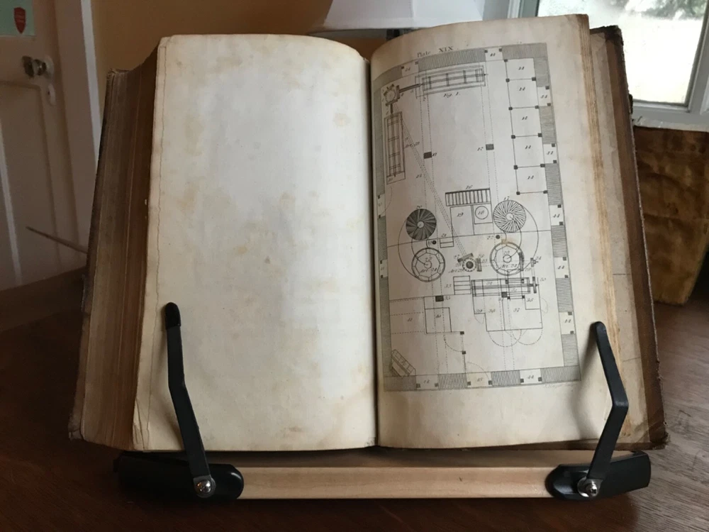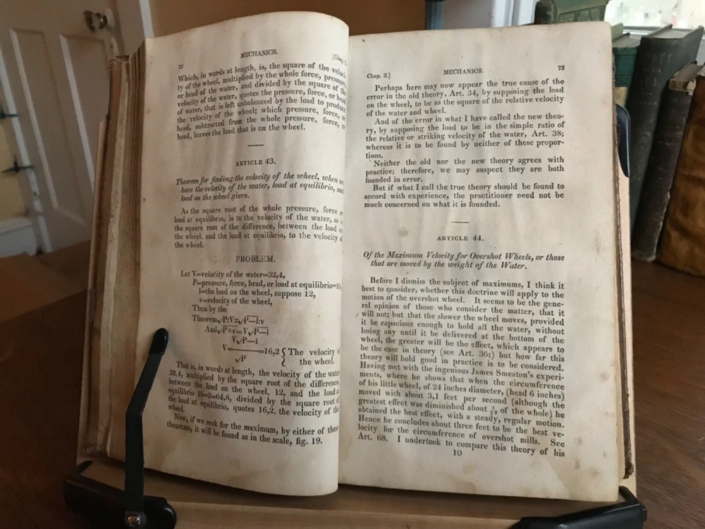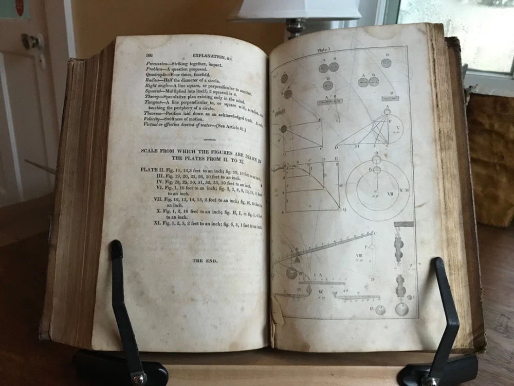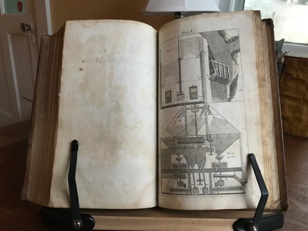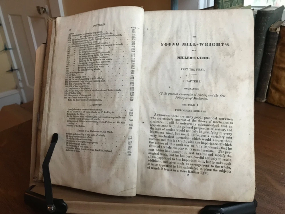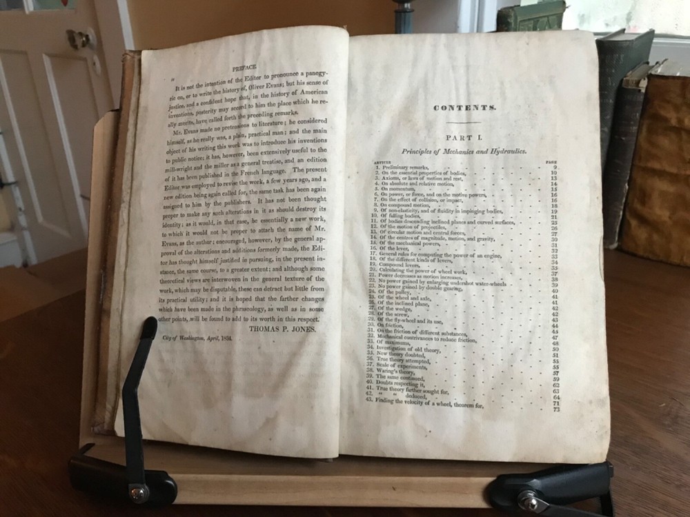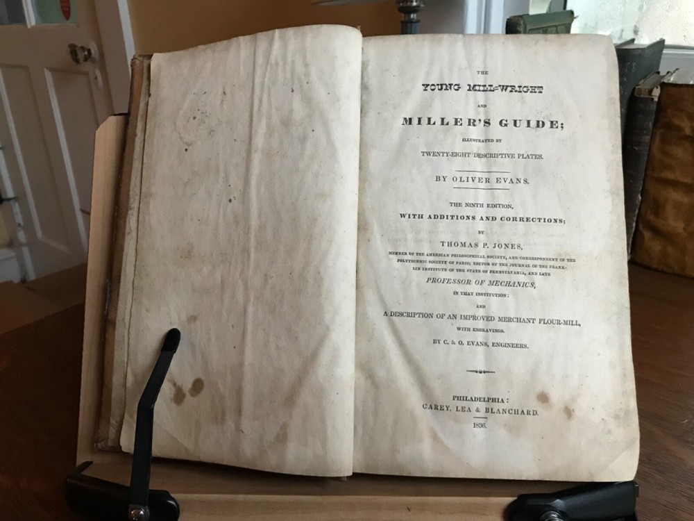 The Young Mill-Wright and Millers Guide : Illustrated by Twenty-Eight Descriptive Plates and a Description of an Improved Merchant Flour Mill with Engravings by C. and O. Eveans, Engineers, The Ninth Edition, With Additions and Corrections by Thomas P. Jones, Carey, Lea & Blanchard, Philadelphia, 1836, 392 pp, full original leather, 9 x 6”, 8vo. In fair condition. Light wear to extremities with scuffing to corners and edges. Leather slightly desiccated overall with light scratching to surface of leather. Corners rubbed. Spine lightly abraded. Leather remains rich in color. Old hand ownership of Thomas G. Clark on fly. Text block lightly toned with scattered foxing. Moderate at times. Rippling throughout text from previous humidity exposure. Some scribbling to plates. Folding plates are all present with slight irregularities in folds. Some are torn. No tape repairs. Binding tight and intact. Please see photos. Later edition, scarce in any edition. Oliver Evans (1755-1819) was an American inventor, engineer and businessman born in rural Delaware and later rooted commercially in Philadelphia. He was one of the first Americans building steam engines and an advocate of high pressure steam. COLN1836GIJR