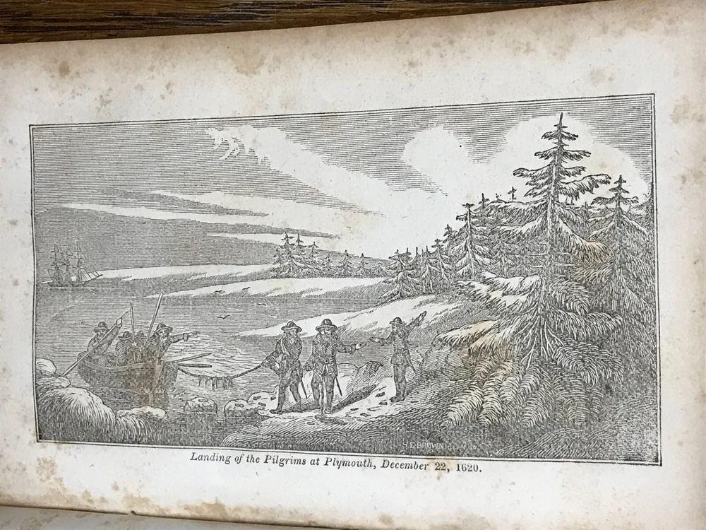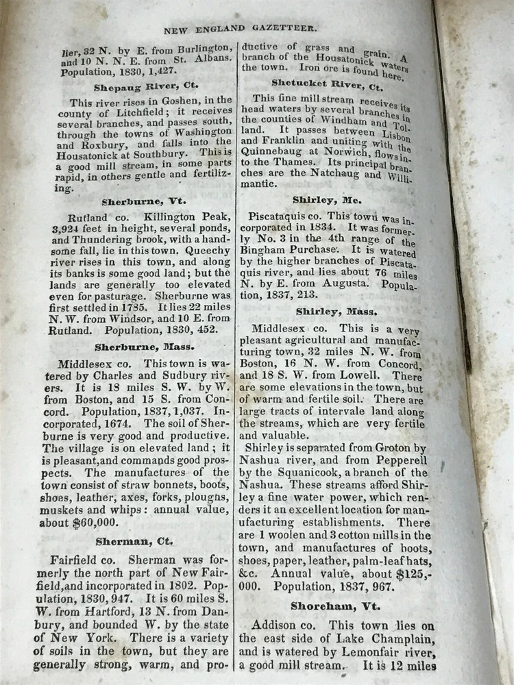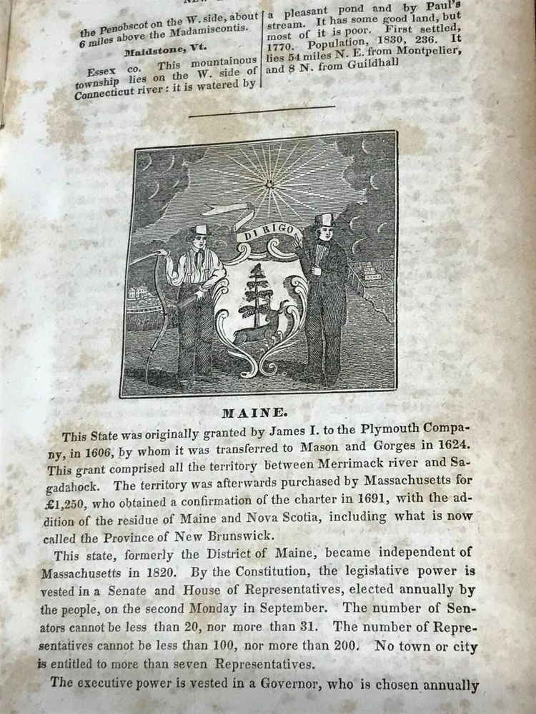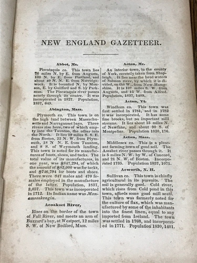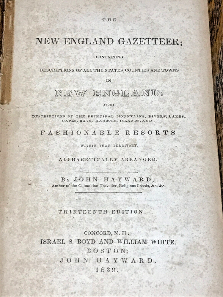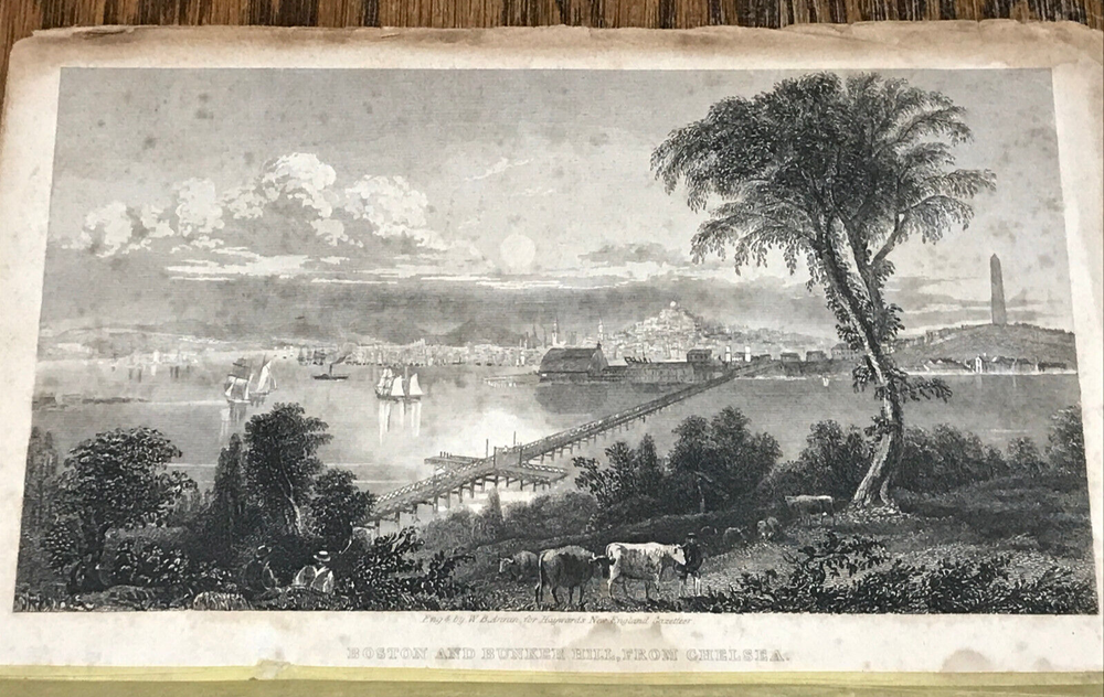 1839 Antique Guide "The New England Gazetteer w/ Fashionable Resorts" Descriptions of the Principal Mountains, Rivers, Lakes, Capes, Bays, Harbors, Islands, Towns. Alphabetically Arranged. Concord, N.H.: 1839. Thirteenth Edition. Publisher's full leather covered boards. Illustrated with an amazing frontispiece engraving "Boston and Bunker Hill from Chelsea", plus a few engravings. Measures 8 1/4" x 5 1/4".
