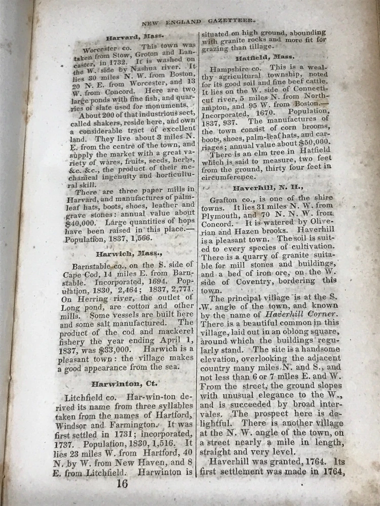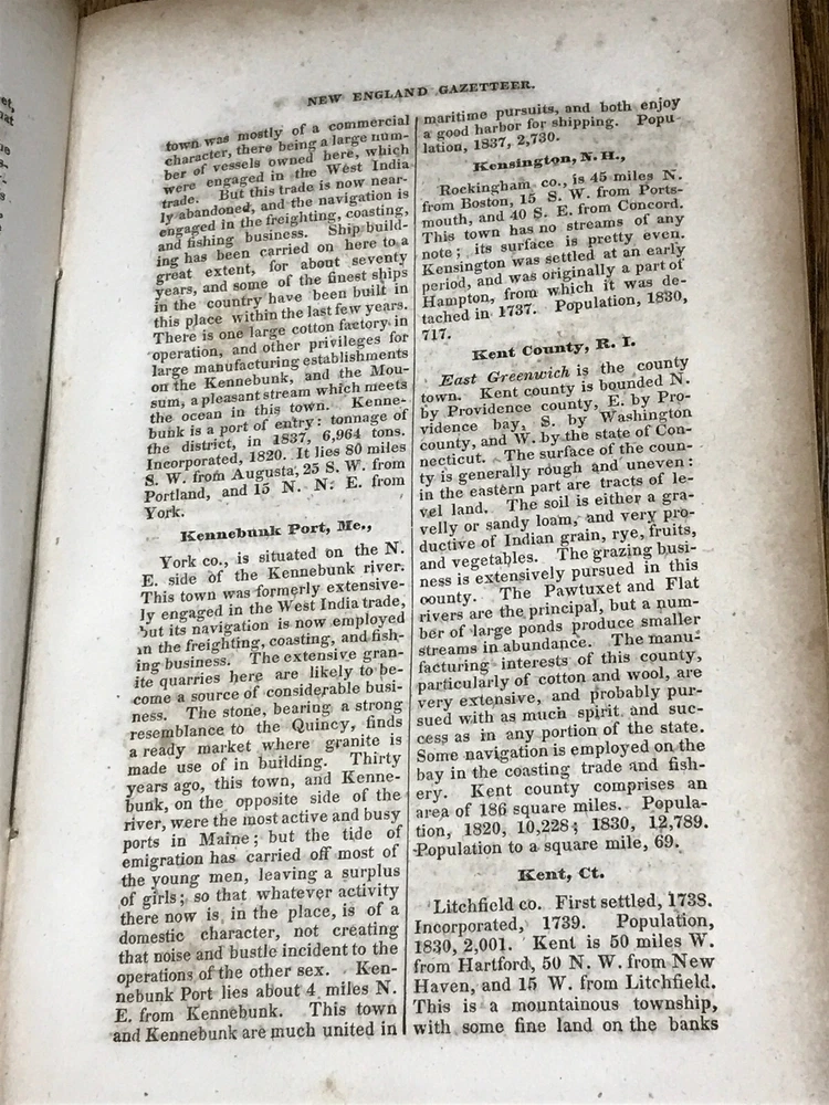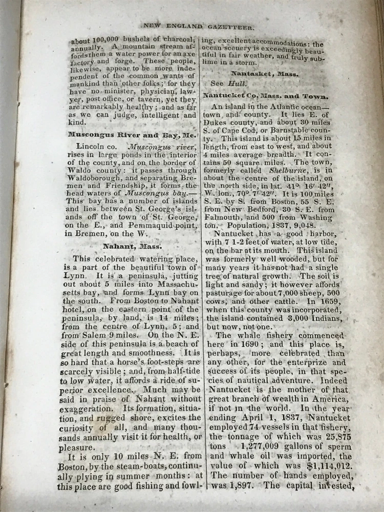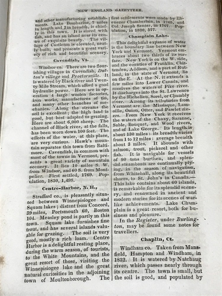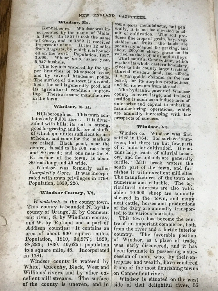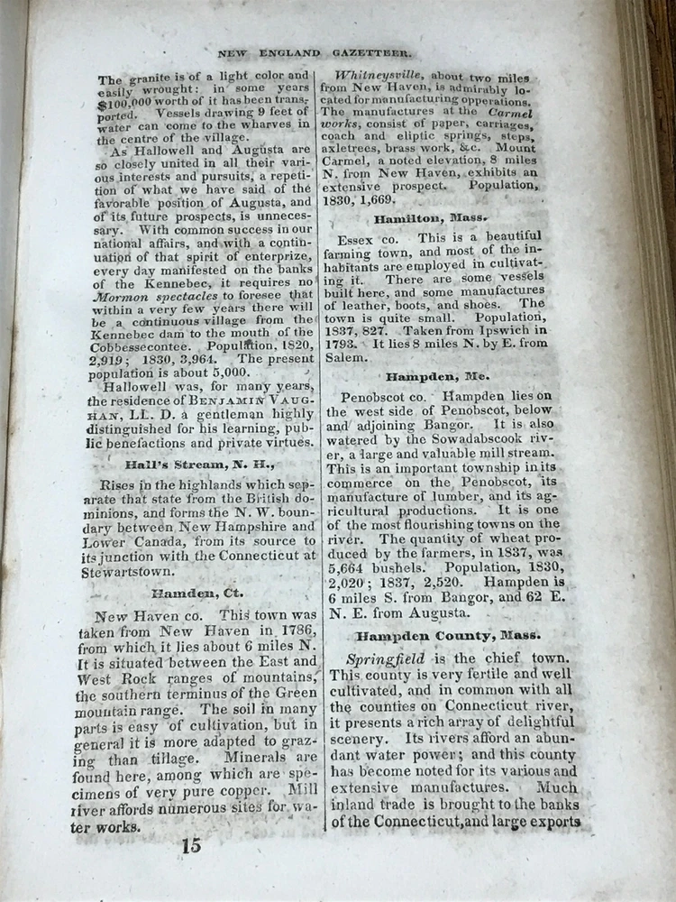 1839 Antique Guide "The New England Gazetteer w/ Fashionable Resorts" Descriptions of the Principal Mountains, Rivers, Lakes, Capes, Bays, Harbors, Islands, Towns. Alphabetically Arranged. Concord, N.H.: 1839. Thirteenth Edition. Publisher's full leather covered boards. Illustrated with an amazing frontispiece engraving "Boston and Bunker Hill from Chelsea", plus a few engravings. Measures 8 1/4" x 5 1/4".