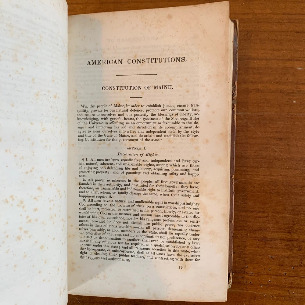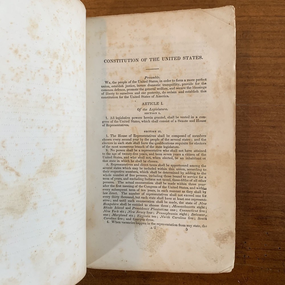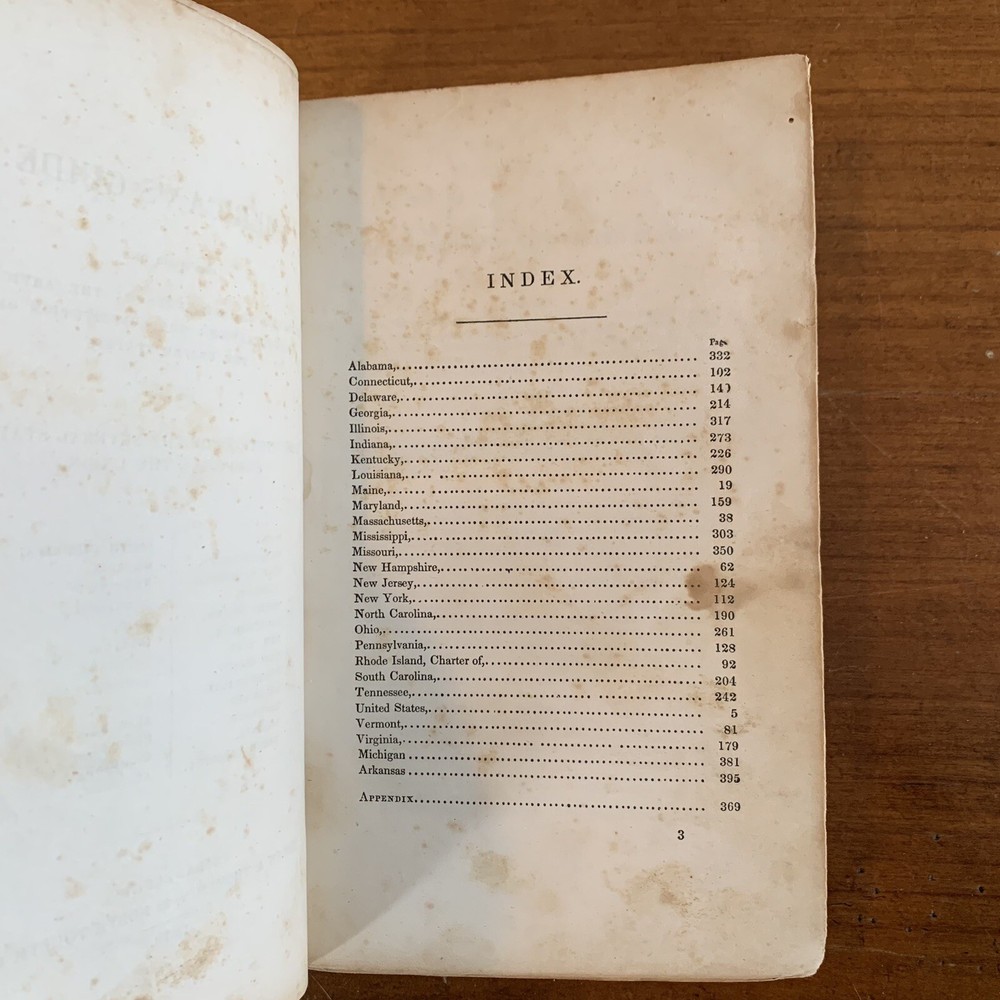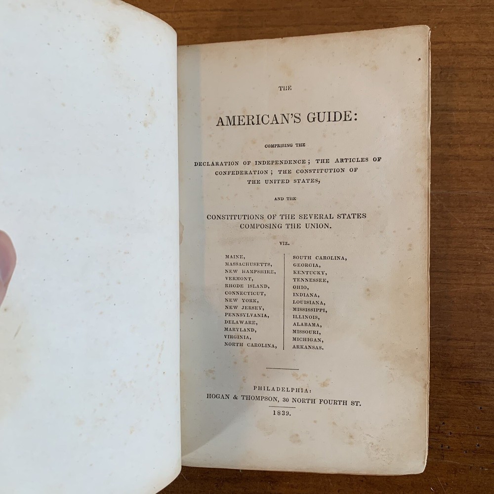 A 1839 printing of The Americans Guide which provides commentary and notes on important American documents. This book, printed in Philadelphia, features the Declaration of Independence, the Articles of Confederation, the United States Constitution, as well as the constitutions of several states in the Union. In 1839 there were only 26 states in the United States, with Michigan being the youngest. This book contains the original constitution of each of these states as well as important articles and amendments. Satisfaction guaranteed or you can send it back!