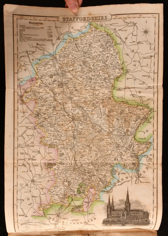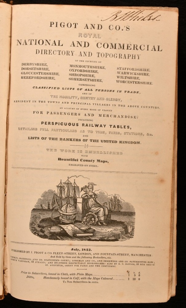 Click here to see our other books! Pigot and Co.'s Royal National and Commercial Directory and Topography Not Stated 1842 J. Pigot & Co; et al : London 10" by 6" [6], 20, [2], 82, [2], 36, [2], 142, [2], 22, [2], 24, [2], 40, [2], 54, [2], 98, [2], 112, [2], 169, [2], 46, [2], 59, [29], [94pp] SUMMARY A topographical guide to the counties of England, an expansive work exploring the history of the country, alongside colour folding plates. Folding Maps,Illustrated,Leather Binding Overall Condition: Good This book weighs 2 KG when packed UK Postage: £ 3.99 US Postage: £ 29.99 EU Postage : £ 21.99 European Postage: £ 23.99 Asia Postage: £ 37.99 Worldwide Postage: £ 38.99 DESCRIPTION An interesting and extremely extensive topographical work for the counties of England. Illustrated with eleven colour folding maps. This dictionary includes lists of gentry and nobility, clergy, merchants, bankers, professionals, manufacturers, and traders. Including historical sketches of each city, town, and village. Pigot's Directory was started in 1814 and covered Great Britain in the period before the Civil Registration officially began. It was a great source of information about nobility, gentry, trades, occupations, clergy, and public houses on each area. Collated, bound without the folding map for Wiltshire. Ninety-four pages of publisher's adverts to the rear. CONDITION In a full diced calf binding. Externally, generally smart, with light discolouration and marks to the leather. Minor rubbing to the boards and spine. Light bumping to the extremities. Spine label is a little rubbed and worn. A couple of small chips to the boards. Light damp stain to the head of the rear board. Hinges are starting but firm. Internally, firmly bound. Pages are very lightly age-toned and generally clean with scattered spots. Prior owner's ink inscription to the head of the title page. Bound without one folding map. Folding maps for Derbyshire and Warwickshire are edge worn, resulting in a small amount of loss. Overall Condition: Good GLOSSARY OF TERMS Overall Condition (Dustwrapper condition rating is shown after that for the book itself, where a dustwrapper is present) Fine - Very well preserved copy showing very little wear Very Good Indeed - Only one or two minor faults, really a very attractive copy Very Good - Quite a wide term meaning no major faults but probably several smaller ones often expected given the age of the book, but still a respectable copy Good - Meaning not very good. Some more serious faults as will be described in the condition report under 'condition' Good Only - Meaning one or more faults that could really do with repair Fair - As with good only above but with other faults leaving a compromised copy even after repair Poor - Really bad and possibly seriously incomplete. We only sell books in this condition where their rarity or value makes them attractive none the less. Major defects will be described. GUARANTEE We offer a full money back guarantee on our descriptions. Please ask for details and conditions. We prefer PAYPAL. If you pay via PAYPAL we will post the item off the same or the next working day with the postage you have selected. Please note we cannot accept USD cheques