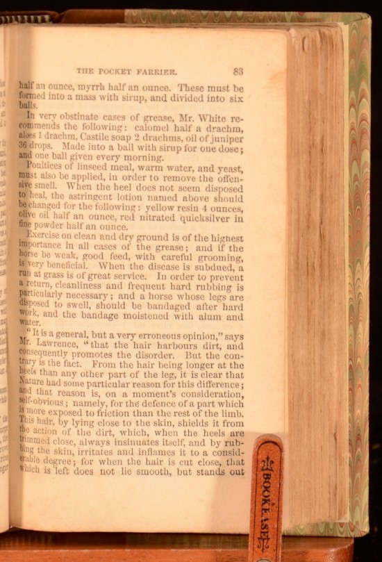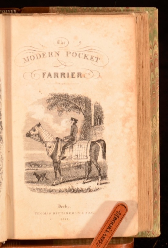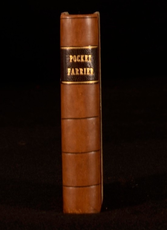 Click here to see our other books! The Modern Pocket Farrier Annoymous 1844 Richardson & Son : London 5" by 3" 324pp SUMMARY A very scarce copy of this guide for farriers. Illustrated,Leather Binding,Very Scarce Overall Condition: Very Good Indeed This book weighs 0.5 KG when packed UK Postage: £ 3.99 US Postage: £ 15.99 EU Postage : £ 13.99 European Postage: £ 14.99 Asia Postage: £ 18.99 Worldwide Postage: £ 19.99 DESCRIPTION In an attractive half calf binding. 'A treatise on the veterinary art; containing the materia medica and pharmacopoeia. By a Practical Farrier'. With a frontispiece. An interesting insight in the equestrian care from the mid-19th century, ideal for those with an interest in horses. CONDITION In a quarter calf binding with marbled boards. Externally, excellent with just some slight shelfwear. Internally, firmly bound. Pages bright with some occasional spotting. Overall Condition: Very Good Indeed GLOSSARY OF TERMS Overall Condition (Dustwrapper condition rating is shown after that for the book itself, where a dustwrapper is present) Fine - Very well preserved copy showing very little wear Very Good Indeed - Only one or two minor faults, really a very attractive copy Very Good - Quite a wide term meaning no major faults but probably several smaller ones often expected given the age of the book, but still a respectable copy Good - Meaning not very good. Some more serious faults as will be described in the condition report under 'condition' Good Only - Meaning one or more faults that could really do with repair Fair - As with good only above but with other faults leaving a compromised copy even after repair Poor - Really bad and possibly seriously incomplete. We only sell books in this condition where their rarity or value makes them attractive none the less. Major defects will be described. GUARANTEE We offer a full money back guarantee on our descriptions. Please ask for details and conditions. We prefer PAYPAL. If you pay via PAYPAL we will post the item off the same or the next working day with the postage you have selected. Please note we cannot accept USD cheques