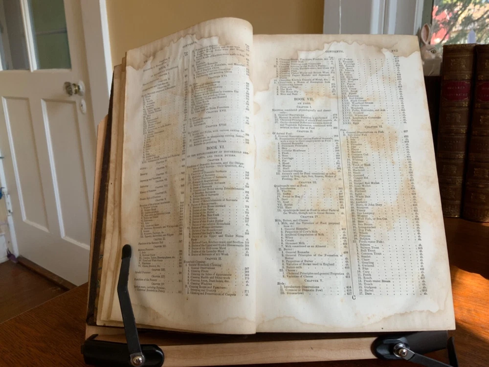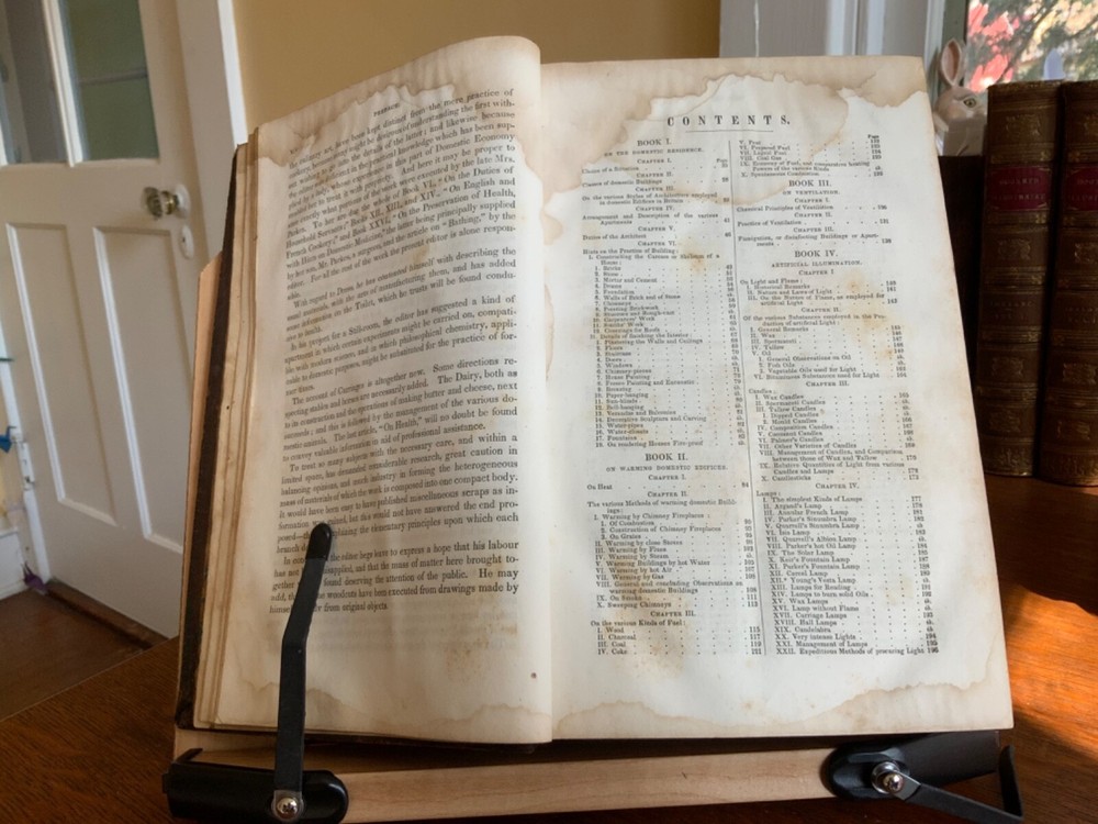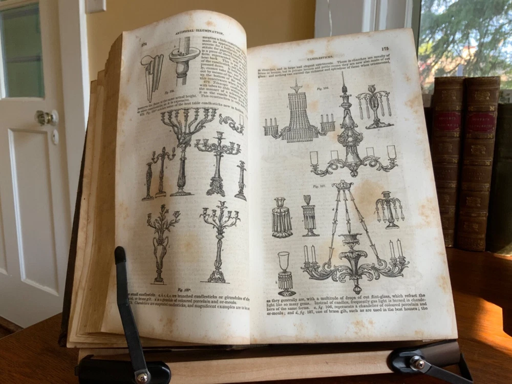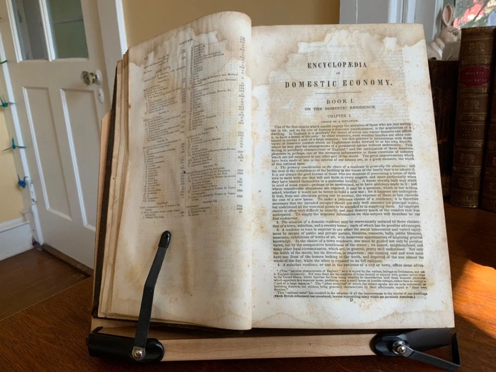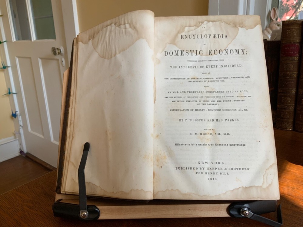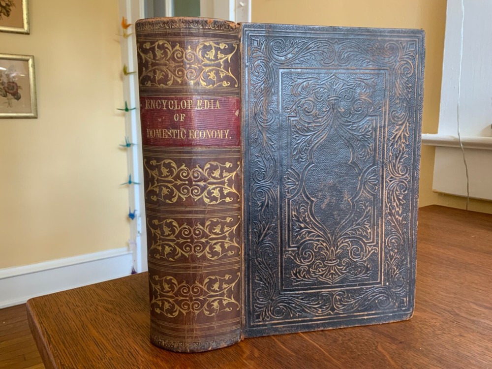An Encyclopaedia of Domestic Economy: Comprising Such Subjects as are Most Immediately Connected With Housekeeping: As, the Construction of Domestic Edifices, with the Modes of Warming, Ventilating, and Lighting Them; a Description of the Various Articles of Furniture with the Nature of Their Materials; Duties of Servants; a General Account of the Animals and Vegetable Substances Used as Food, and the Methods of Preserving and Preparing Them by Cooking; Making Bread; the Chemical Nature and the Preparation of all Kinds of Fermented Liquors used as beverage; Materials Employed in Dress and the Toilette; Business of the Laundry; Description of the Various Wheel-Carriages; Preservation of Health; Domestic Medicine, &c. &c. By T. Webster and Mrs. Parkes, Edited by D.M. Reese, A.M., M.D. Illustrated with nearly One Thousand Engravings, Published by Harper & Brothers, New York, 1848, 1238 pp, blind stamped full leather, 9.5 x 6.25”, thick 8vo. In as-is condition. Well-loved. Moderate wear to extremities with scuffing along edges and corners. Red rot present at edges with minor scuffing at surface. Spine slightly abraded with creasing and light scuffing. Head and tail chipped slightly with 1” crack at front joint. Boards scuffed overall. All edges marbled, albeit faded. Marbled end papers lightly toned, free of ownership. Heavy foxing to end papers with irregular toning. Dark dampness staining persists throughout the first 115 pages at top and bottom margins. Consistent heavier foxing throughout entire text block. Free of known marginalia. Rippling present. Binding intact. A reading copy. Please see photos. An immensely detailed encyclopaedia guiding the reader on the proper running of a Victorian household.Offering a fascinating insight into the Victorian home, written at a time when such manuals were essential for every home and housekeeper. Later American edition. With topics including building, heating and lighting a house, furnishings, food, wine, bread making, medicine and much more. Includes detailed illustrations of decorative objects for the home. COLM1848BFGX-923