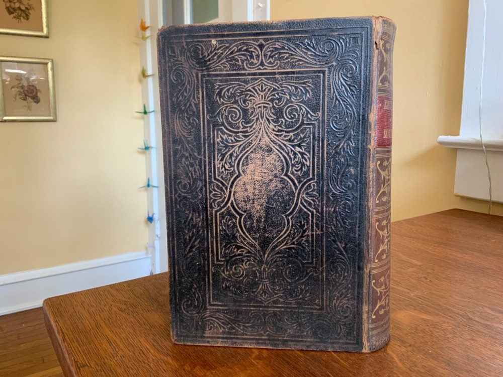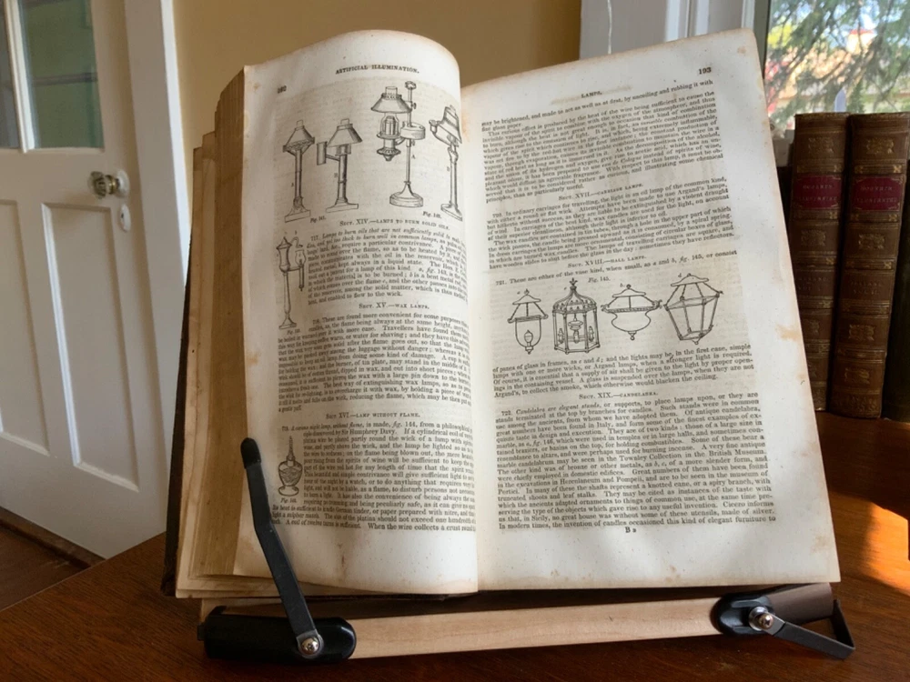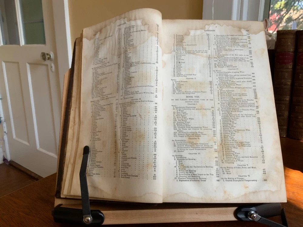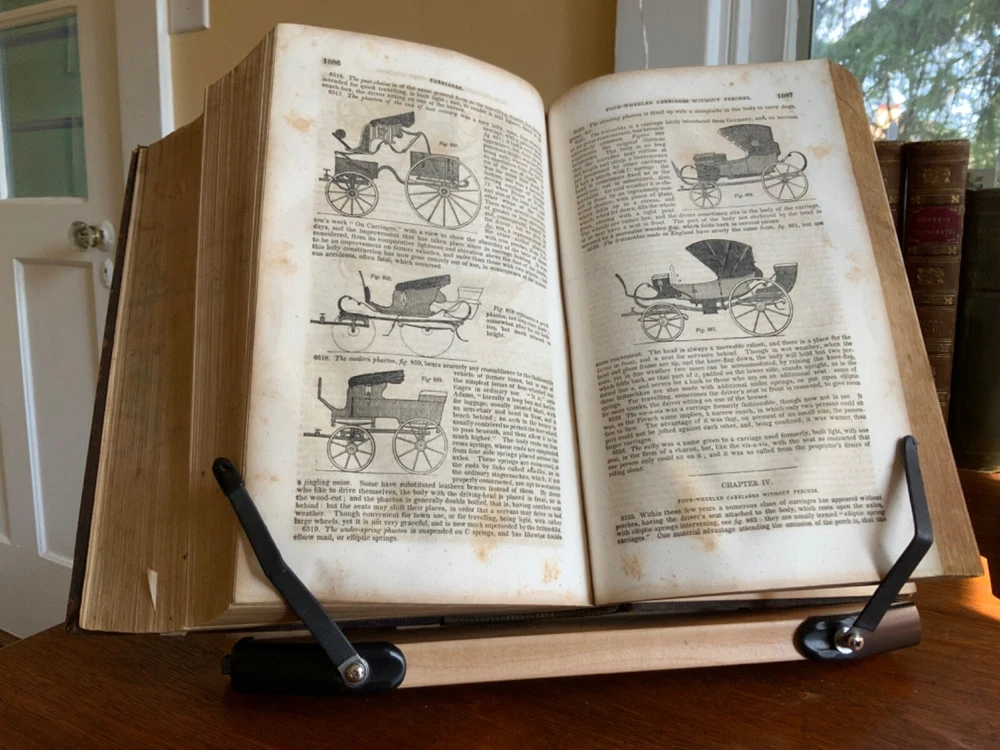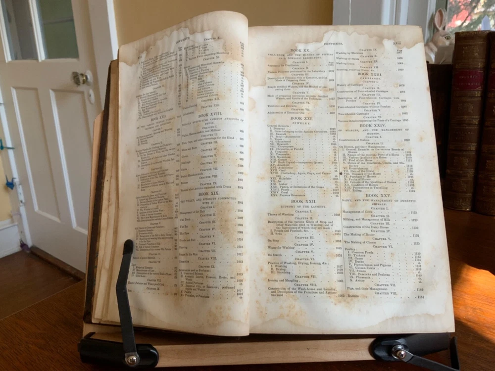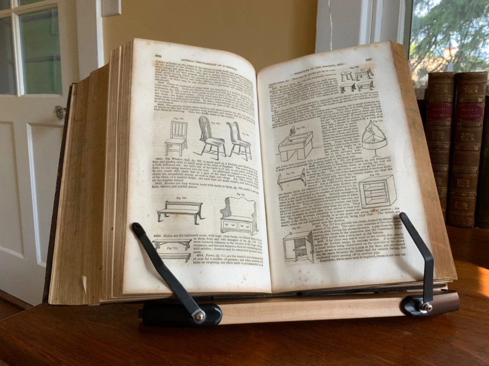 An Encyclopaedia of Domestic Economy: Comprising Such Subjects as are Most Immediately Connected With Housekeeping: As, the Construction of Domestic Edifices, with the Modes of Warming, Ventilating, and Lighting Them; a Description of the Various Articles of Furniture with the Nature of Their Materials; Duties of Servants; a General Account of the Animals and Vegetable Substances Used as Food, and the Methods of Preserving and Preparing Them by Cooking; Making Bread; the Chemical Nature and the Preparation of all Kinds of Fermented Liquors used as beverage; Materials Employed in Dress and the Toilette; Business of the Laundry; Description of the Various Wheel-Carriages; Preservation of Health; Domestic Medicine, &c. &c. By T. Webster and Mrs. Parkes, Edited by D.M. Reese, A.M., M.D. Illustrated with nearly One Thousand Engravings, Published by Harper & Brothers, New York, 1848, 1238 pp, blind stamped full leather, 9.5 x 6.25”, thick 8vo. In as-is condition. Well-loved. Moderate wear to extremities with scuffing along edges and corners. Red rot present at edges with minor scuffing at surface. Spine slightly abraded with creasing and light scuffing. Head and tail chipped slightly with 1” crack at front joint. Boards scuffed overall. All edges marbled, albeit faded. Marbled end papers lightly toned, free of ownership. Heavy foxing to end papers with irregular toning. Dark dampness staining persists throughout the first 115 pages at top and bottom margins. Consistent heavier foxing throughout entire text block. Free of known marginalia. Rippling present. Binding intact. A reading copy. Please see photos. An immensely detailed encyclopaedia guiding the reader on the proper running of a Victorian household.Offering a fascinating insight into the Victorian home, written at a time when such manuals were essential for every home and housekeeper. Later American edition. With topics including building, heating and lighting a house, furnishings, food, wine, bread making, medicine and much more. Includes detailed illustrations of decorative objects for the home. COLM1848BFGX-923
