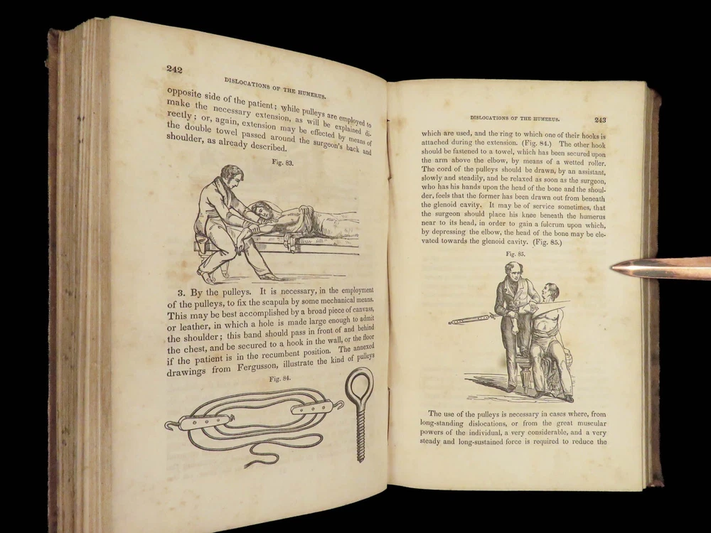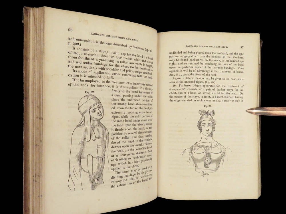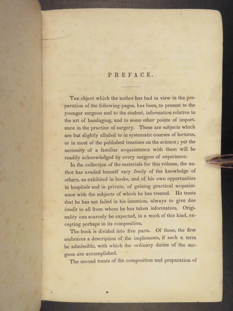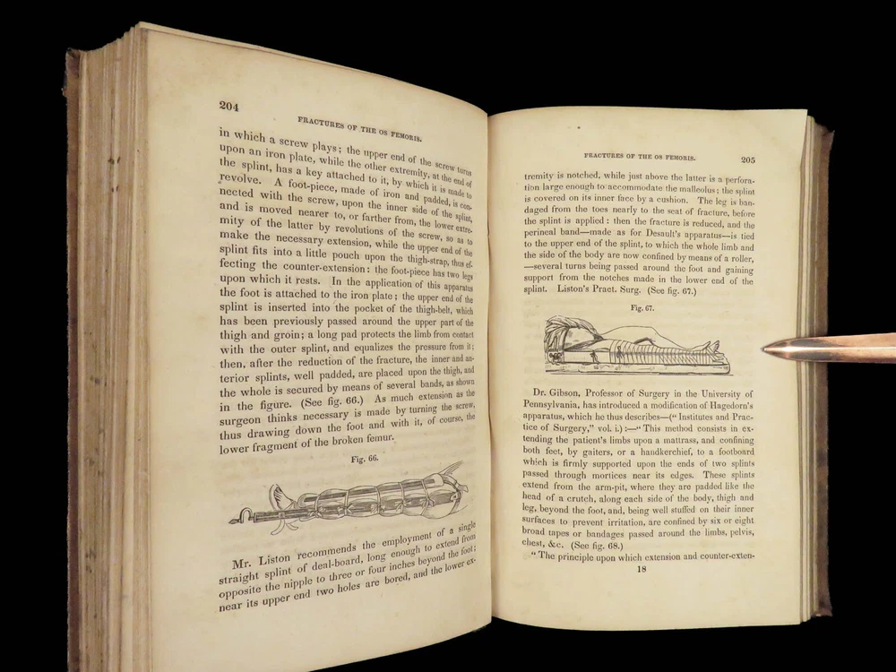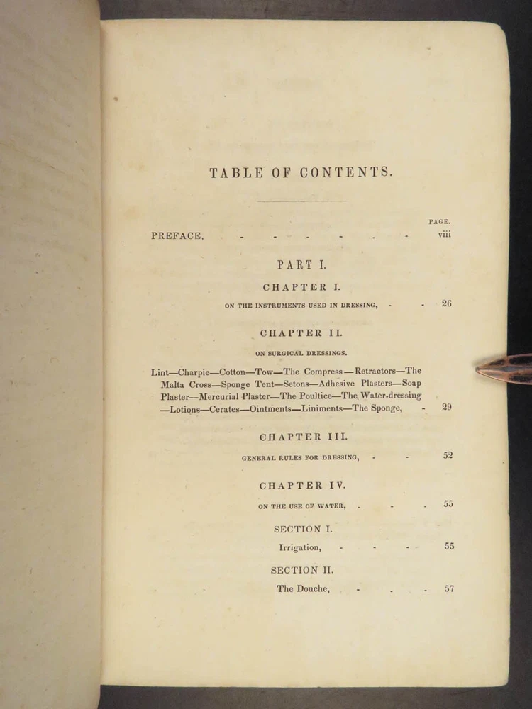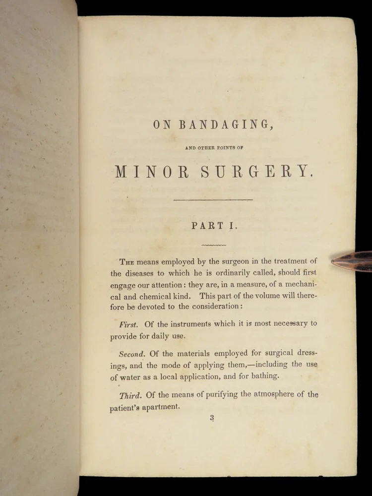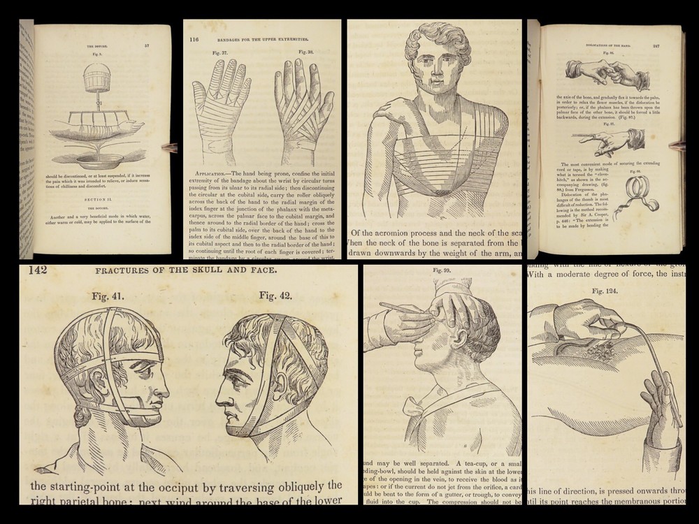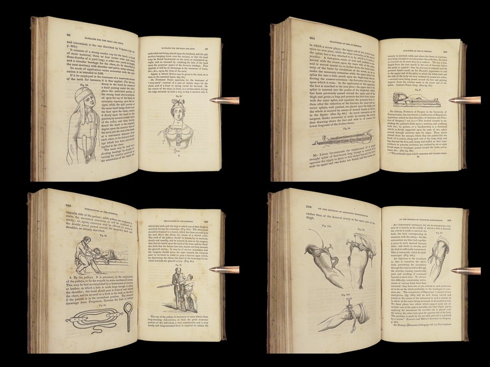 1848 Bandaging & Surgery 1 ed Operations pre Civil War Blood Medicine Sargent Sargent’s ‘On Bandaging and Other Operations of Minor Surgery’ is a practical field guide to surgical and medical practices in the Civil War. Sargent’s book includes: · Instruments · Surgical Dressings and their rules · Water · The Douche · Bandages and their application · Fractures and setting them · Dislocations · Bloodletting · Phlebotomy · Arteriotemy · Counter Irritations · Arresting Hemmorage · Catheters · Injections · Pain Relief · And more! This rare 1848 1 st edition includes black and white illustrations throughout. Item number: #24862 Price: $499 SARGENT, F. W. Bandaging and other operations of minor surgery Philadelphia: Blanchard and Lea, 1848. 1 st edition Details : · Collation: Complete with all pages o xxvii, [1], 25-379, [5] o 128 illustrated figures throughout · References: Rutkow, ‘The History of Surgery in the United States,’ GS25 · Language: English · Binding: Leather; tight and secure · Size : ~8in X 5.25in (20cm x 13cm) Our Guarantee: Very Fast. Very Safe. Free Shipping Worldwide. Customer satisfaction is our priority! Notify us with 7 days of receiving, and we will offer a full refund without reservation! 24862
