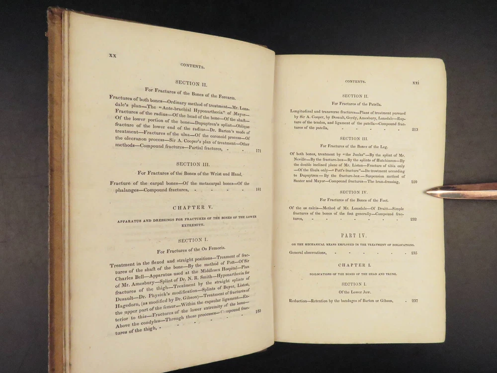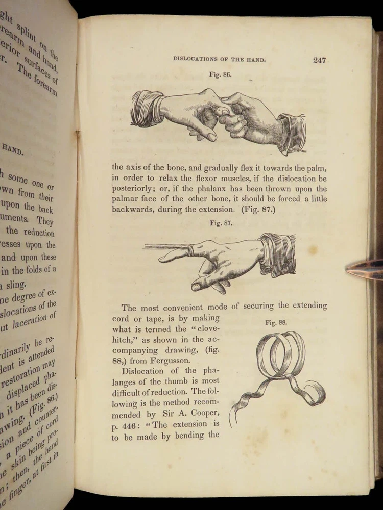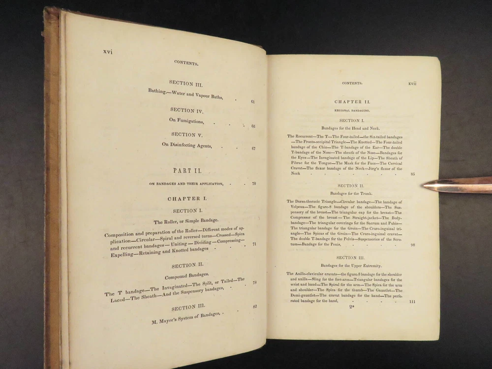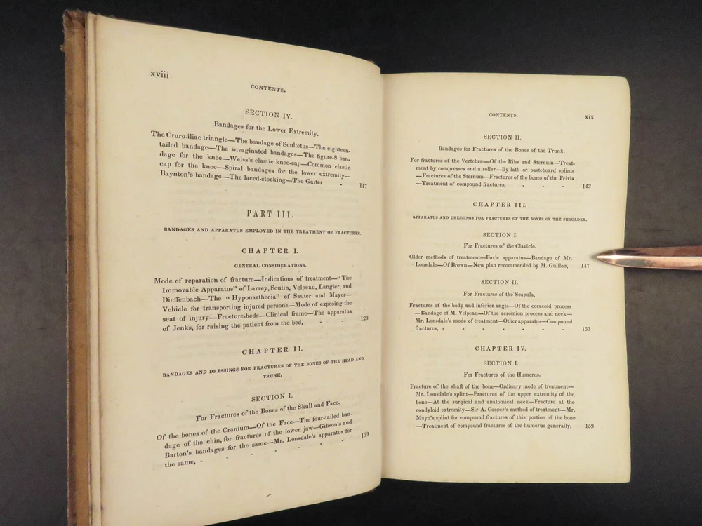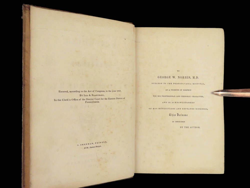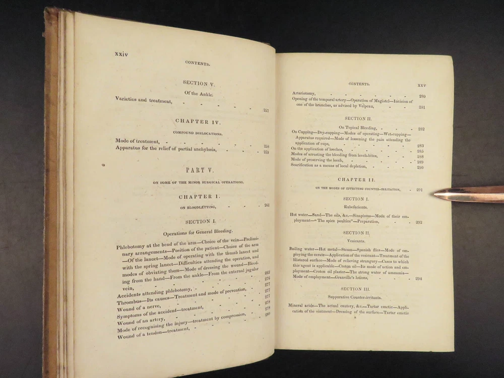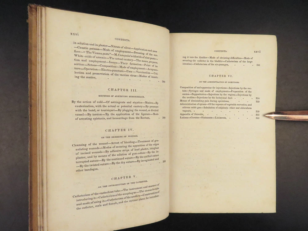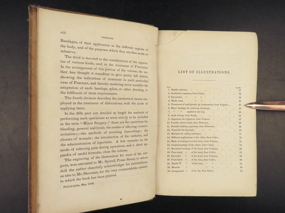 1848 Bandaging & Surgery 1 ed Operations pre Civil War Blood Medicine Sargent Sargent’s ‘On Bandaging and Other Operations of Minor Surgery’ is a practical field guide to surgical and medical practices in the Civil War. Sargent’s book includes: · Instruments · Surgical Dressings and their rules · Water · The Douche · Bandages and their application · Fractures and setting them · Dislocations · Bloodletting · Phlebotomy · Arteriotemy · Counter Irritations · Arresting Hemmorage · Catheters · Injections · Pain Relief · And more! This rare 1848 1 st edition includes black and white illustrations throughout. Item number: #24862 Price: $499 SARGENT, F. W. Bandaging and other operations of minor surgery Philadelphia: Blanchard and Lea, 1848. 1 st edition Details : · Collation: Complete with all pages o xxvii, [1], 25-379, [5] o 128 illustrated figures throughout · References: Rutkow, ‘The History of Surgery in the United States,’ GS25 · Language: English · Binding: Leather; tight and secure · Size : ~8in X 5.25in (20cm x 13cm) Our Guarantee: Very Fast. Very Safe. Free Shipping Worldwide. Customer satisfaction is our priority! Notify us with 7 days of receiving, and we will offer a full refund without reservation! 24862