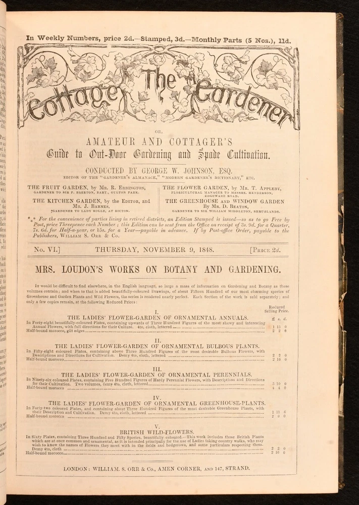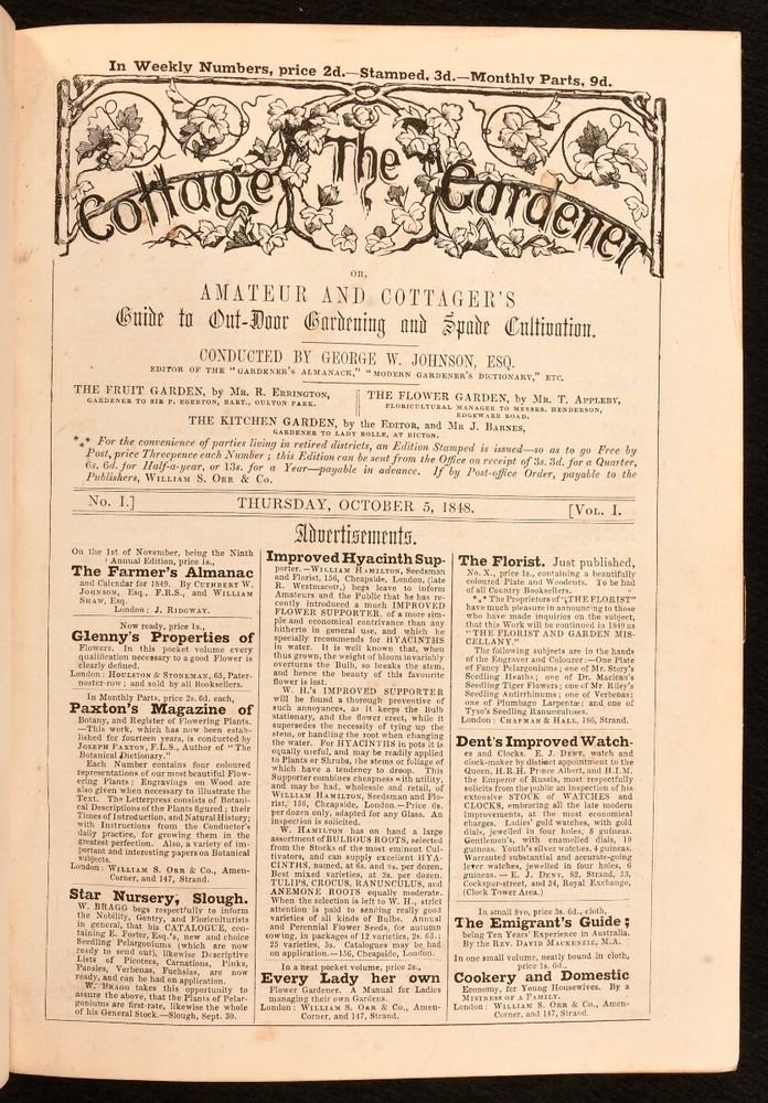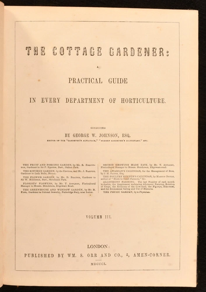 Click here to see our other books! The Cottage Gardener or, Amateur Gardener's Guide to Out-Door Gardening and Spade Cultivation George W. Johnson 1848-1850 William S. Orr & Co. : London 10.5" by 7.5" 312; 348, (2); 360pp. SUMMARY A smart three volume set of George W. Johnson's sweeping and detailed gardening guide, with illustrations. Illustrated,Leather Binding,Original Binding,Publishers' Original Binding Overall Condition: Very Good This book weighs 2 KG when packed UK Postage: £ 3.99 US Postage: £ 29.99 EU Postage : £ 21.99 European Postage: £ 23.99 Asia Postage: £ 37.99 Worldwide Postage: £ 38.99 DESCRIPTION Three volumes. Containing issue numbers one to seventy-eight. Illustrated with woodcuts throughout. A weekly periodical devoted to the advancement and development of outdoor gardening in Great Britain, with much information and hints on improving the culture of crops and the use of spades. Including articles on: annuals, bulbs, perennials, greenhouse plants, wildflowers, and more. Edited by George William Johnson, a British writer on gardening. CONDITION In the original half black crushed morocco with marbled boards. Externally, smart with rubbing and minor bumping to the extremities. Light fading to the spine and the board edges with the odd mark to the boards. Minor loss of the paper covering the boards to the rear board of volume one and the front board of volume two. Internally, firmly bound. Pages are very bright with the odd small spot. Light age toning and further spotting to the endpapers. Residue from silver sticker between pages 124 and 125 of volume one. Overall Condition: Very Good GLOSSARY OF TERMS Overall Condition (Dustwrapper condition rating is shown after that for the book itself, where a dustwrapper is present) Fine - Very well preserved copy showing very little wear Very Good Indeed - Only one or two minor faults, really a very attractive copy Very Good - Quite a wide term meaning no major faults but probably several smaller ones often expected given the age of the book, but still a respectable copy Good - Meaning not very good. Some more serious faults as will be described in the condition report under 'condition' Good Only - Meaning one or more faults that could really do with repair Fair - As with good only above but with other faults leaving a compromised copy even after repair Poor - Really bad and possibly seriously incomplete. We only sell books in this condition where their rarity or value makes them attractive none the less. Major defects will be described. GUARANTEE We offer a full money back guarantee on our descriptions. Please ask for details and conditions. We prefer PAYPAL. If you pay via PAYPAL we will post the item off the same or the next working day with the postage you have selected. Please note we cannot accept USD cheques