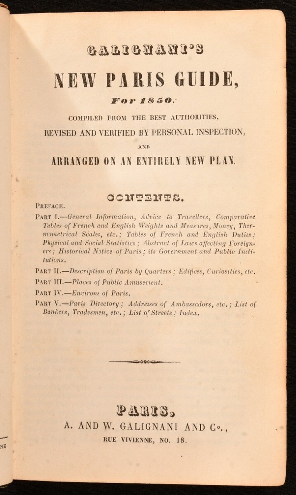 Click here to see our other books! Galignani's New Paris Guide for 1850 J. A. Galignani; W. Galignani 1850 A. and W. Galignani and Co. : Paris 6.5" by 4" ix, 626, xiipp. SUMMARY A scarce copy of this illustrated guide to Paris from the Galignani brothers. Illustrated,Original Binding,Publishers' Original Binding,Scarce Overall Condition: Good This book weighs 0.75 KG when packed UK Postage: £ 3.99 US Postage: £ 19.99 EU Postage : £ 15.99 European Postage: £ 16.99 Asia Postage: £ 21.99 Worldwide Postage: £ 25.99 DESCRIPTION Scarce work. Illustrated with eighteen plates and two folding plans. Collated complete. A guide to Paris, France, with general information on the city, advice to travellers, money tips, historical notes, descriptions of the quarters, lists of curiosities, directories, and more. Produced by John Anthony Galignani and William Galignani, Italian-born publishers who owned a bookshop in Paris. CONDITION Bound in full green tooled calf. Externally, sound with rubbing and minor bumping to the extremities resulting in light loss. Fading to the spine with the odd mark to the boards. Small splits to the cloth to the head and tail of the spine. Internally, firmly bound. Pages are very bright with the odd small spot or handling mark. Minor age toning to the endpapers with pencil and ink inscriptions to the endpapers. Overall Condition: Good GLOSSARY OF TERMS Overall Condition (Dustwrapper condition rating is shown after that for the book itself, where a dustwrapper is present) Fine - Very well preserved copy showing very little wear Very Good Indeed - Only one or two minor faults, really a very attractive copy Very Good - Quite a wide term meaning no major faults but probably several smaller ones often expected given the age of the book, but still a respectable copy Good - Meaning not very good. Some more serious faults as will be described in the condition report under 'condition' Good Only - Meaning one or more faults that could really do with repair Fair - As with good only above but with other faults leaving a compromised copy even after repair Poor - Really bad and possibly seriously incomplete. We only sell books in this condition where their rarity or value makes them attractive none the less. Major defects will be described. GUARANTEE We offer a full money back guarantee on our descriptions. Please ask for details and conditions. We prefer PAYPAL. If you pay via PAYPAL we will post the item off the same or the next working day with the postage you have selected. Please note we cannot accept USD cheques