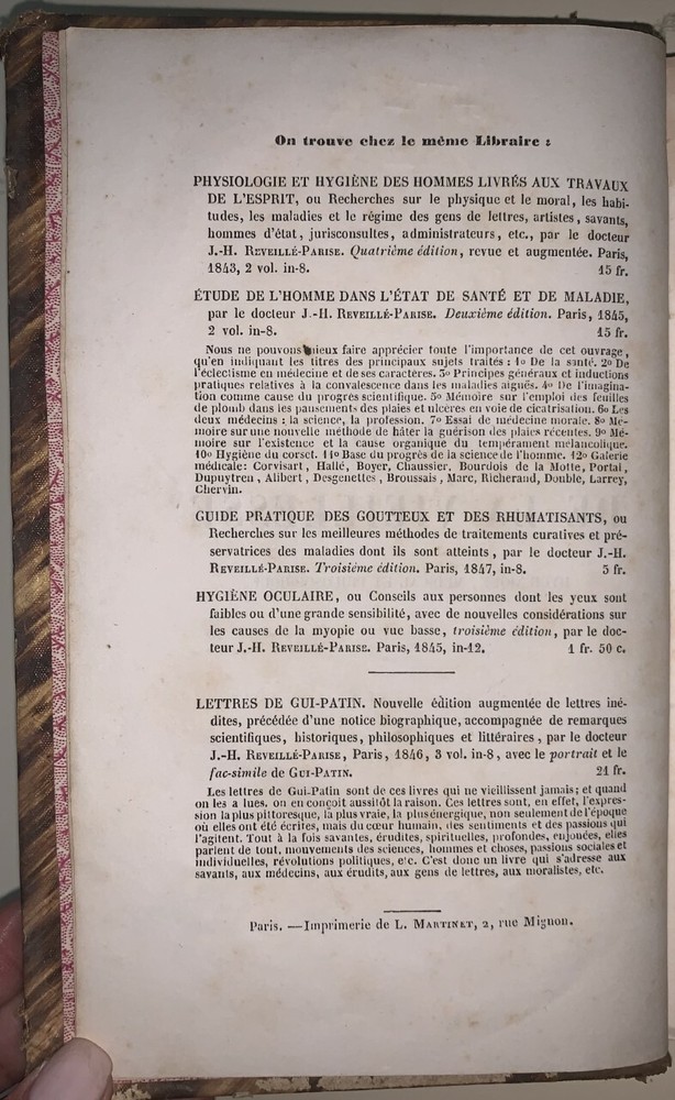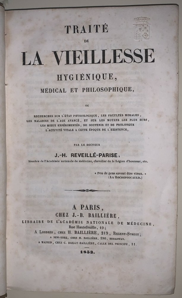 Traite de La Vieillesse Hygienique, Medical et Philosophique, ou Recherches sur L'Etat Physiologique par la Docteur J. -H. Reveille-Parise A Paris Chez J. -B. Bailliere 1853 First Edition Octavo, 488 pages, period leather over paper covered boards. Text in French. Spine detached with a large loss, now laid in. Hinges cracked, foxing, rubbing and wear, else in good condition. If you have any questions feel free to ask and don't forget to check out my other listings.