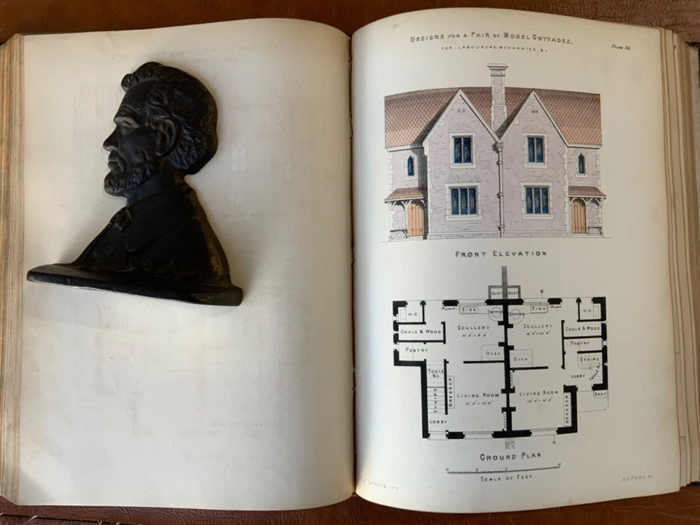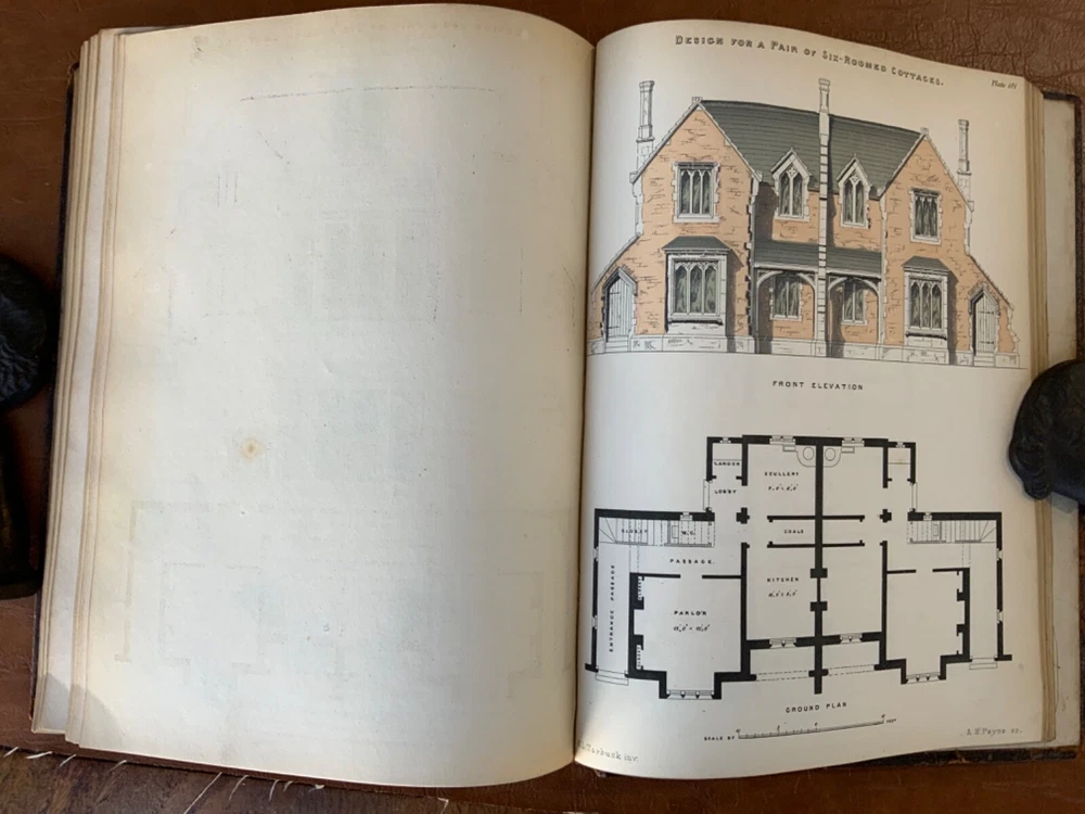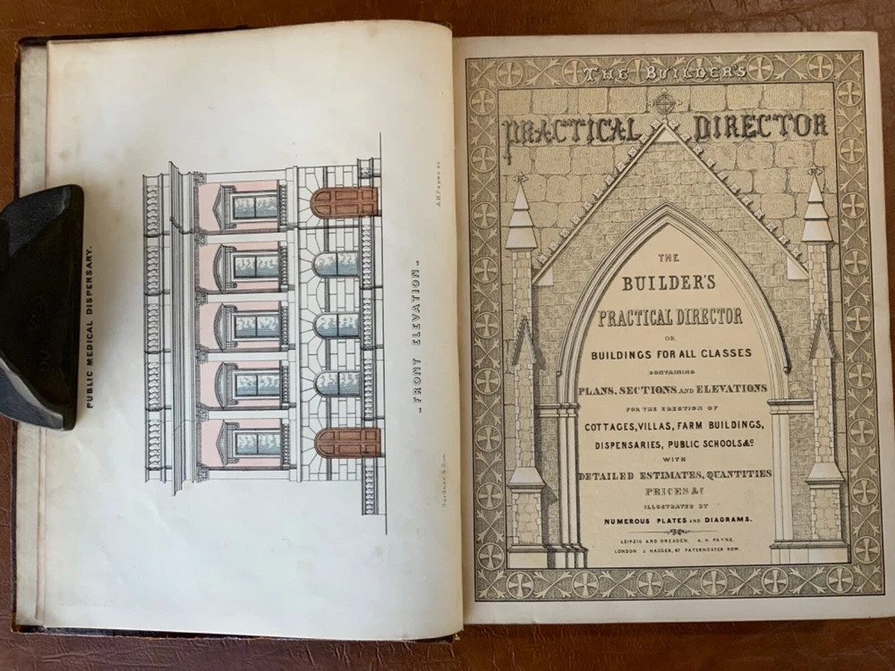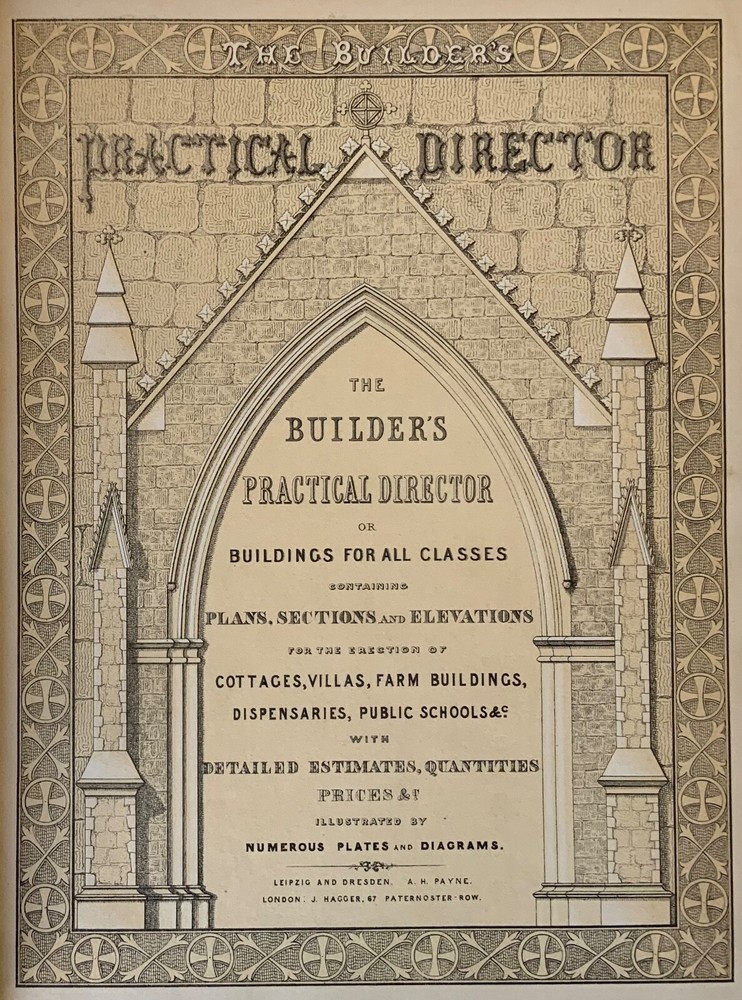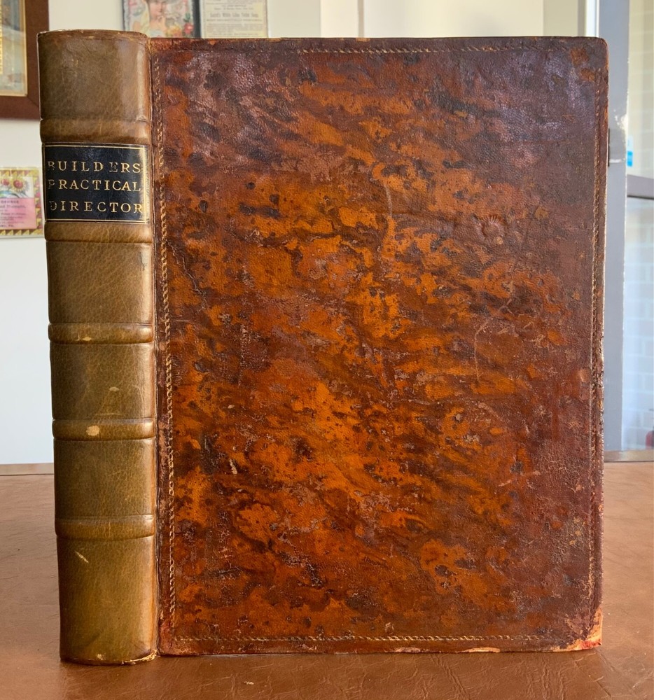 The Builder’s Practical Directory: or Buildings of all classes containing Plans, Sections and Elevations for the Erection of Cottages, Villas, Farm Buildings, Dispensaries, Public Schools &c. With Detailed estimates, Quantities, Prices &c Illustrated by Numerous Plates and Diagrams. [Edward L Tarbuck, editor]. Leipzig and Dresden: A. H. Payne; London: J Hagger. n.d.,circa 1855. First edition. 264 p +132 full-page plts. Re-backed spine & original boards. 11 x 8.25", large 8vo. In fair condition. Boards are normally scuffed at edges and worn/bumped at corners. Re-backed spine lightly rubbed at head and tail; title label intact with bright gilt lettering. Edges of text-block marbled (moderately dulled). Previous ownership bookplate found on front paste-down: "Maurice Robert des Marais." Pencil marginalia found on front end-page. Sporadic foxing throughout text-block, mostly around plates. Some sparse instances of finger-soiling or age-staining. Binding intact. Please see photos and ask questions, if any, before purchasing. Edward Lance Tarbuck (fl. 1855)was a well-known architect who edited and wrote several of the articles in this volume. As a builder’s guide, this one was a particularly practical one containing information ranging form site planning to housing estates and town-homes with cost estimates and construction details. There are some lovely hand-colored plates and extra-illustrated with two “plate 18”'s. RAREB1855BLNA - 04/19 COLA1855LNMQ - 11/24 - HKREV242