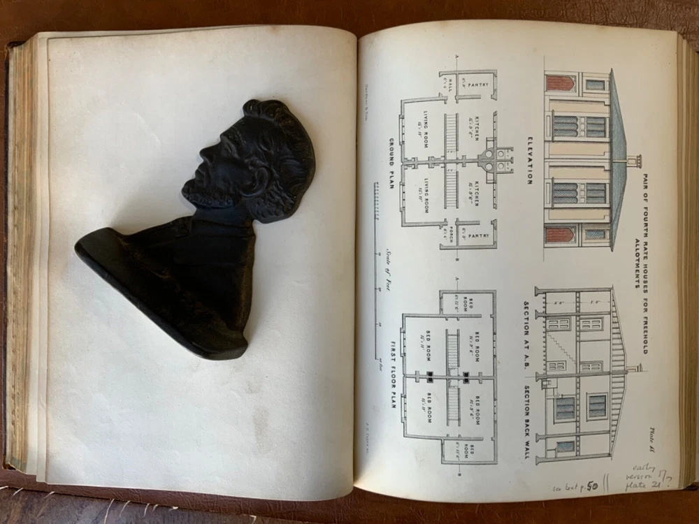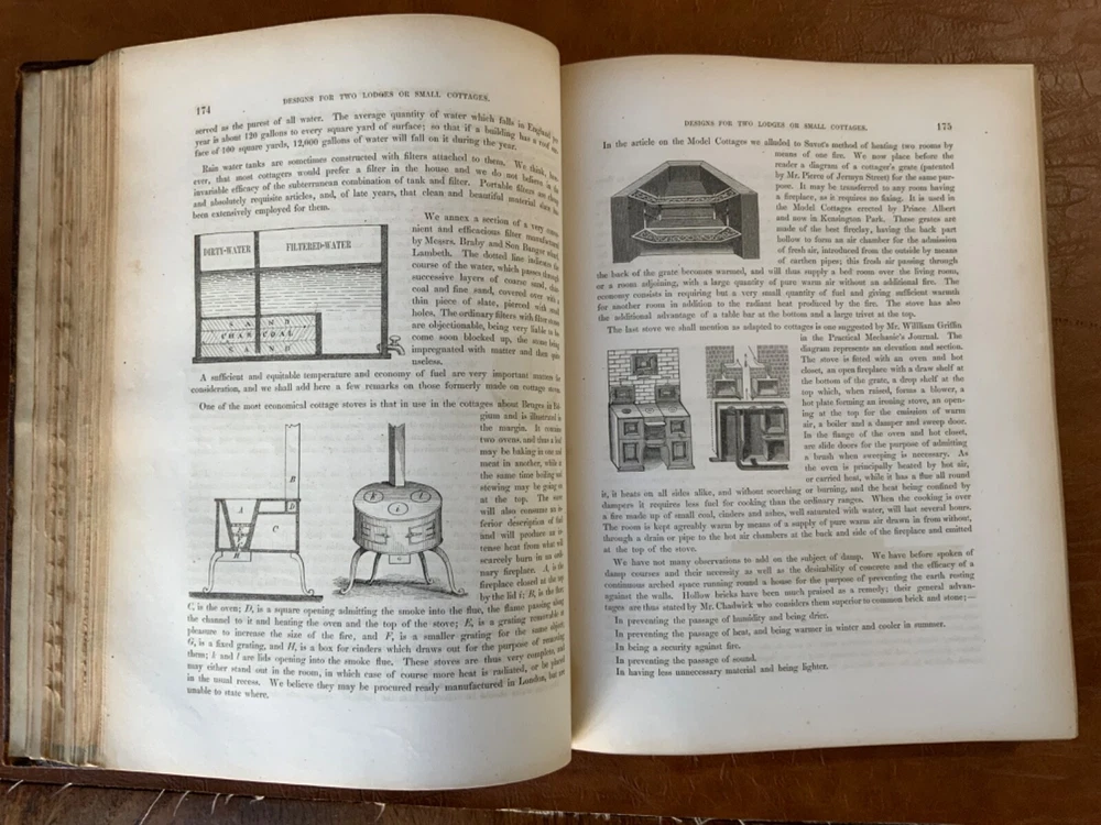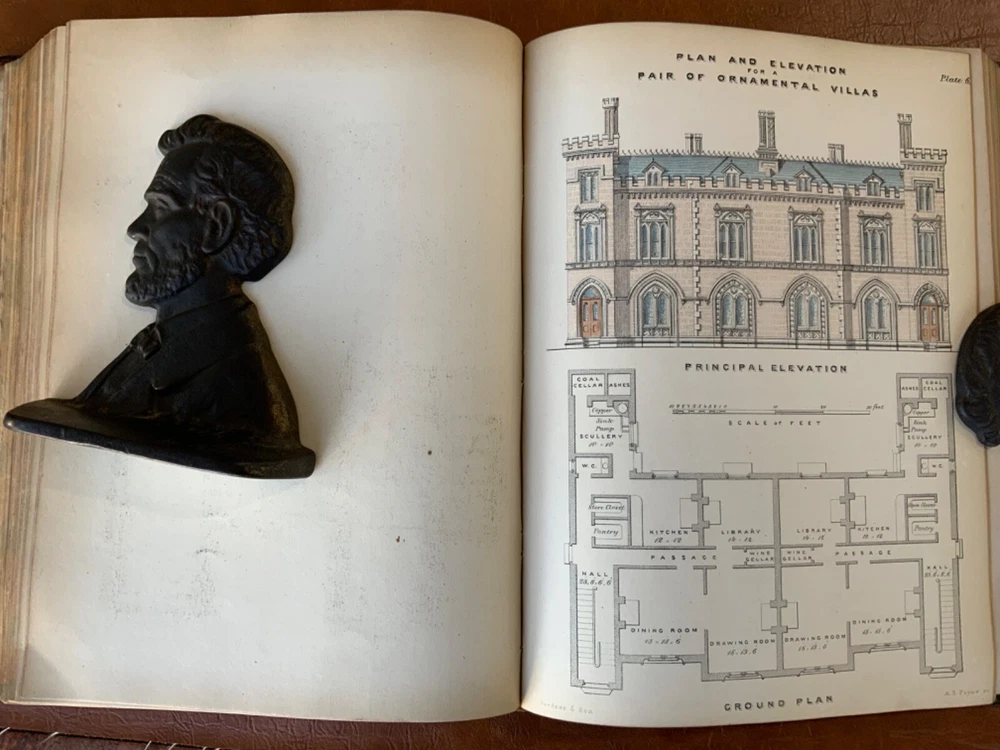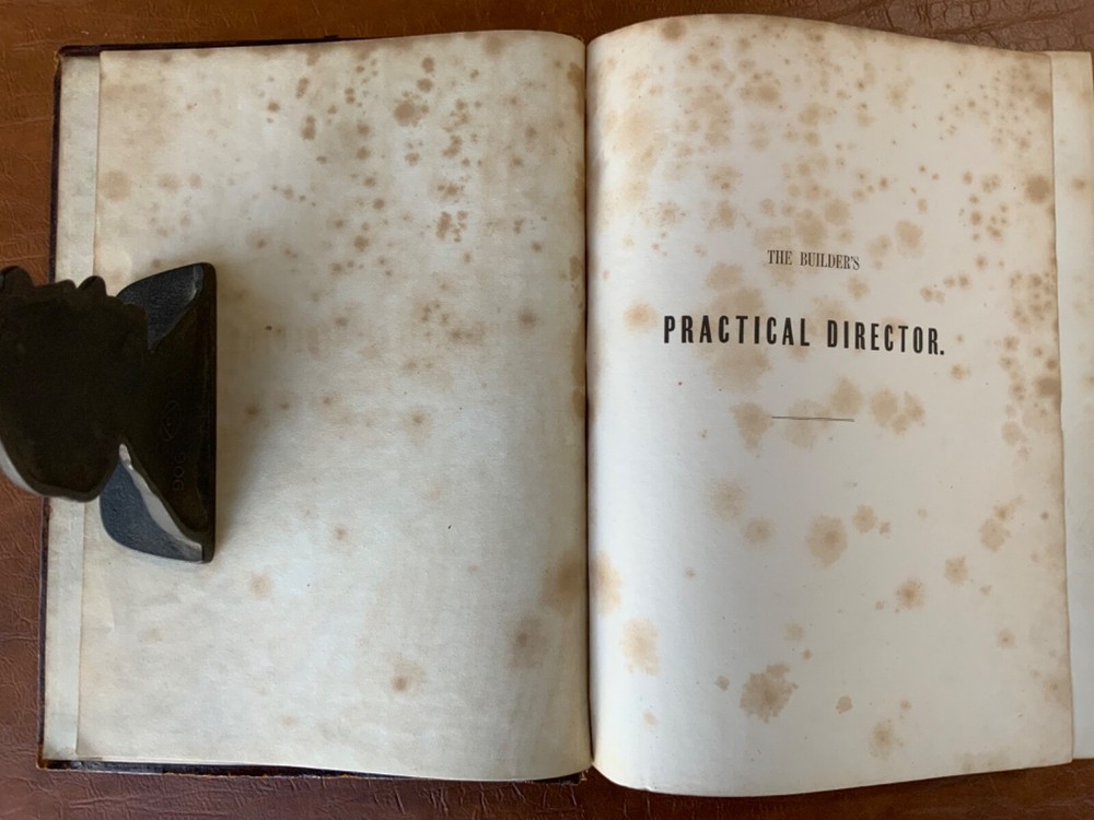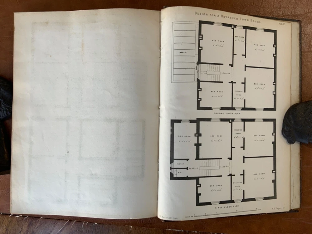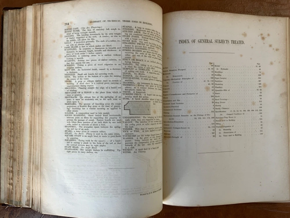 The Builder’s Practical Directory: or Buildings of all classes containing Plans, Sections and Elevations for the Erection of Cottages, Villas, Farm Buildings, Dispensaries, Public Schools &c. With Detailed estimates, Quantities, Prices &c Illustrated by Numerous Plates and Diagrams. [Edward L Tarbuck, editor]. Leipzig and Dresden: A. H. Payne; London: J Hagger. n.d.,circa 1855. First edition. 264 p +132 full-page plts. Re-backed spine & original boards. 11 x 8.25", large 8vo. In fair condition. Boards are normally scuffed at edges and worn/bumped at corners. Re-backed spine lightly rubbed at head and tail; title label intact with bright gilt lettering. Edges of text-block marbled (moderately dulled). Previous ownership bookplate found on front paste-down: "Maurice Robert des Marais." Pencil marginalia found on front end-page. Sporadic foxing throughout text-block, mostly around plates. Some sparse instances of finger-soiling or age-staining. Binding intact. Please see photos and ask questions, if any, before purchasing. Edward Lance Tarbuck (fl. 1855)was a well-known architect who edited and wrote several of the articles in this volume. As a builder’s guide, this one was a particularly practical one containing information ranging form site planning to housing estates and town-homes with cost estimates and construction details. There are some lovely hand-colored plates and extra-illustrated with two “plate 18”'s. RAREB1855BLNA - 04/19 COLA1855LNMQ - 11/24 - HKREV242